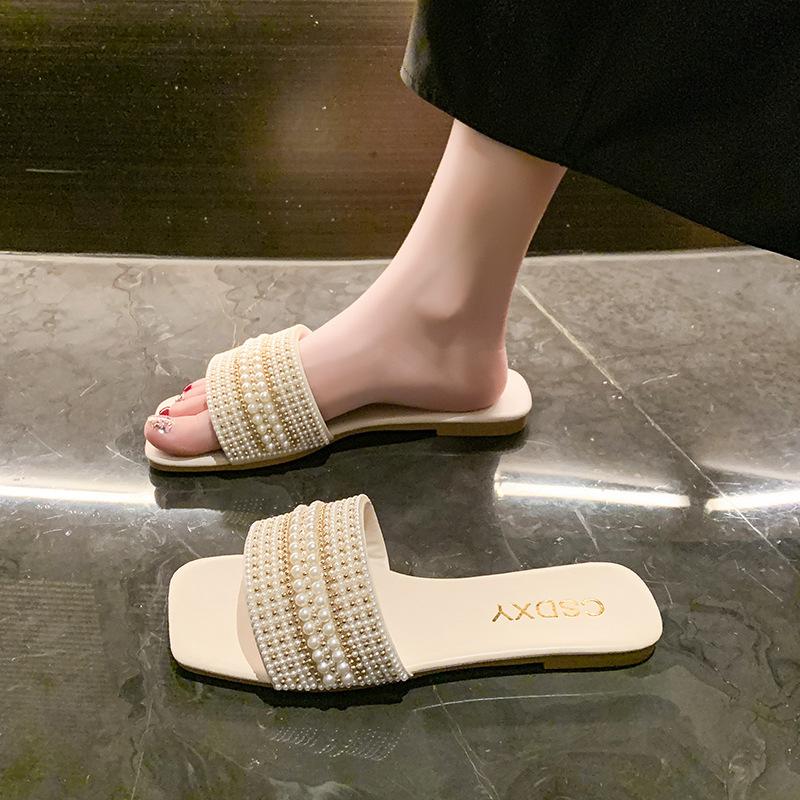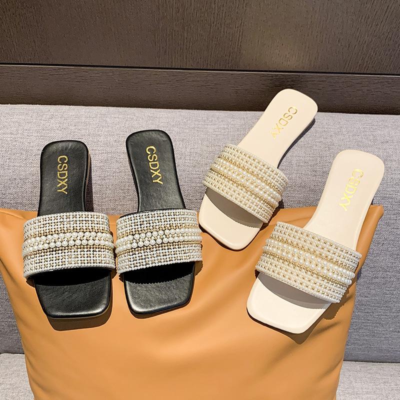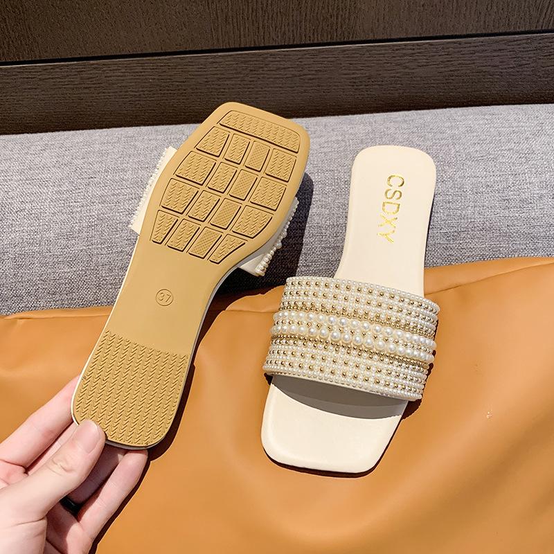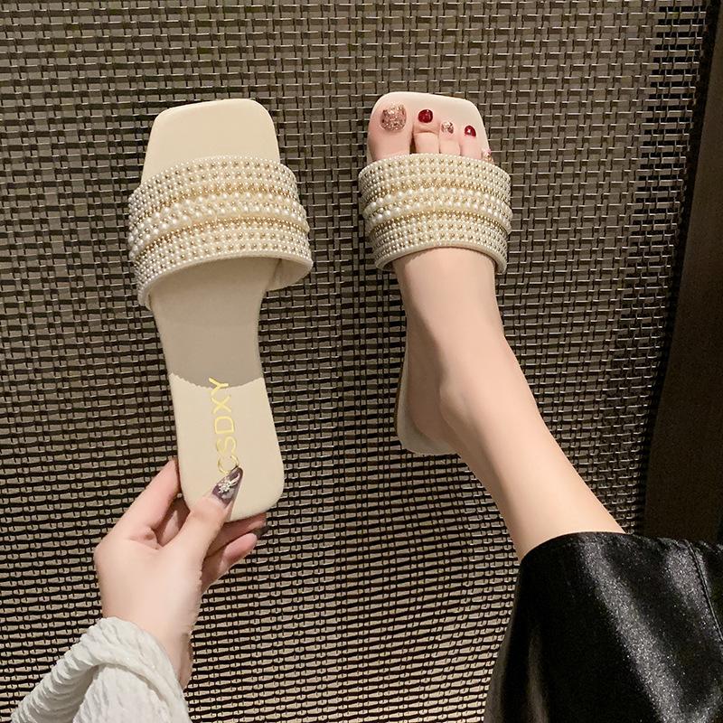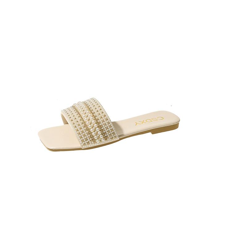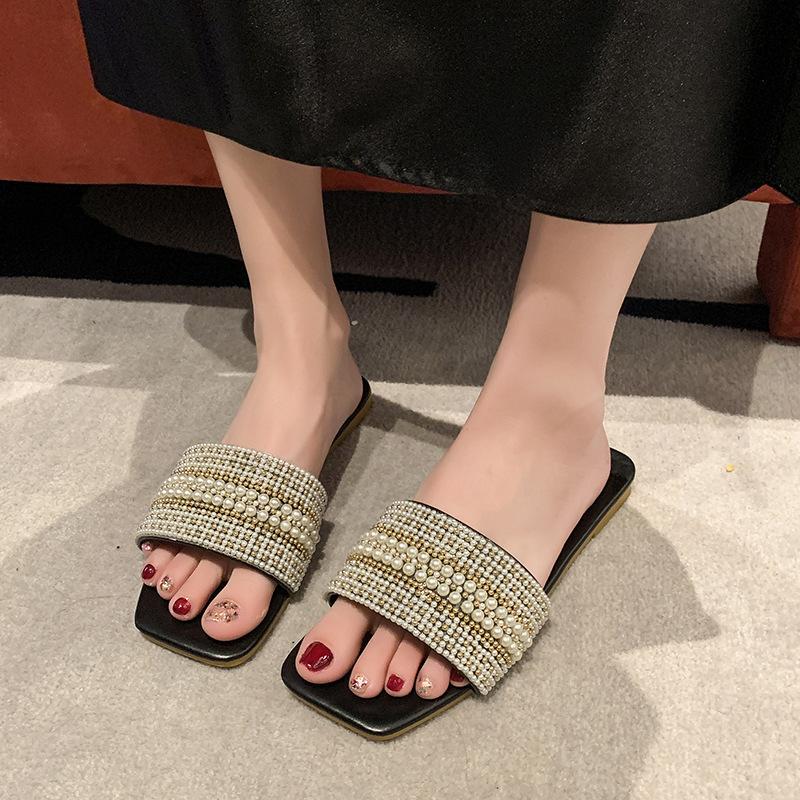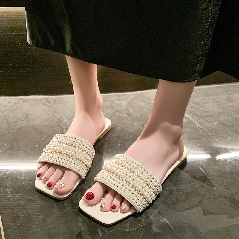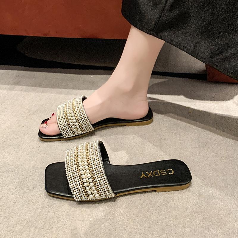 2025 Verano Nuevo Transfronterizo Talla Grande Perla Zapatillas Planas Conjunto de Mujer Punta Cuadrada Punta Abierta Diapositivas Sandalias de Moda