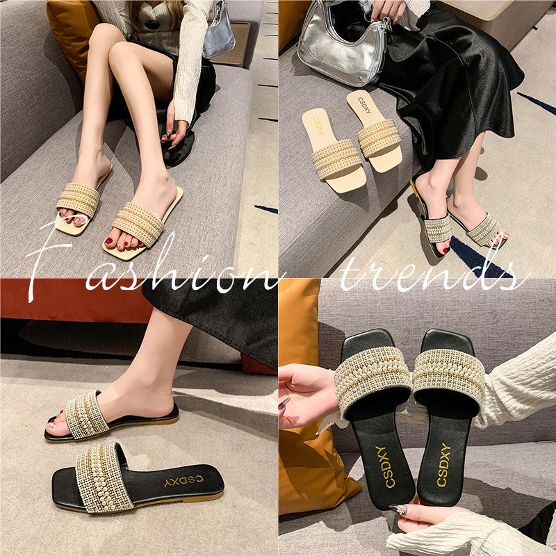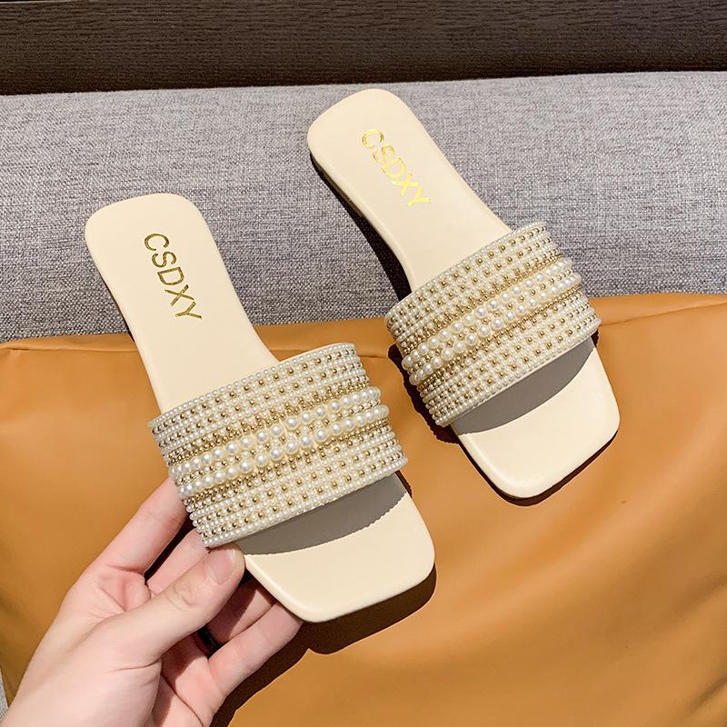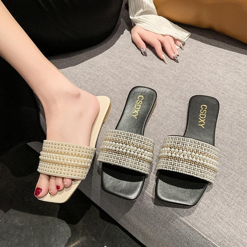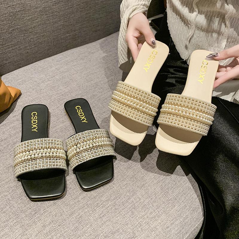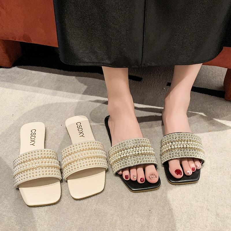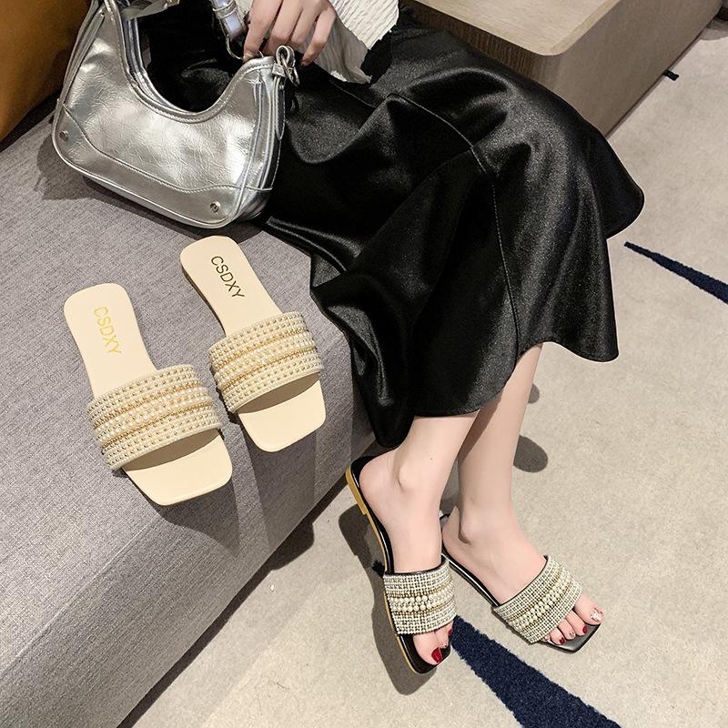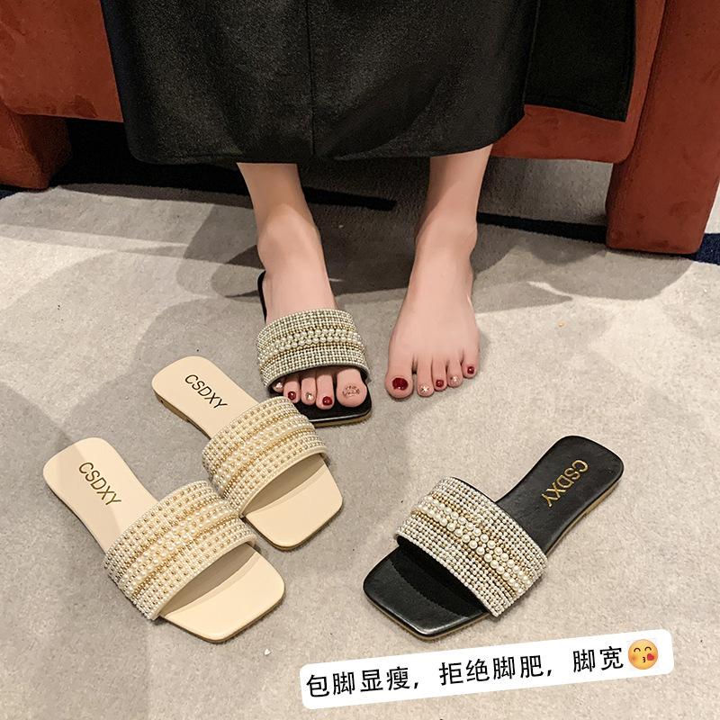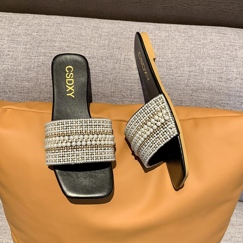 2025 Verano Nuevo Transfronterizo Talla Grande Perla Zapatillas Planas Conjunto de Mujer Punta Cuadrada Punta Abierta Diapositivas Sandalias de Moda