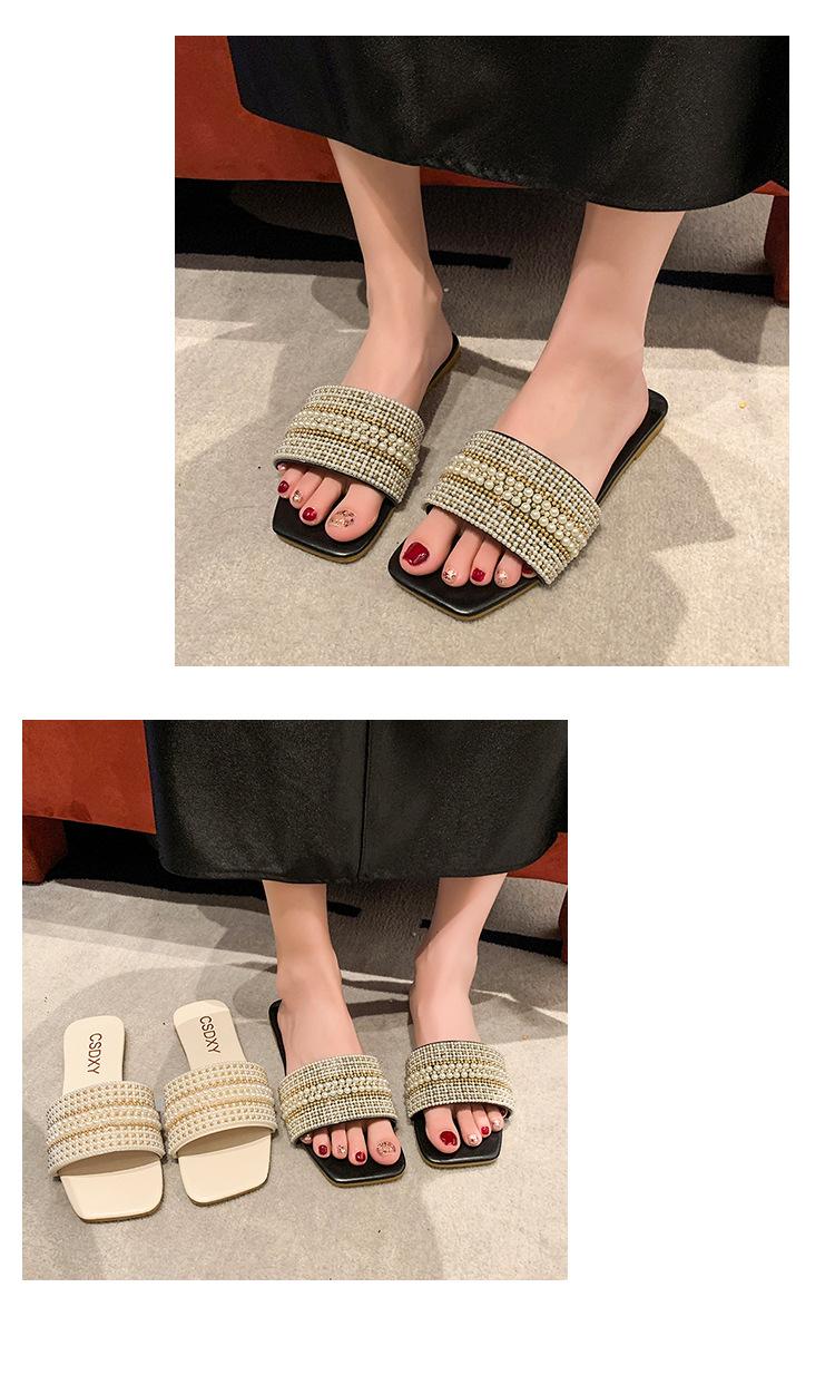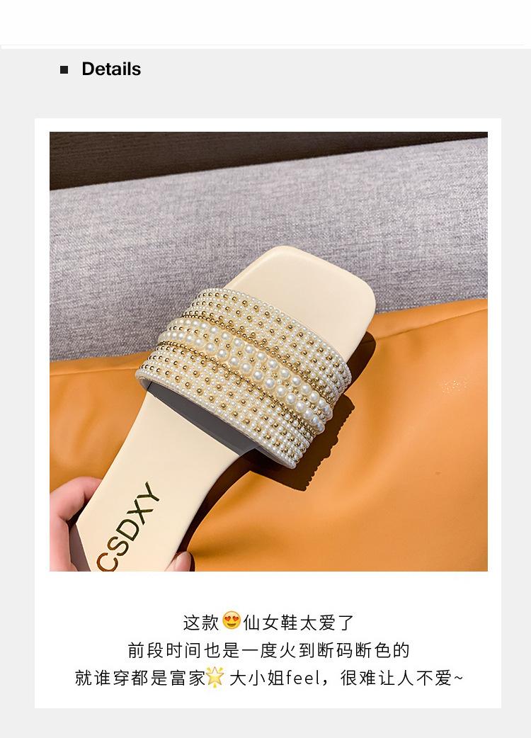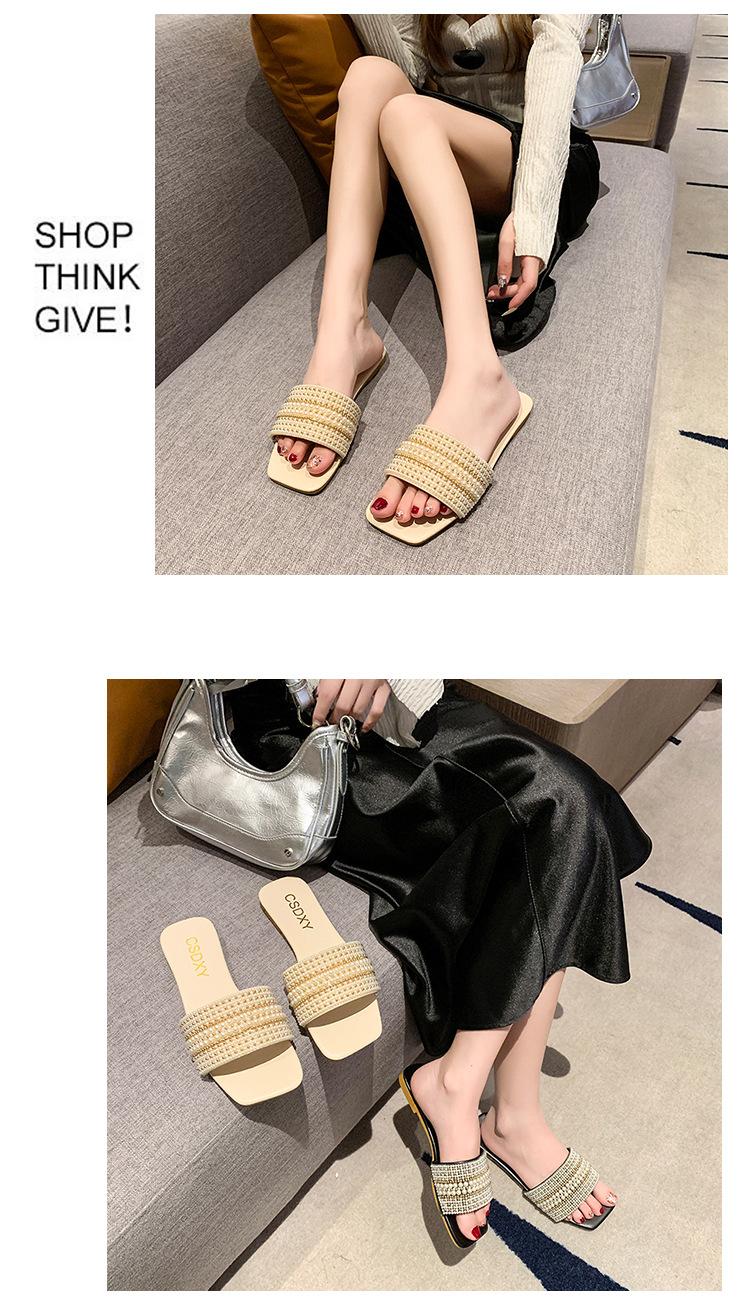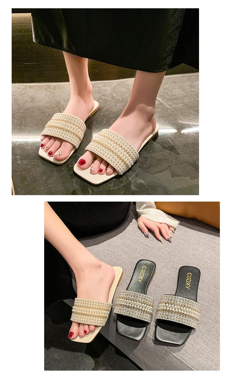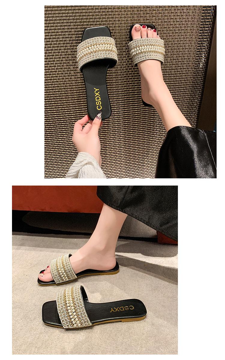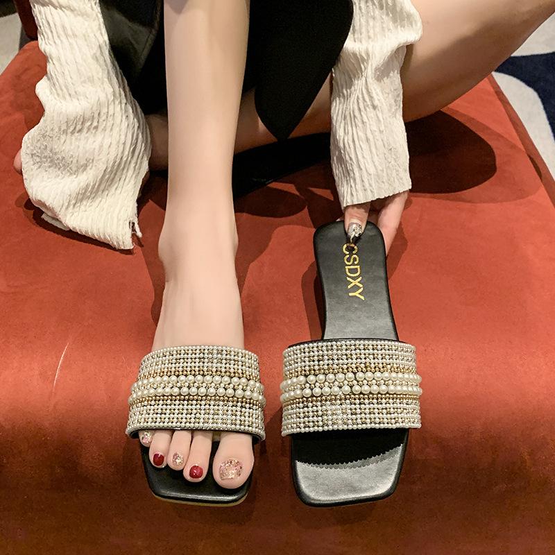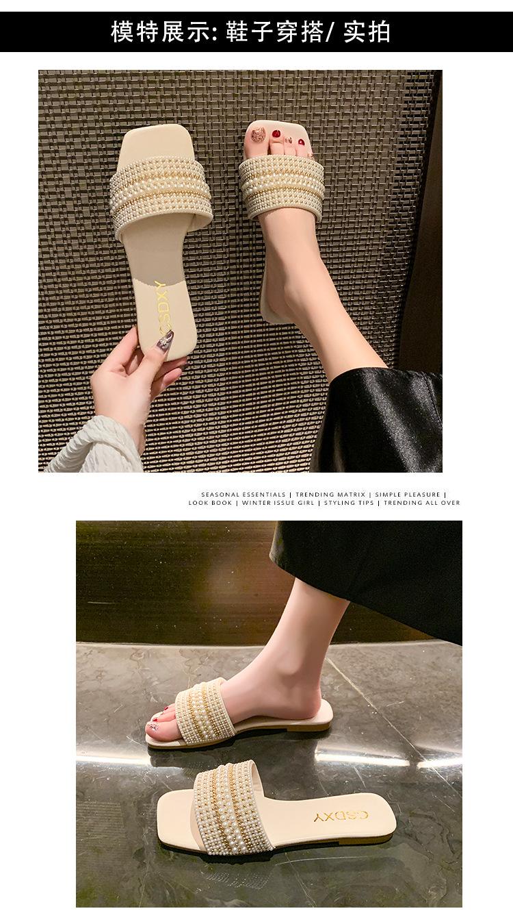 2025 Verano Nuevo Transfronterizo Talla Grande Perla Zapatillas Planas Conjunto de Mujer Punta Cuadrada Punta Abierta Diapositivas Sandalias de Moda