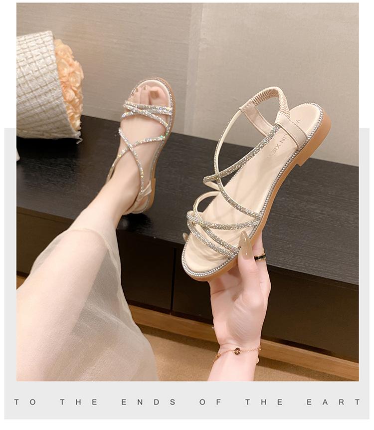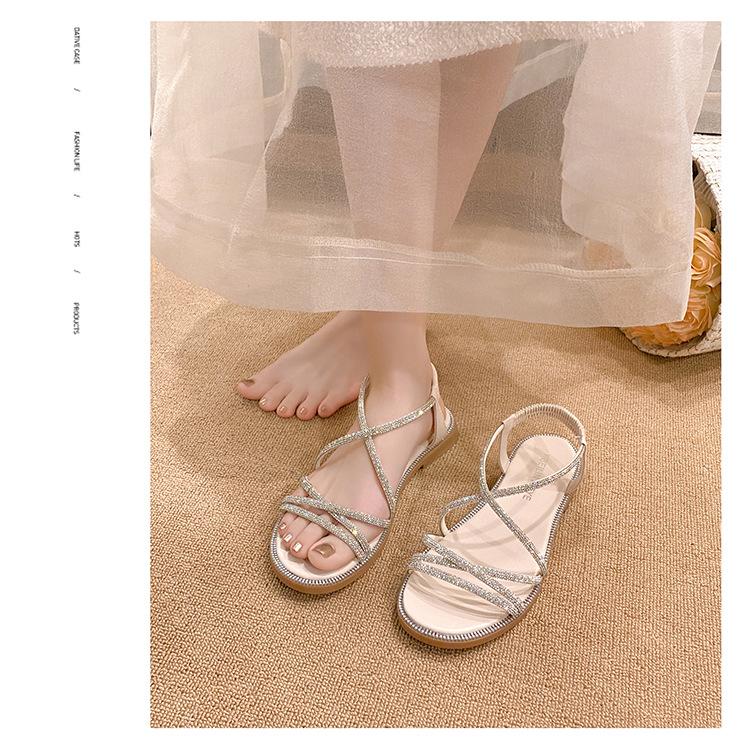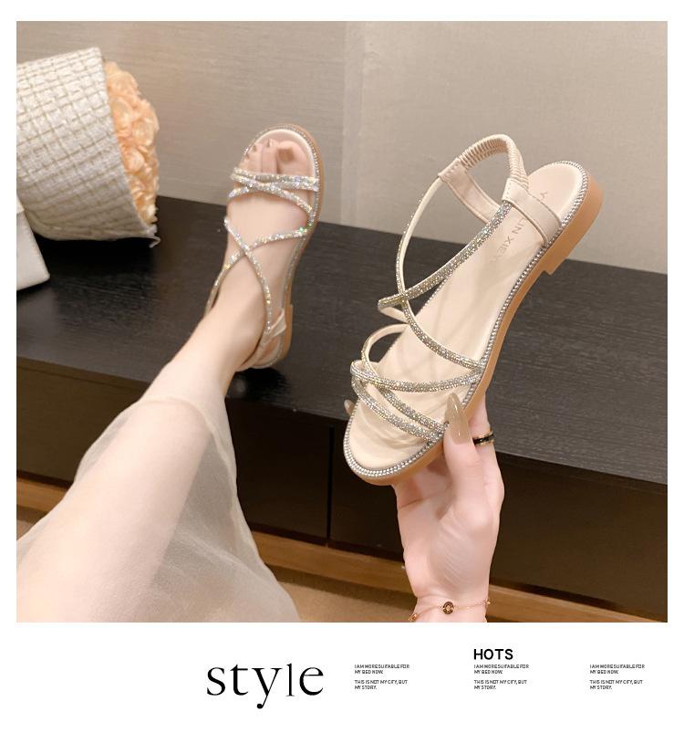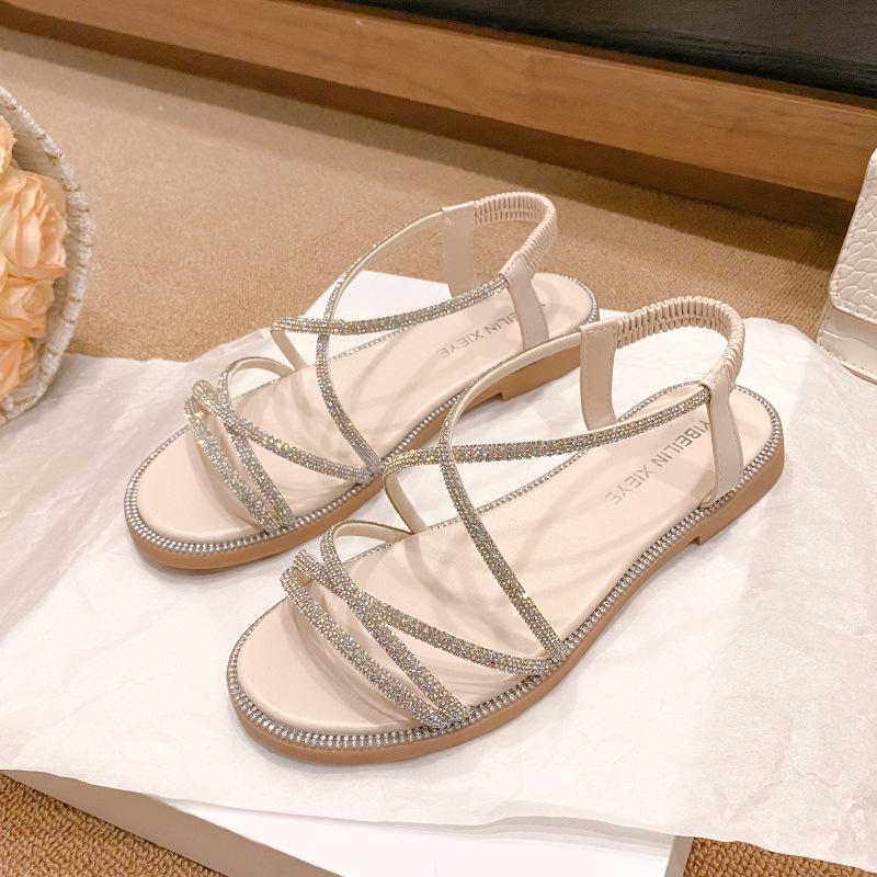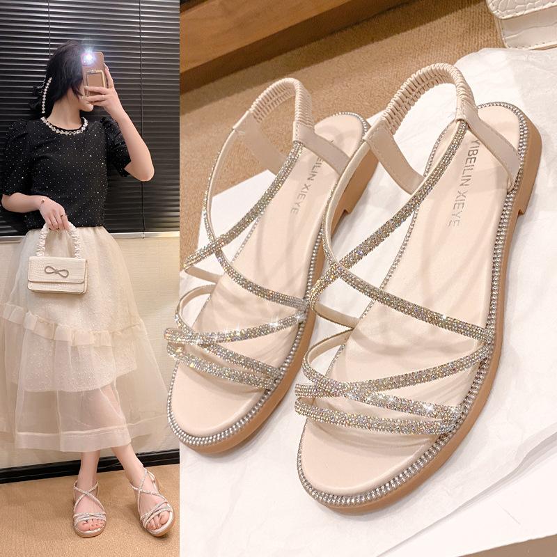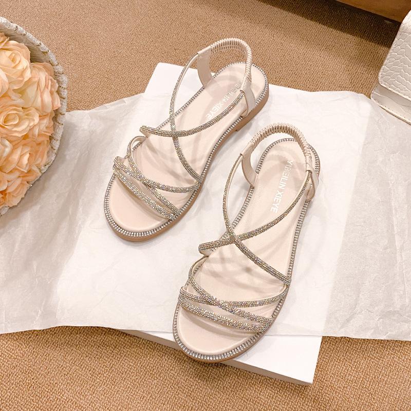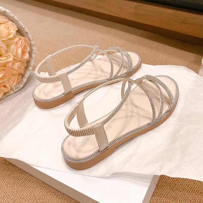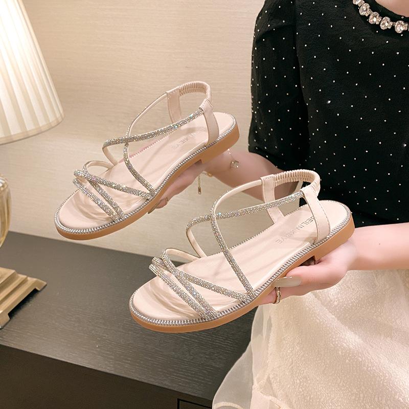 Sandalias planas romanas para mujer, zapatos de playa, ropa de abrigo, sandalias planas de hada con diamantes de imitación, moda de verano 2025, venta al por mayor