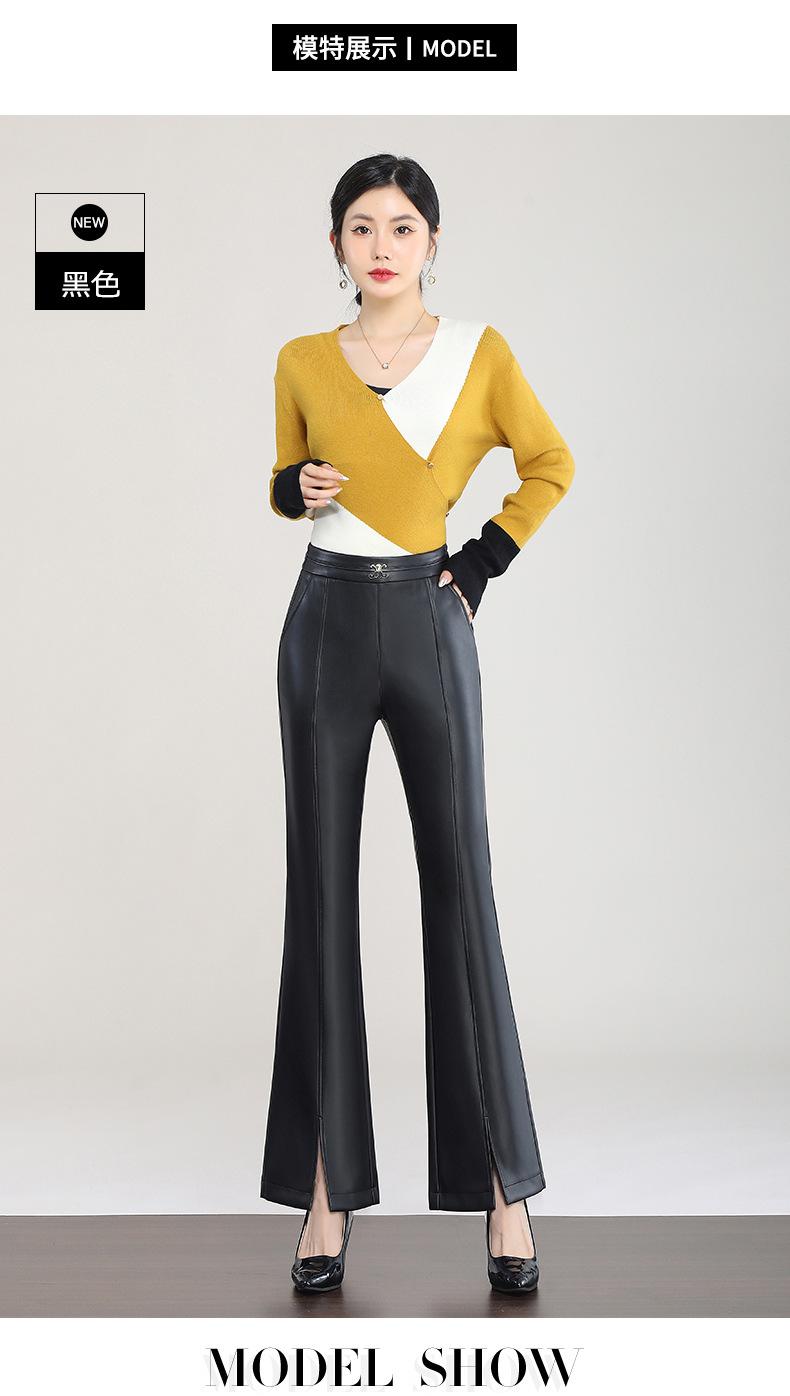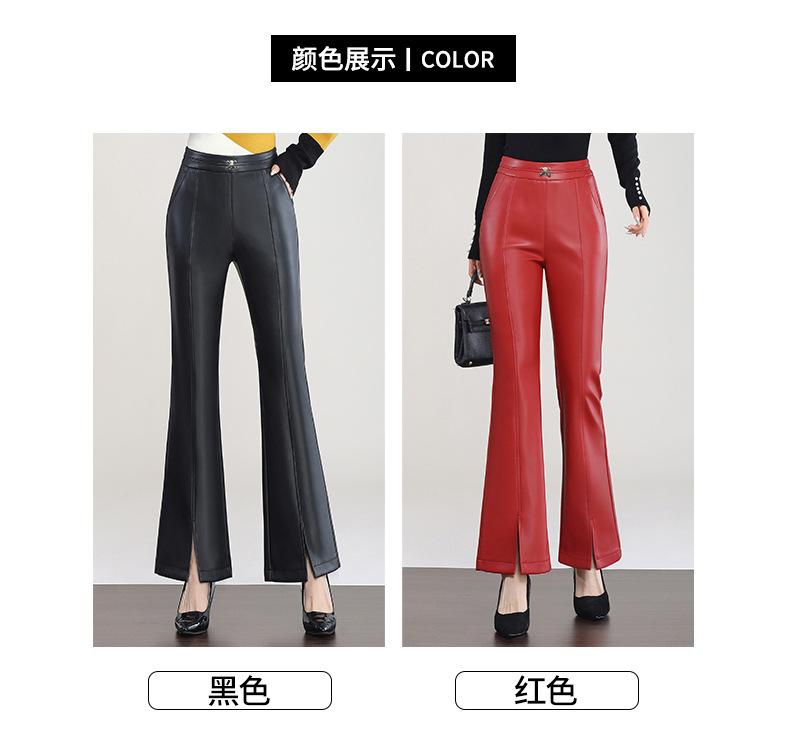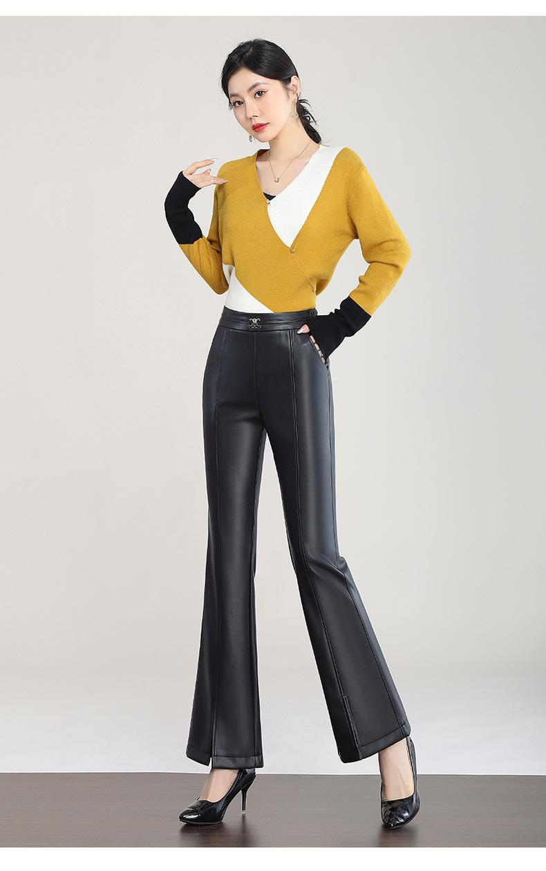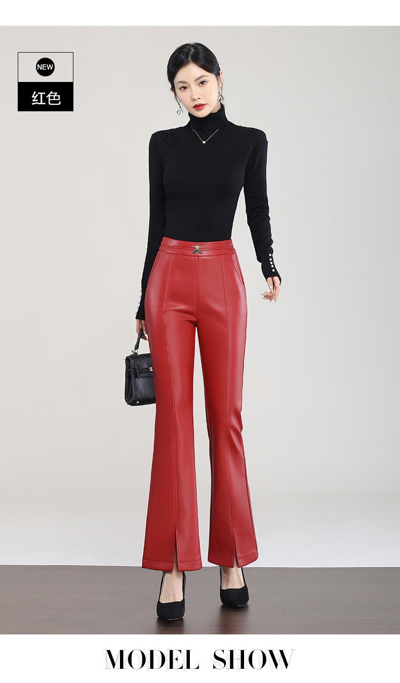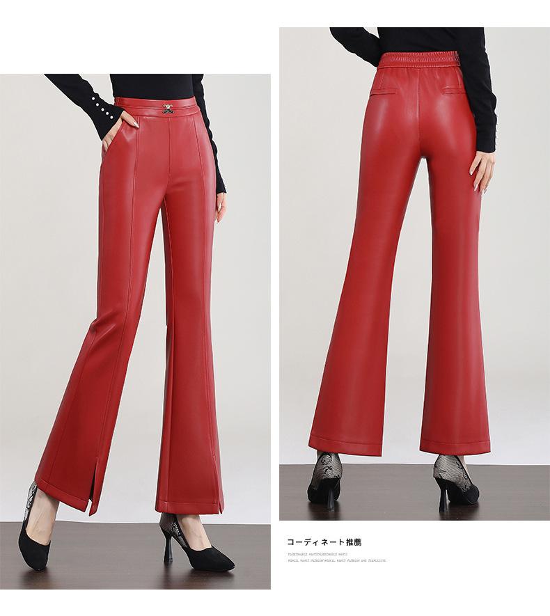 Pantalones de Cuero de Piel de Haining Nuevos de Otoño e Invierno 2025 para Mujer de Cintura Alta, Pantalones Bootcut Casuales de Cuero PU Artificial con Abertura Acampanados
