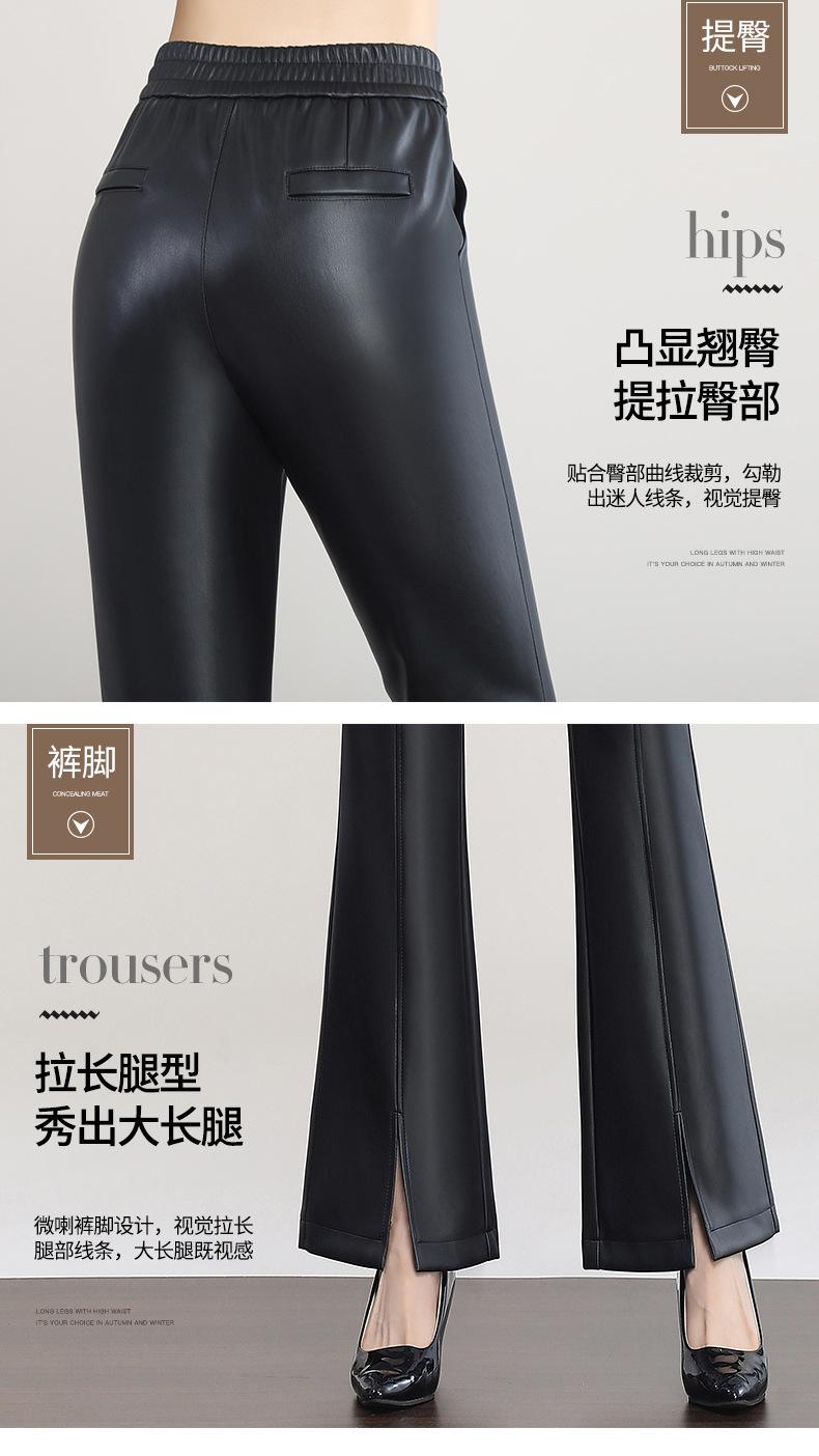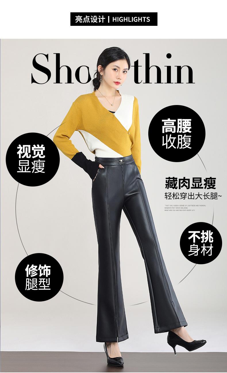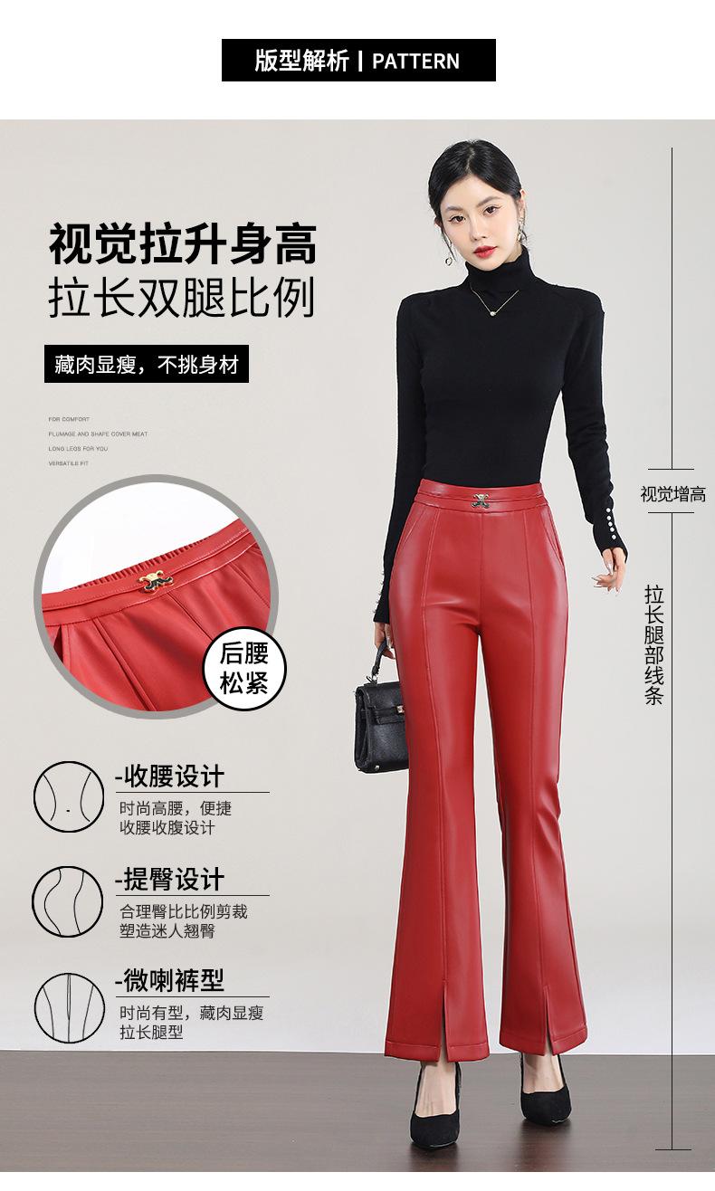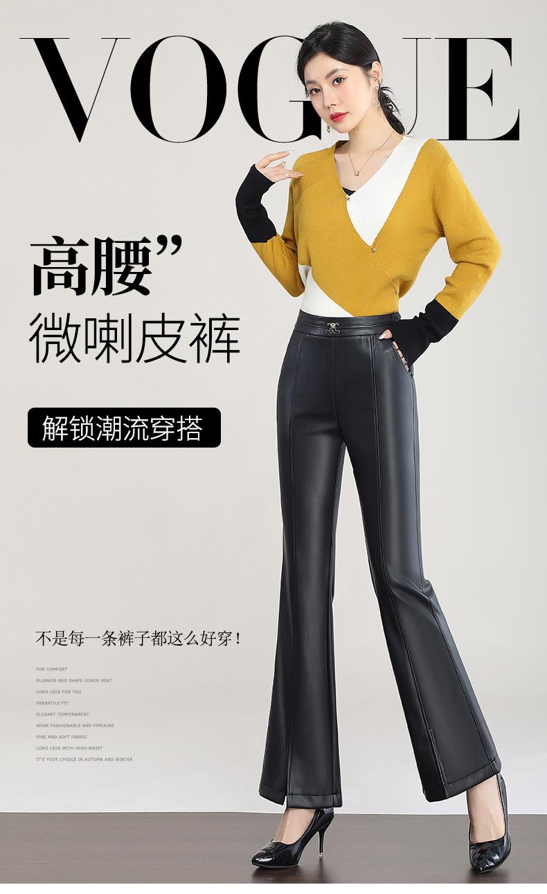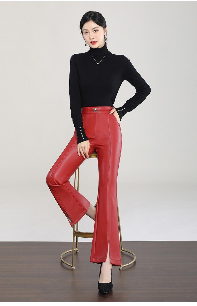 Pantalones de Cuero de Piel de Haining Nuevos de Otoño e Invierno 2025 para Mujer de Cintura Alta, Pantalones Bootcut Casuales de Cuero PU Artificial con Abertura Acampanados
