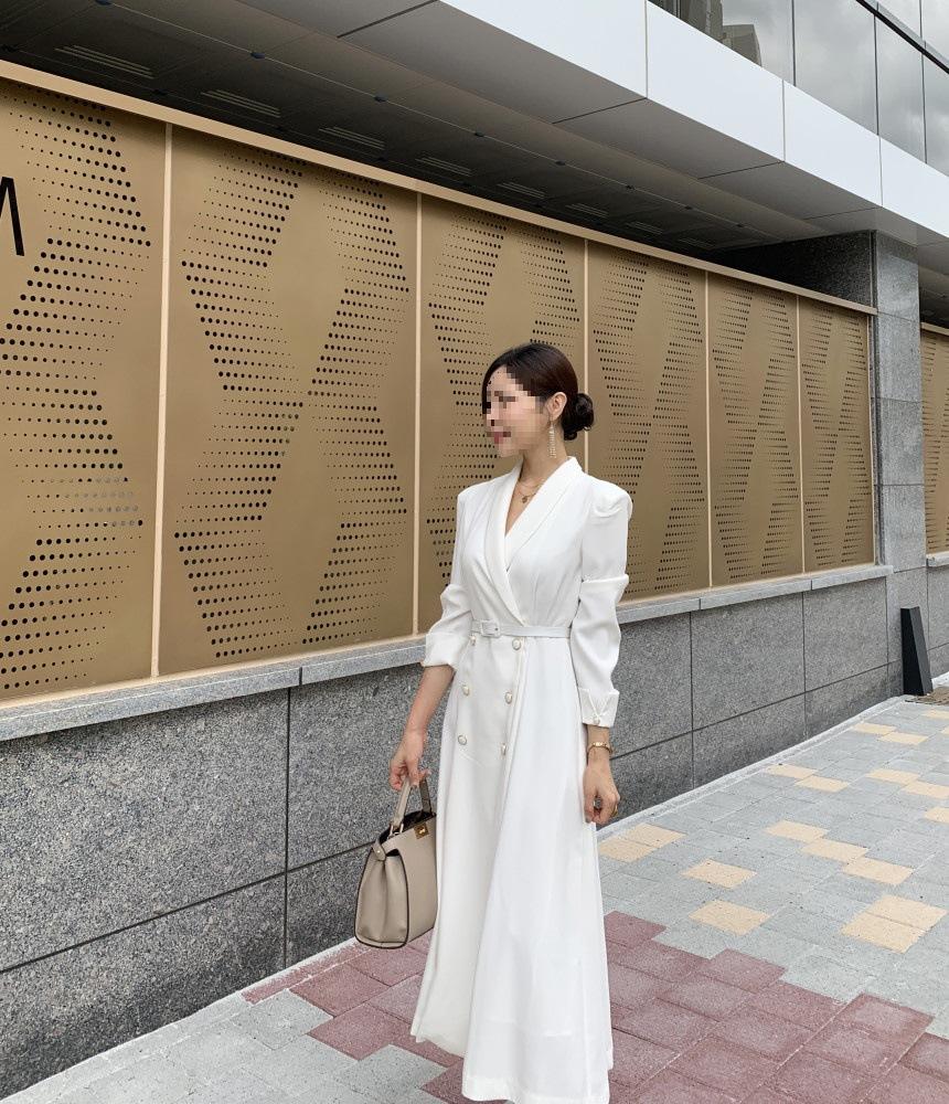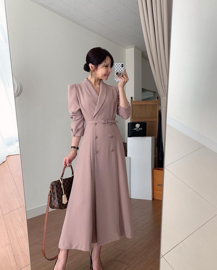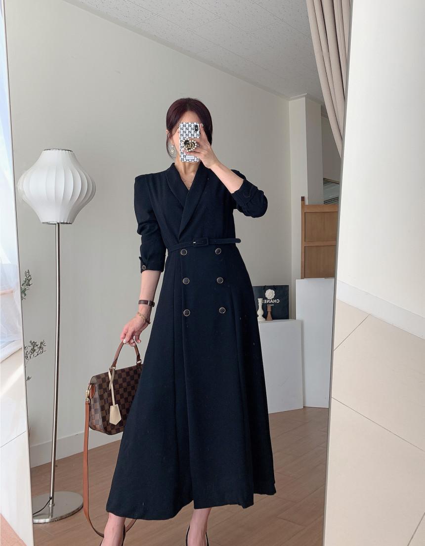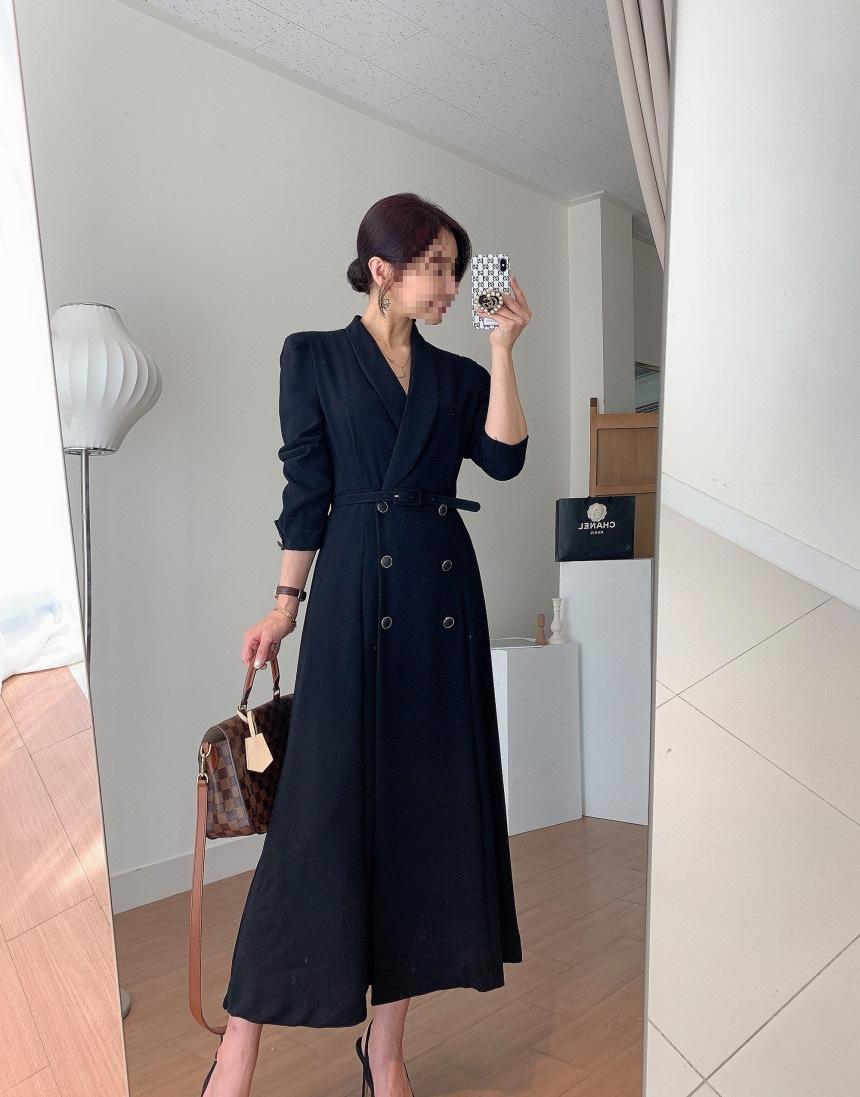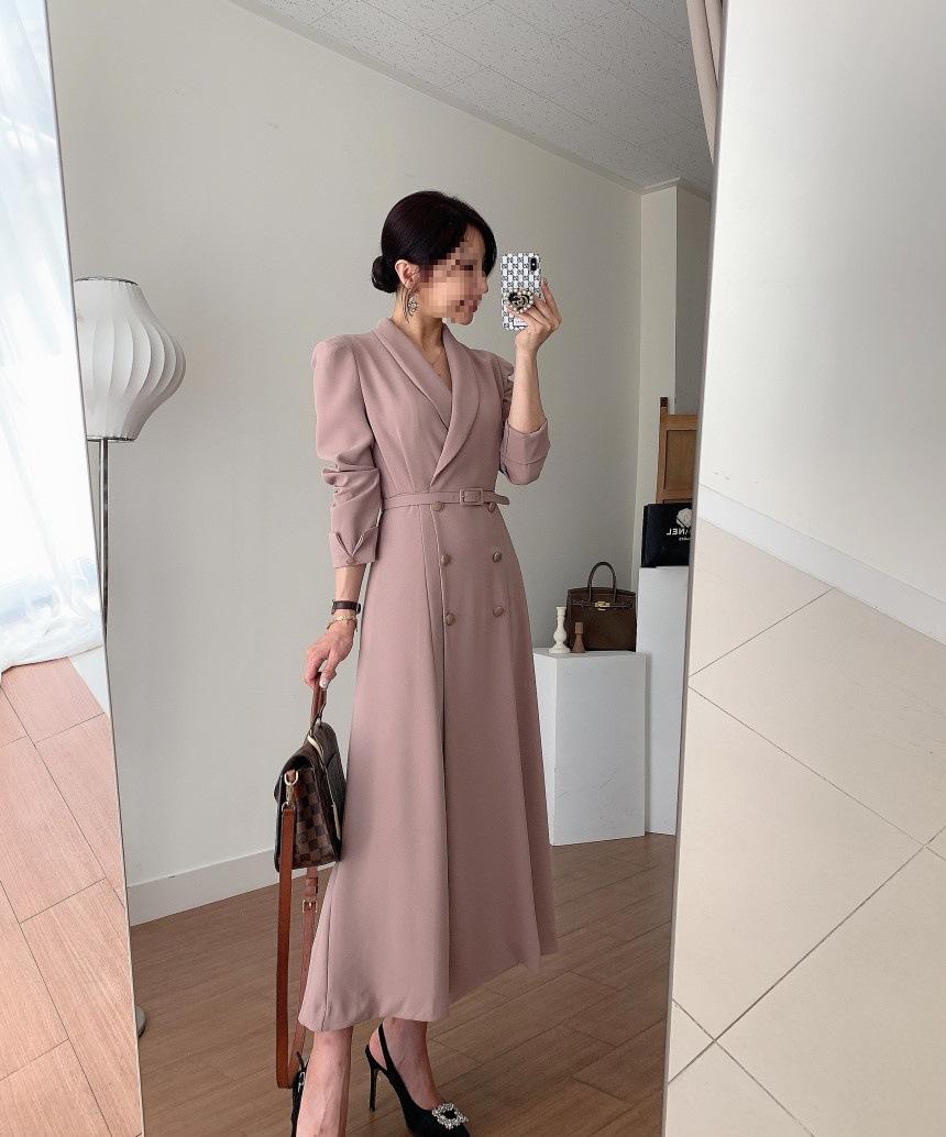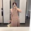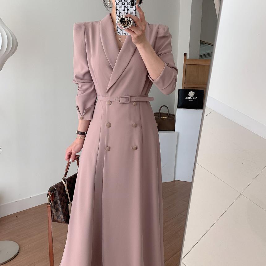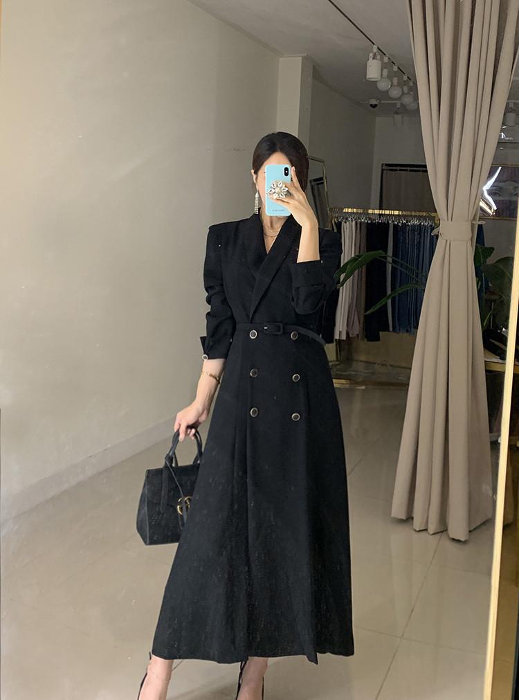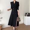 Chaqueta de traje elegante y elegante con cintura ajustada, doble botonadura, cuello en V grande y cortavientos largo
