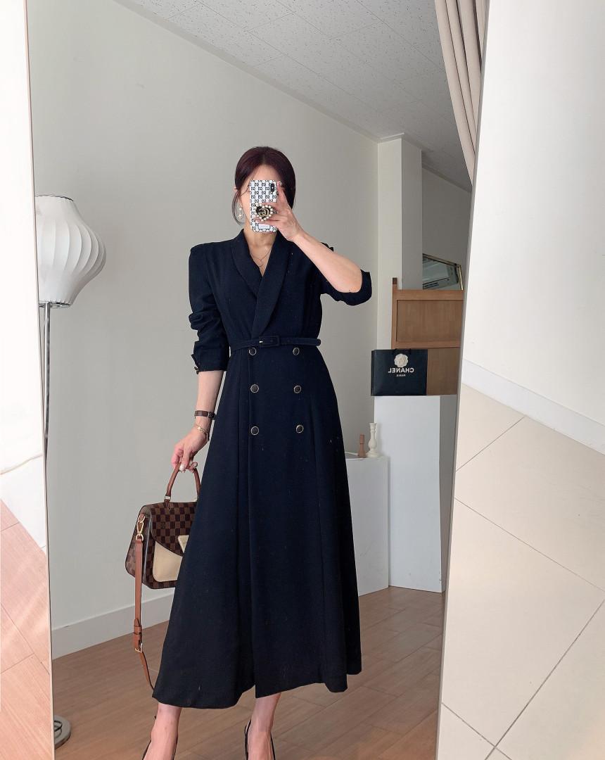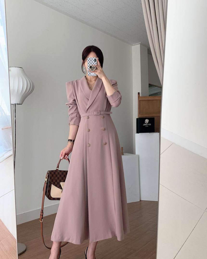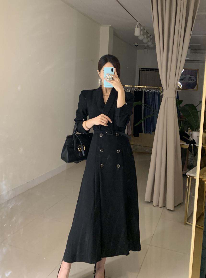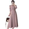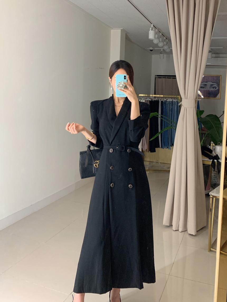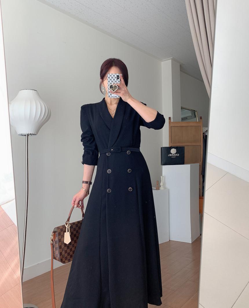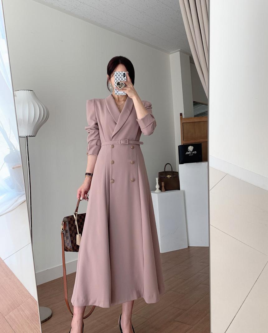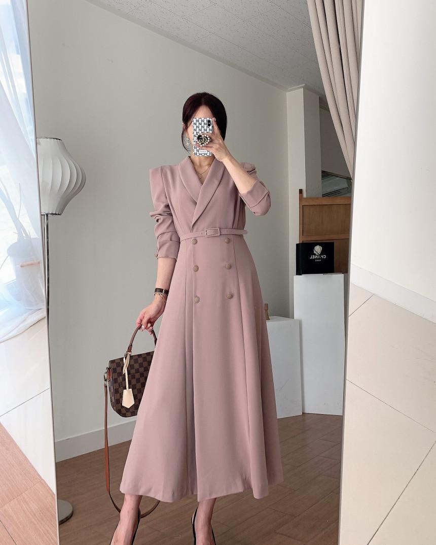 Chaqueta de traje elegante y elegante con cintura ajustada, doble botonadura, cuello en V grande y cortavientos largo