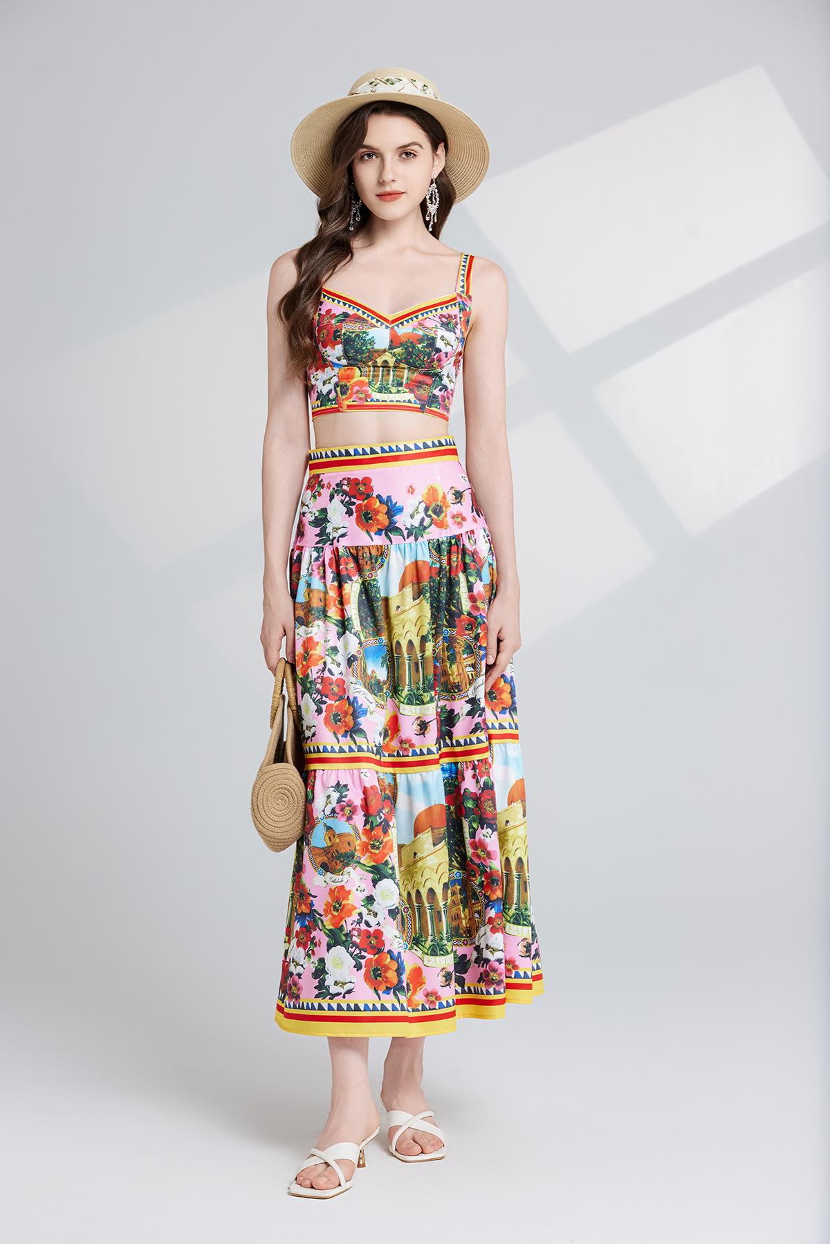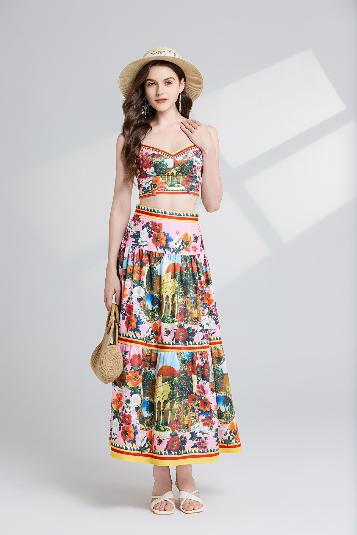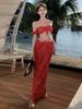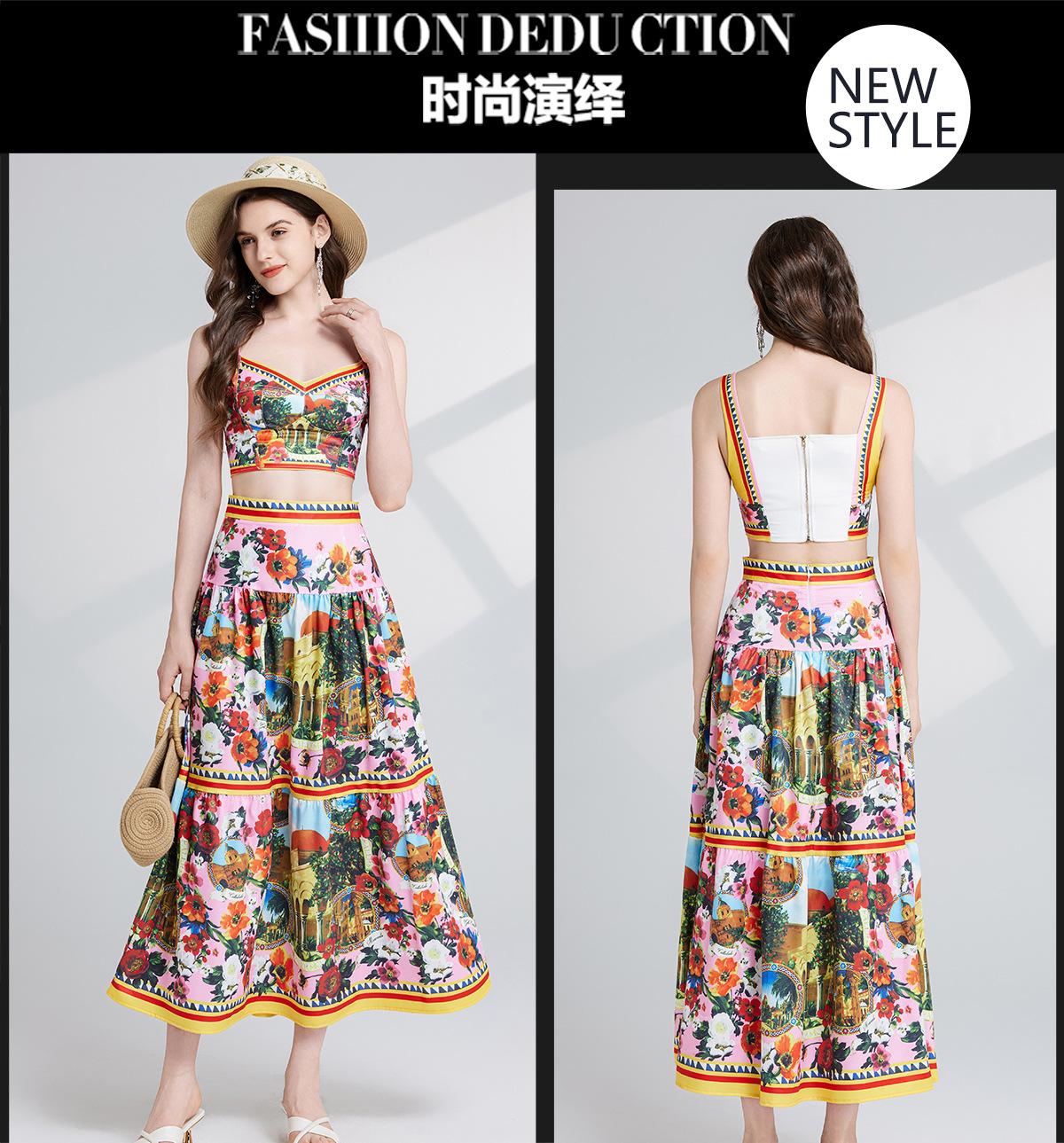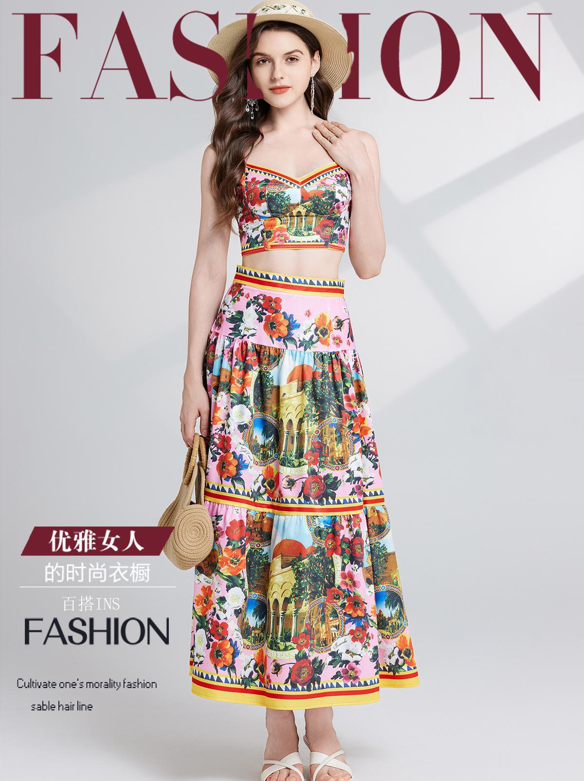 Traje de dos piezas con falda de cintura alta y tirantes de tubo tridimensional con costuras sexys europeas y americanas con almohadillas para el pecho