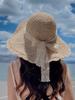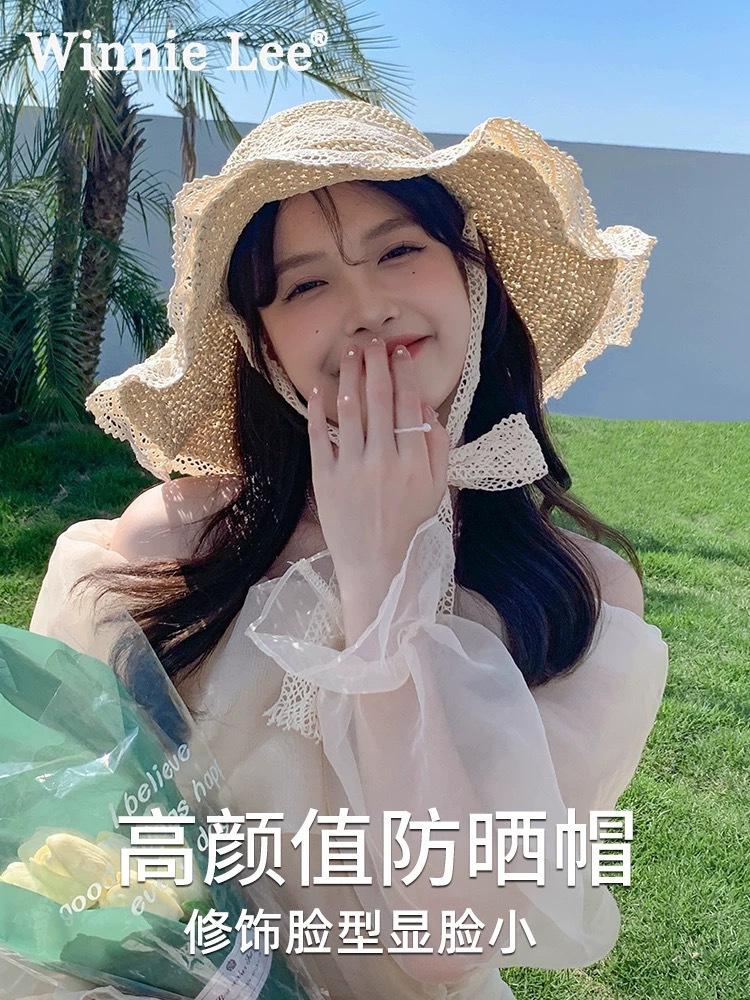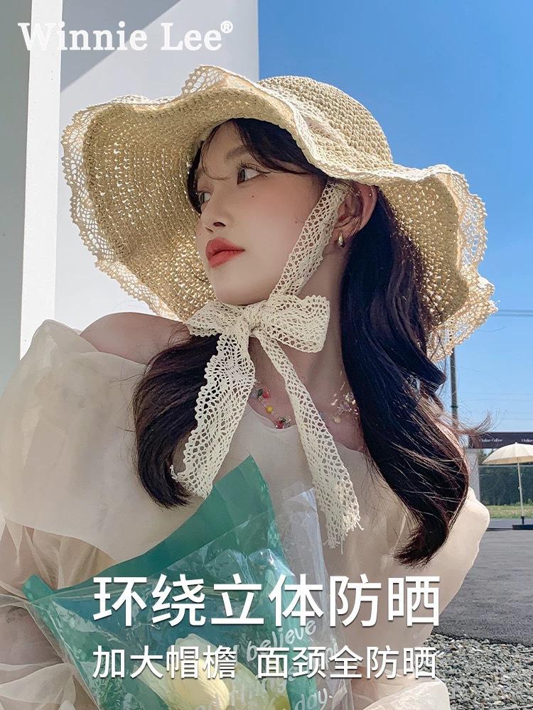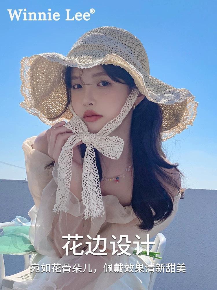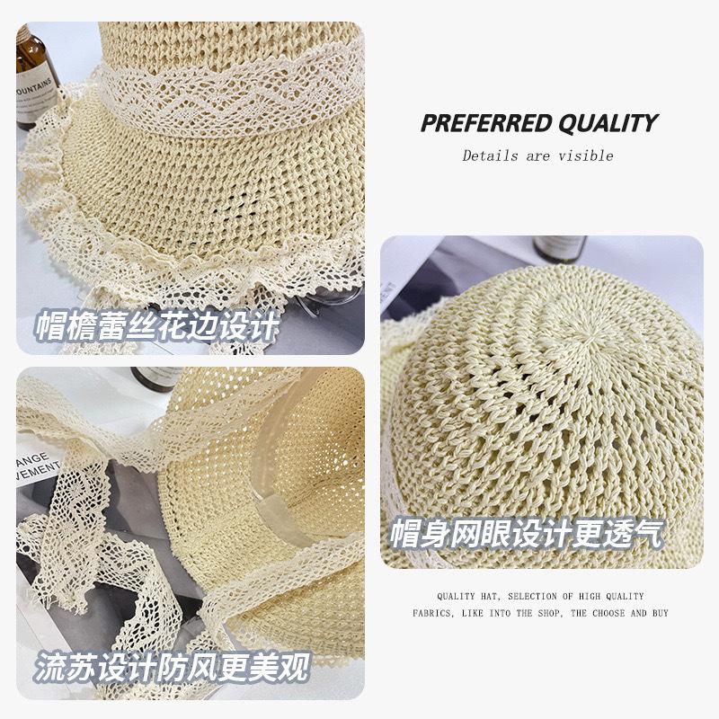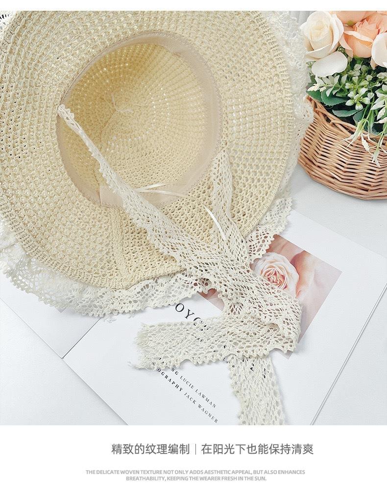 Sombrero de Playa Estilo Japonés Verano Encaje Sombrero de Paja para Mujer Sombrero Fresco con Protección Solar Sombrilla Viaje Vacaciones Plegable Sombrero para el Sol