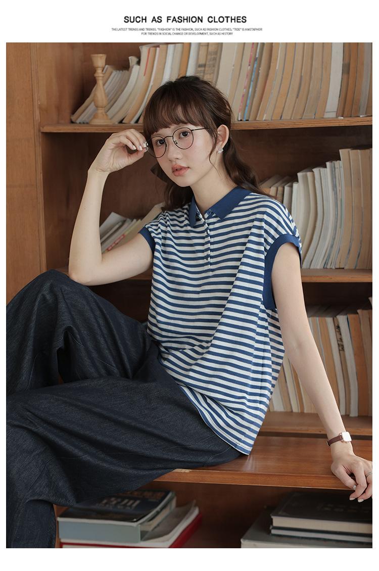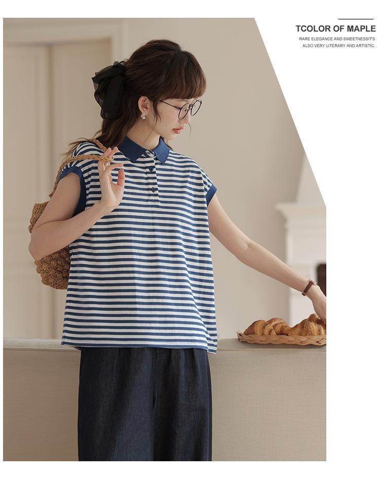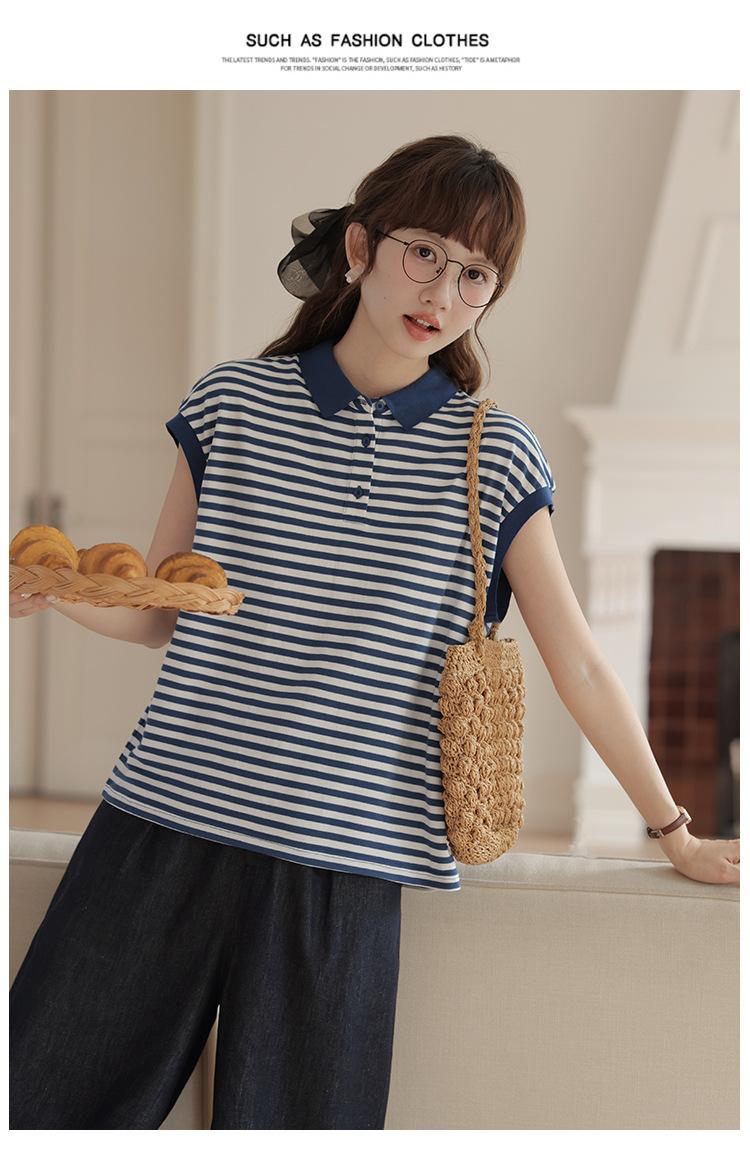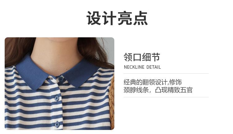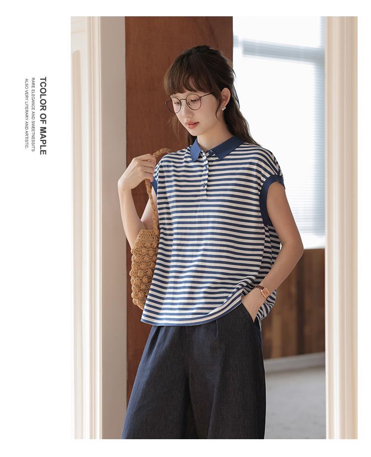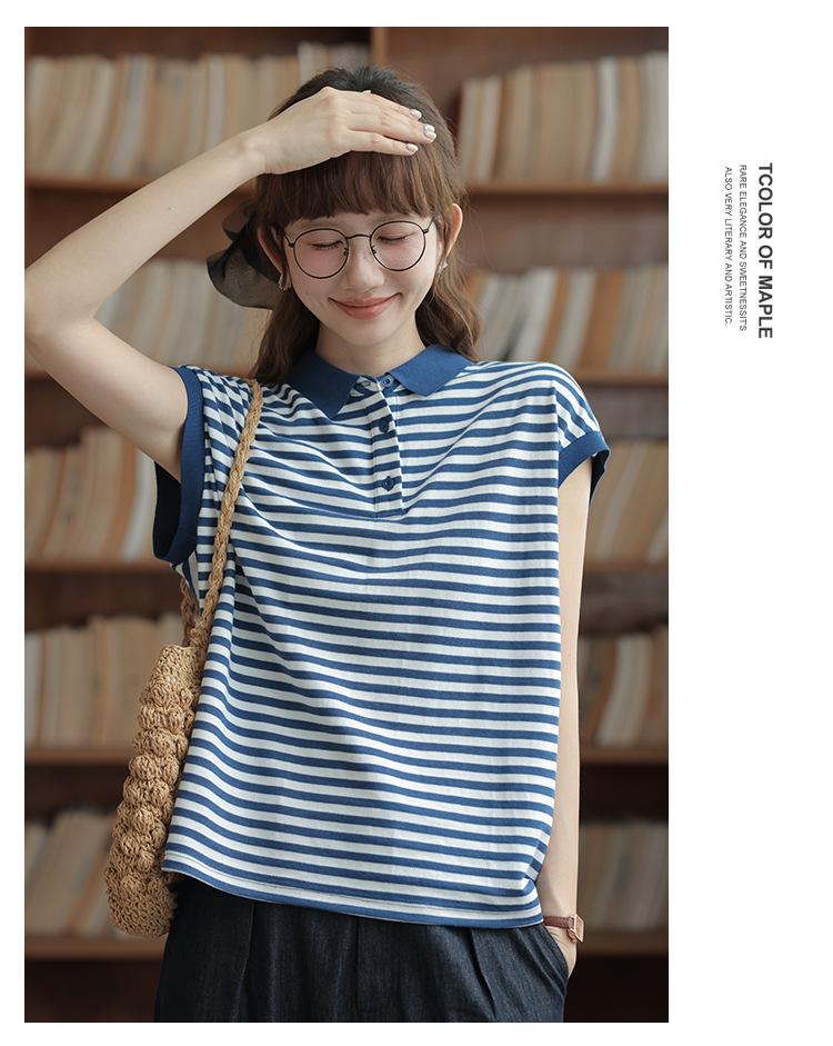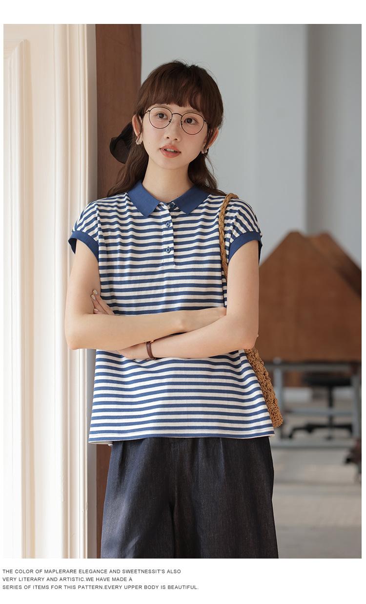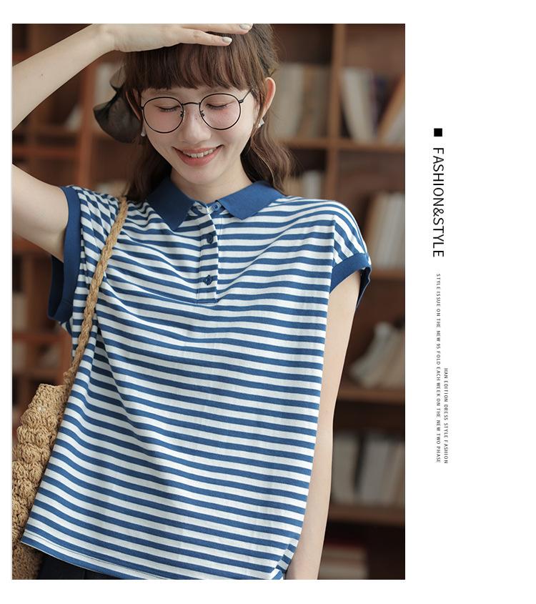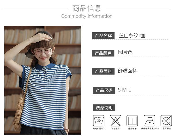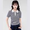2025 verano nuevo estilo coreano marino que reduce la edad polo de contraste de rayas azules y blancas camiseta de manga corta con tres botones para mujer