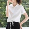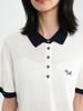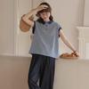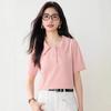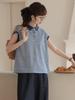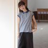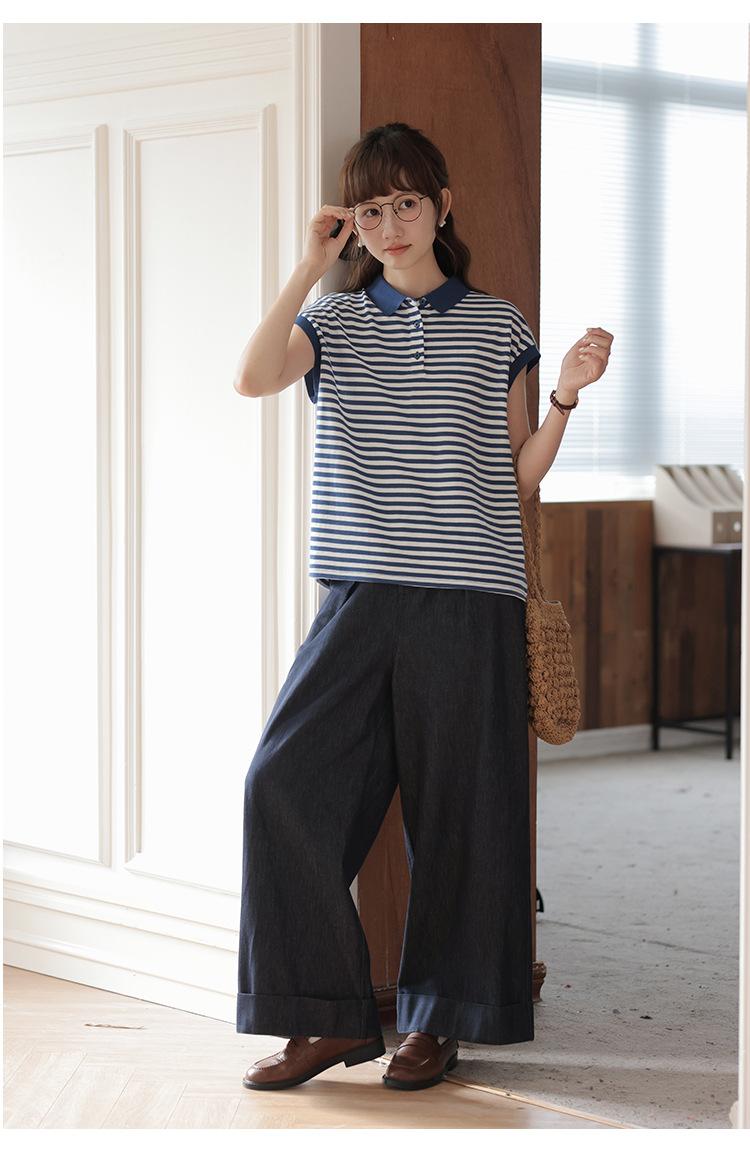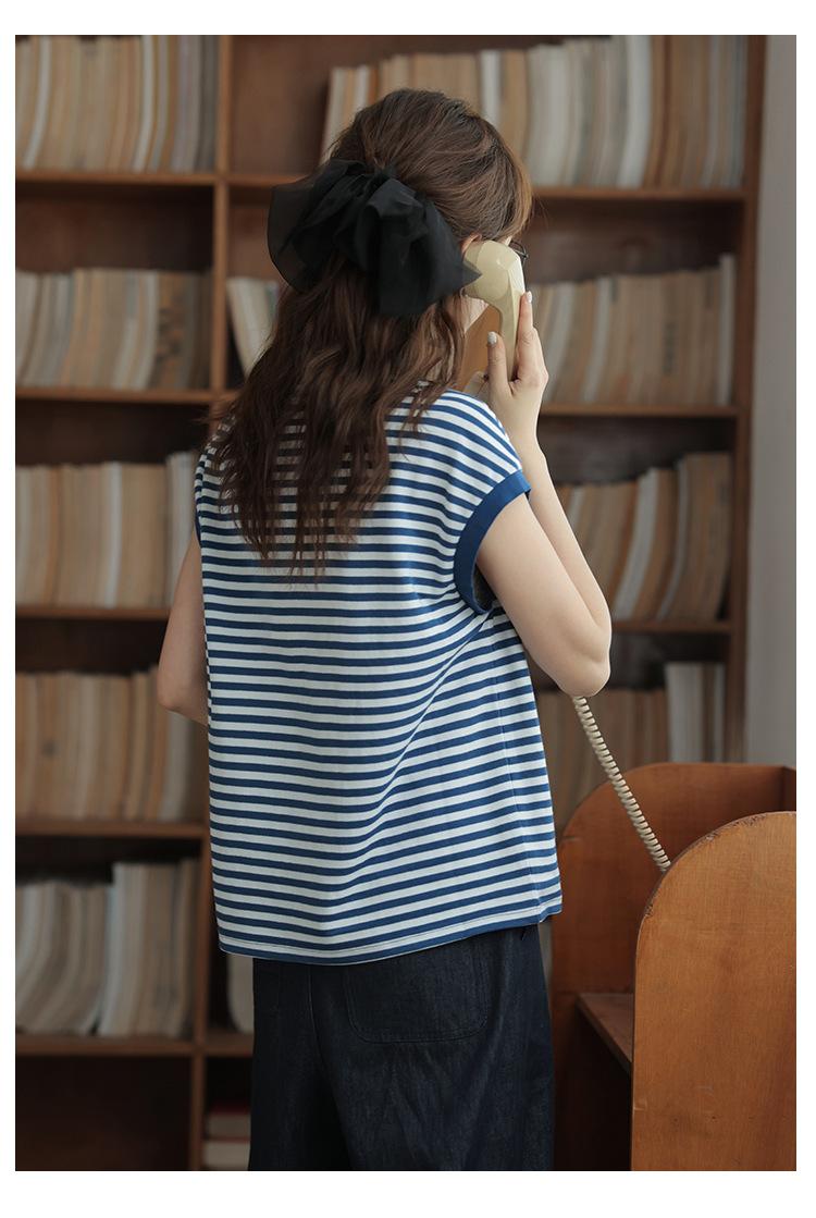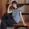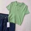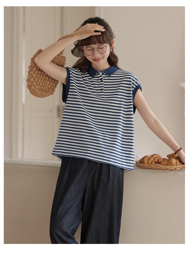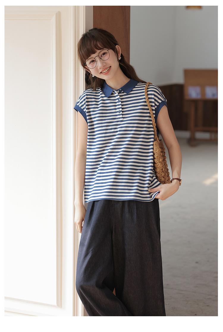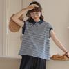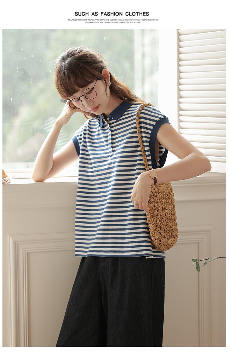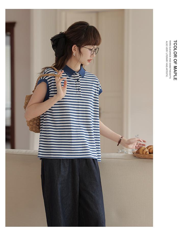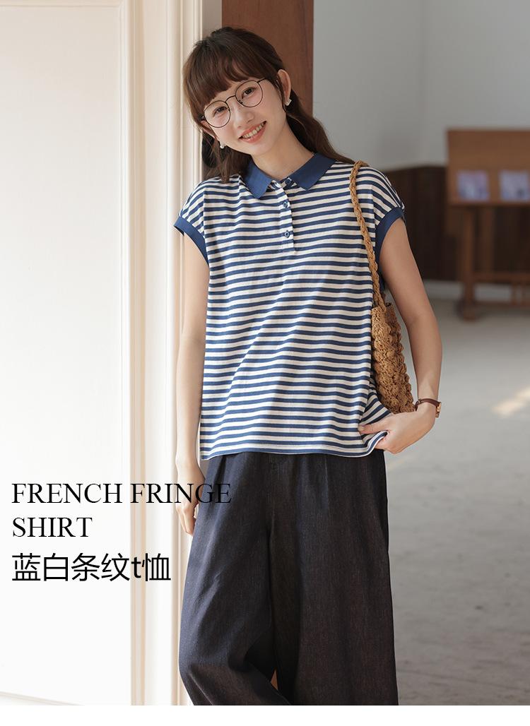 2025 verano nuevo estilo coreano marino que reduce la edad polo de contraste de rayas azules y blancas camiseta de manga corta con tres botones para mujer
