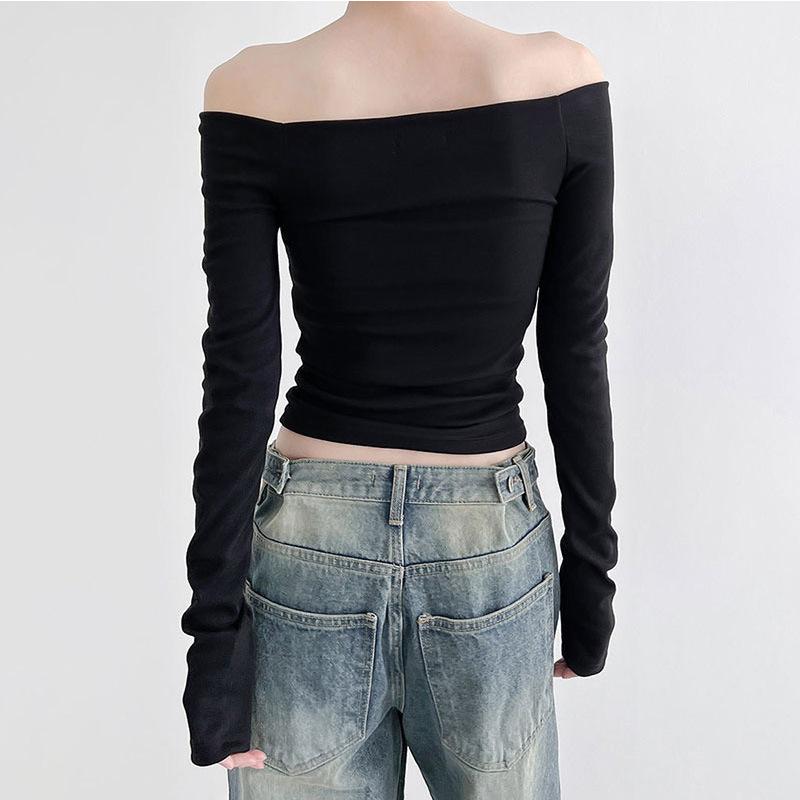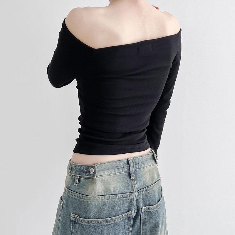 Camiseta básica de hombros descubiertos con cuello de un carácter de color sólido estilo coreano, sexy y picante, elegante y rejuvenecedora, corta y ajustada, ropa de mujer