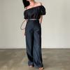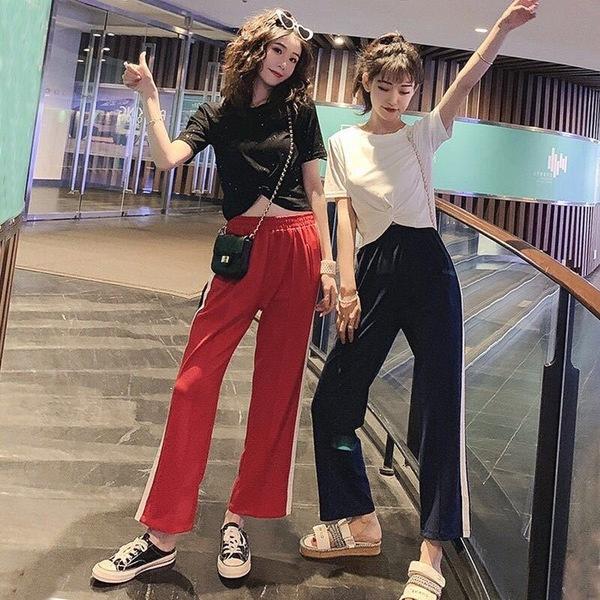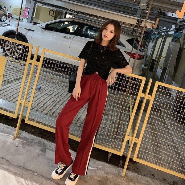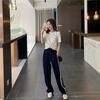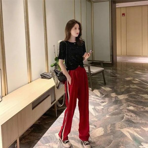 Traje de Seda Brillante Moda Casual de Verano para Mujer Estilo Coreano Ins Camiseta Corta con Ombligo Descubierto Pantalones Deportivos de Pierna Ancha Conjunto de Dos Piezas