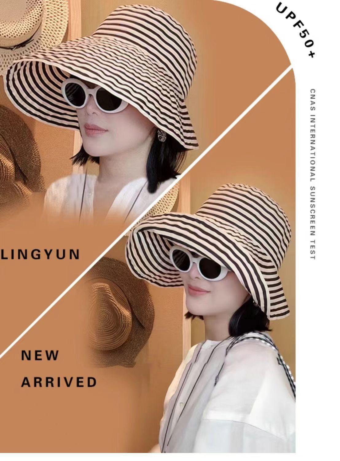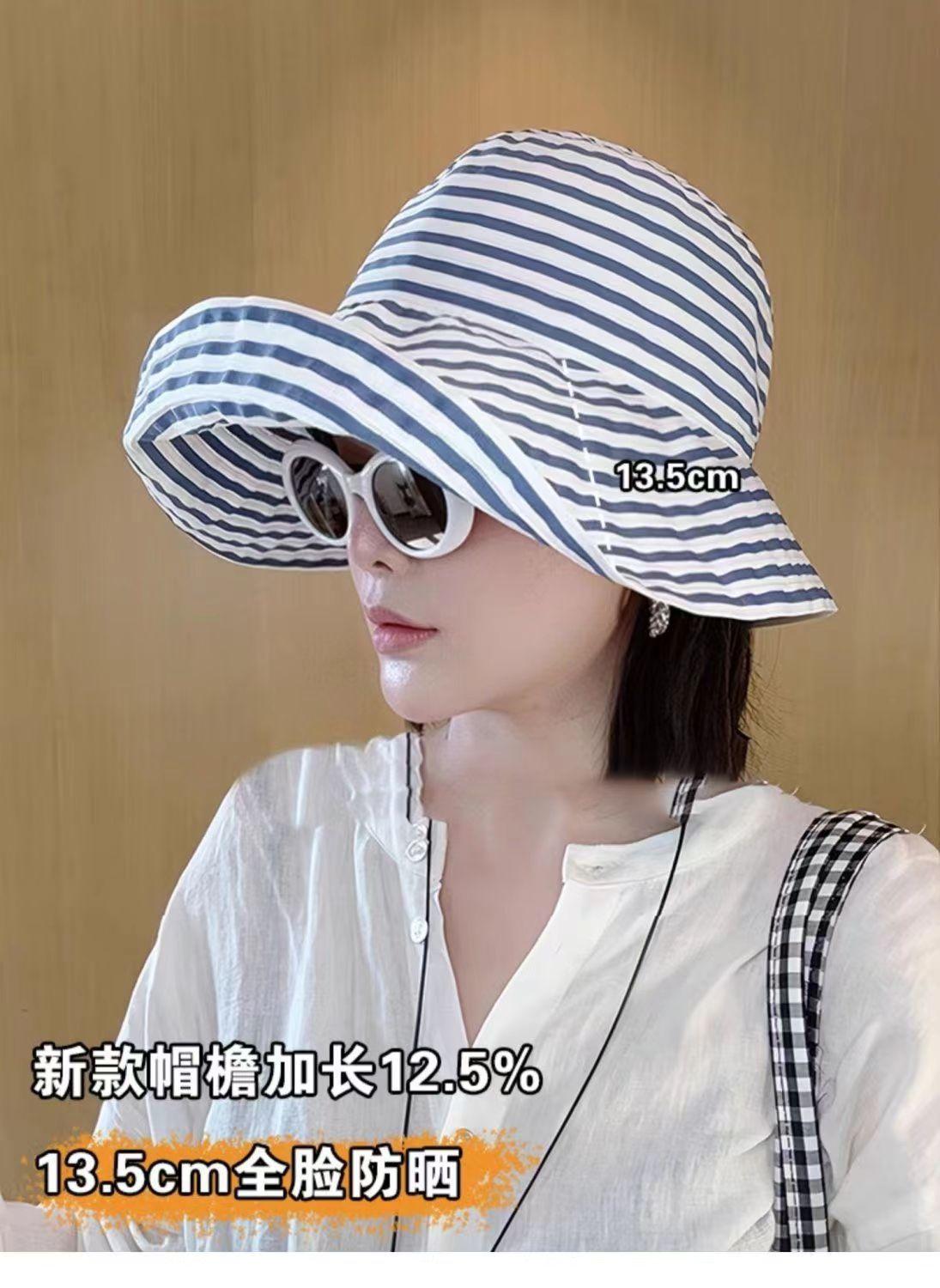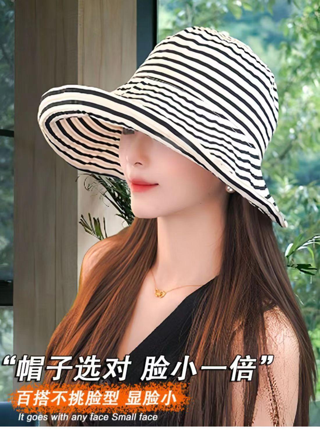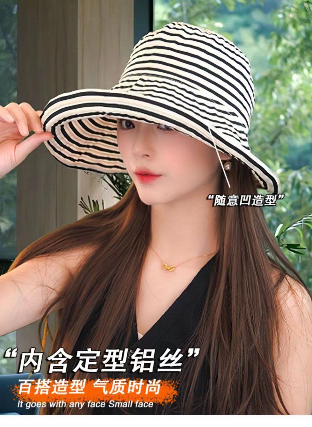 Sombrero de pescador a rayas de primavera y verano para mujer, estilo japonés, plegable, nuevo, largo, protector solar, sombrero de lavabo de moda, sombrero de sol de cabeza grande.