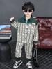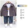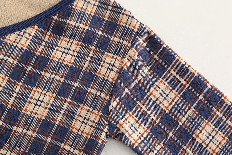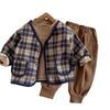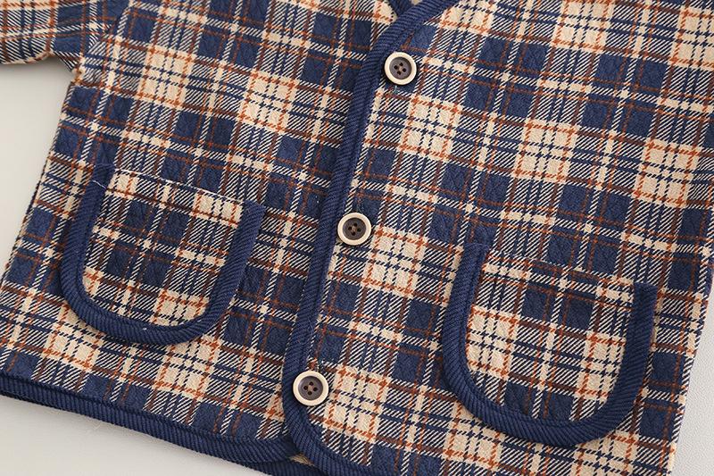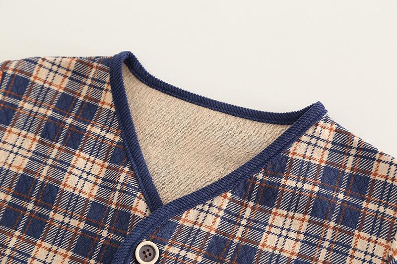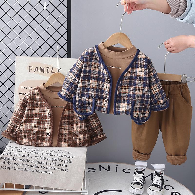 Traje de primavera y otoño para niño 2025, nuevo conjunto de tres piezas para bebé, camisa a cuadros retro para niño, cárdigan, elegante y a la moda.