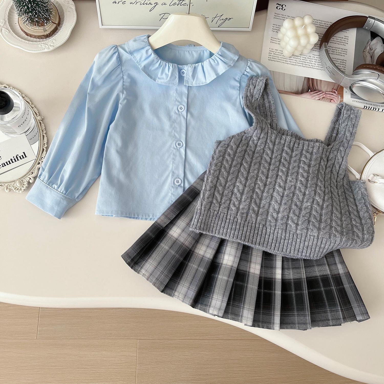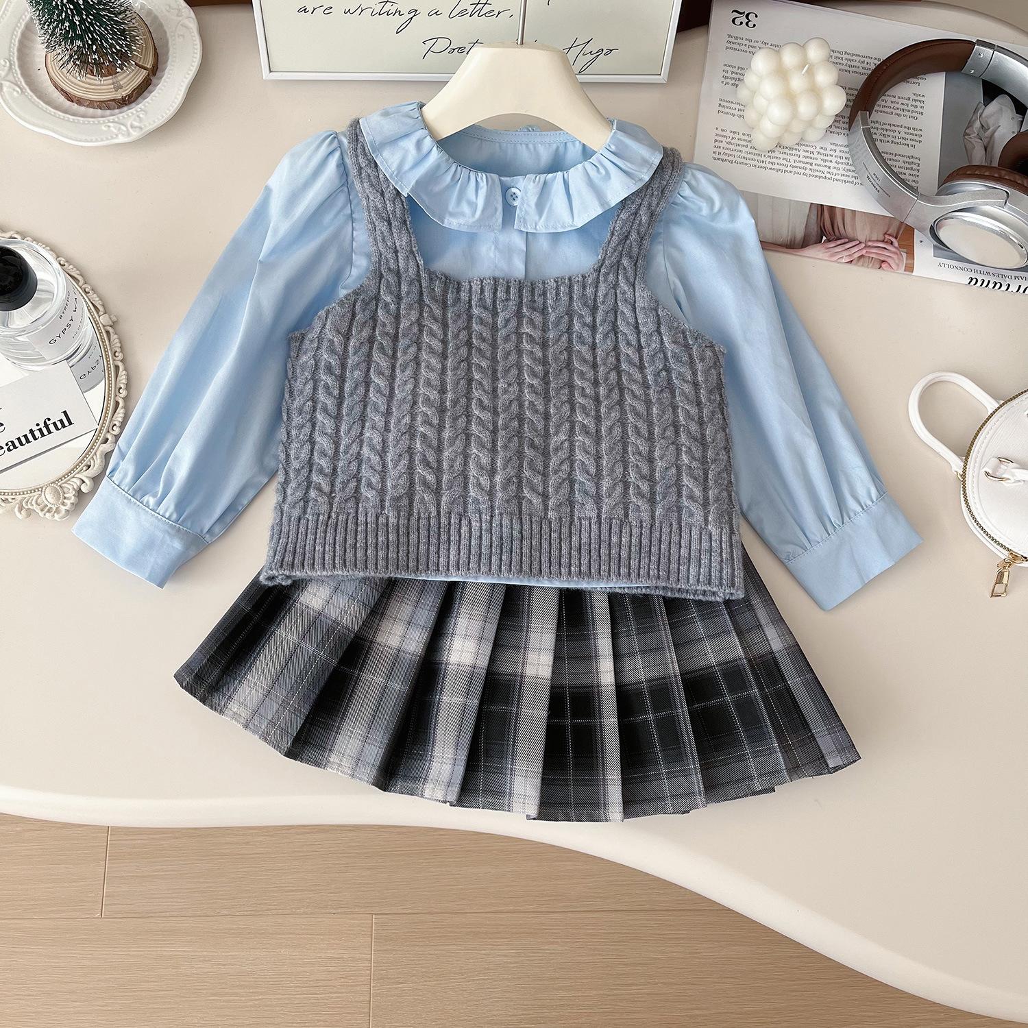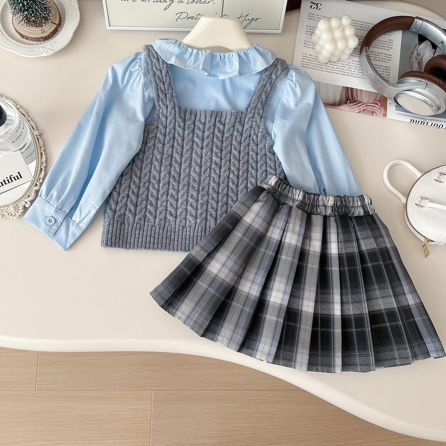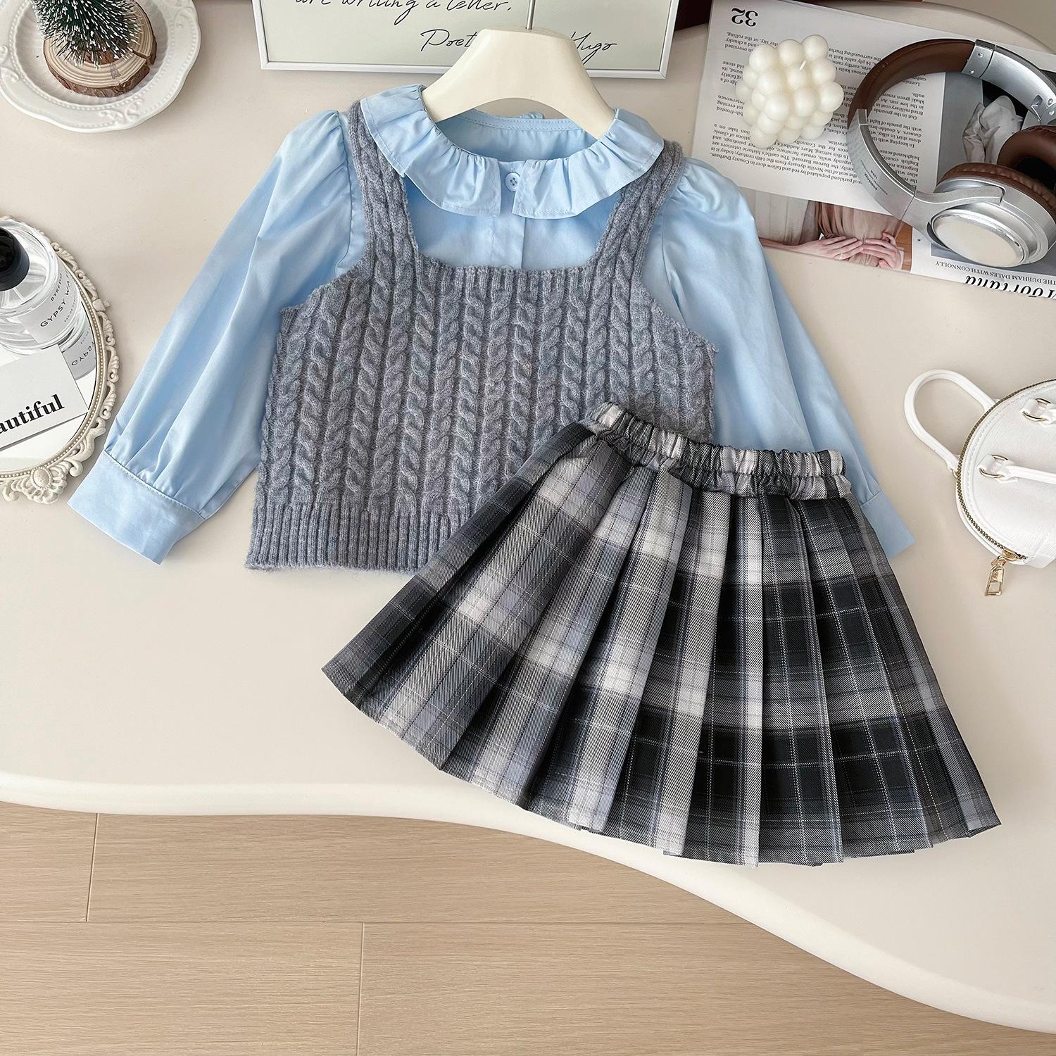 Chaleco de punto de tres piezas para niña, camiseta de muñeca con cuello redondo, falda plisada, otoño 67506