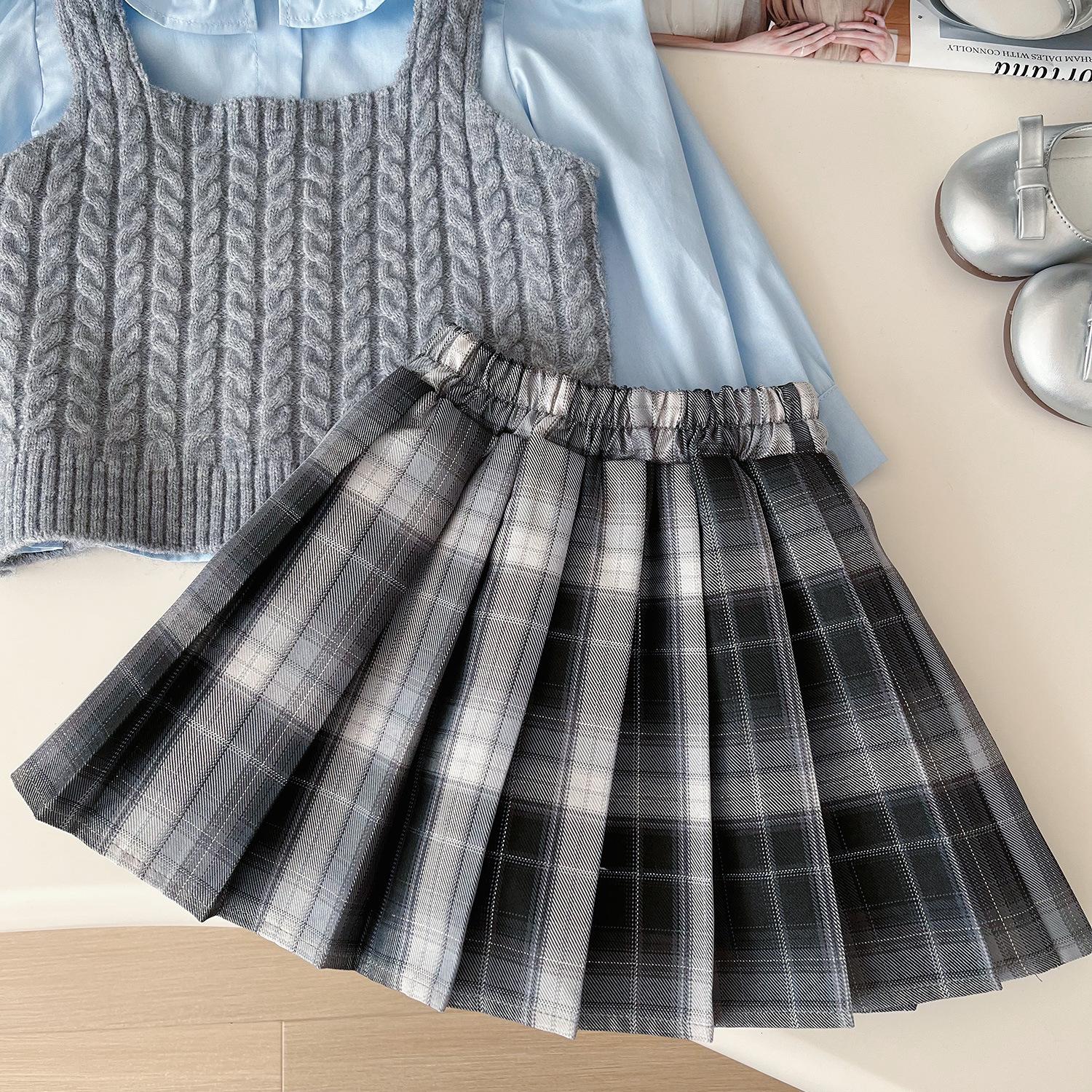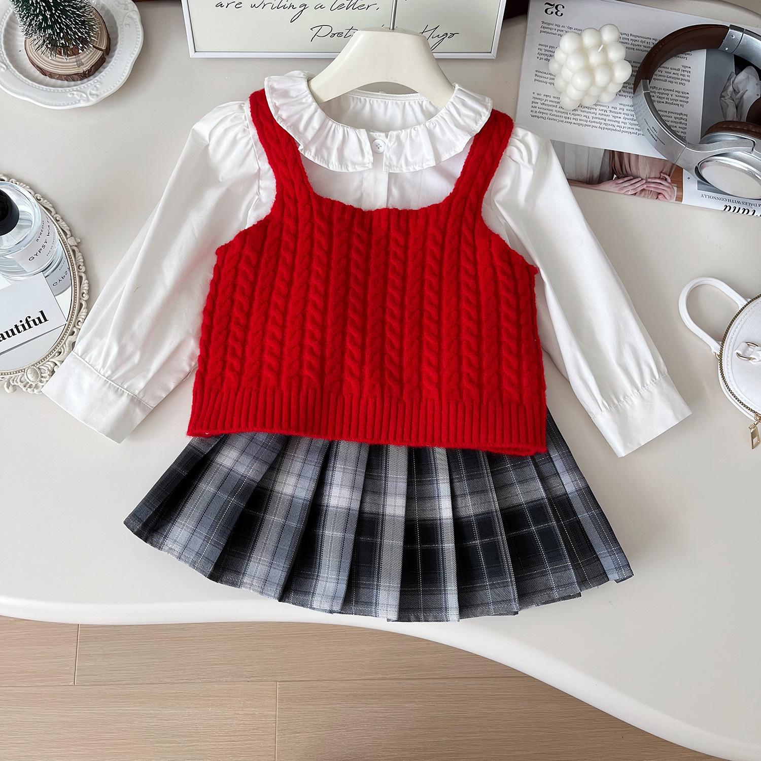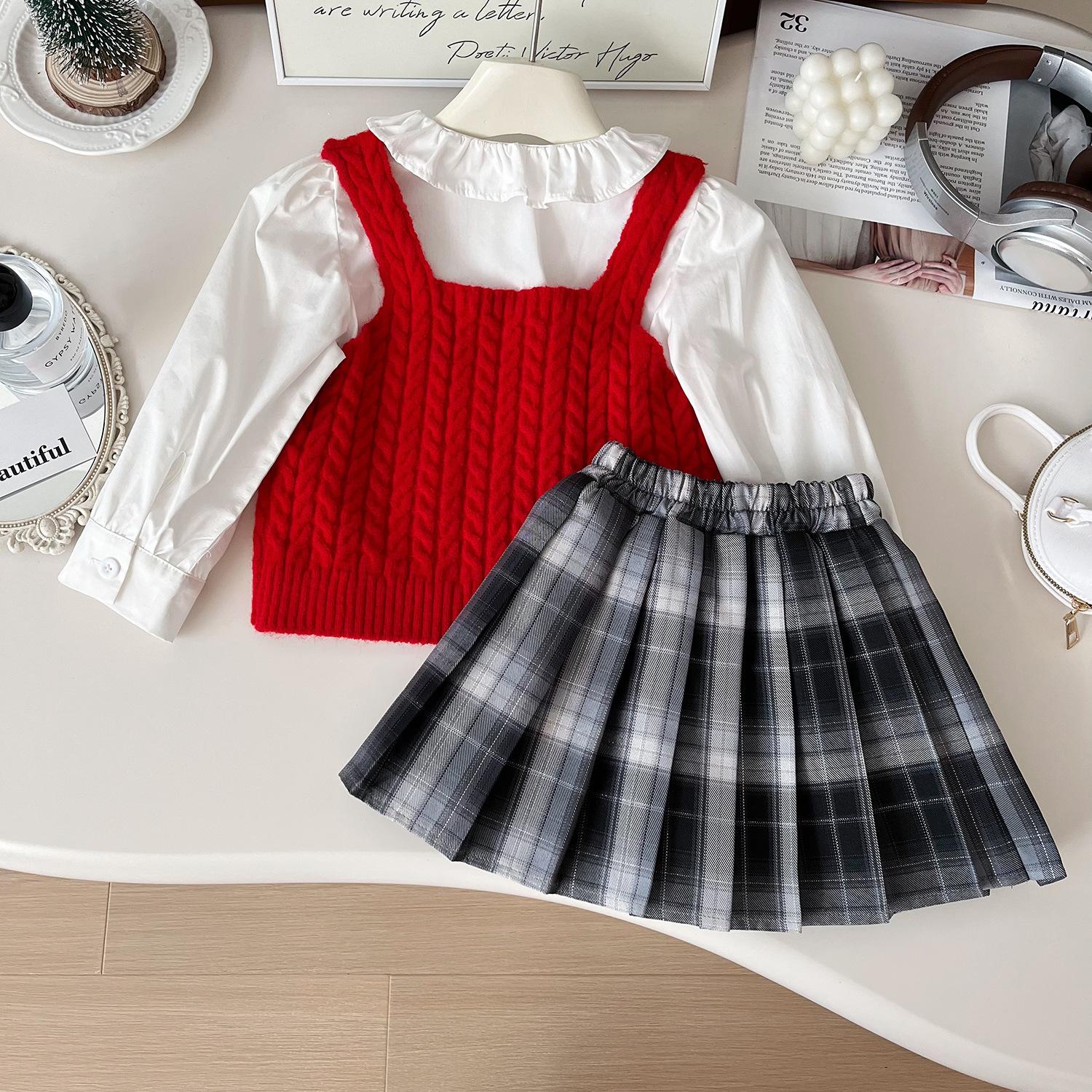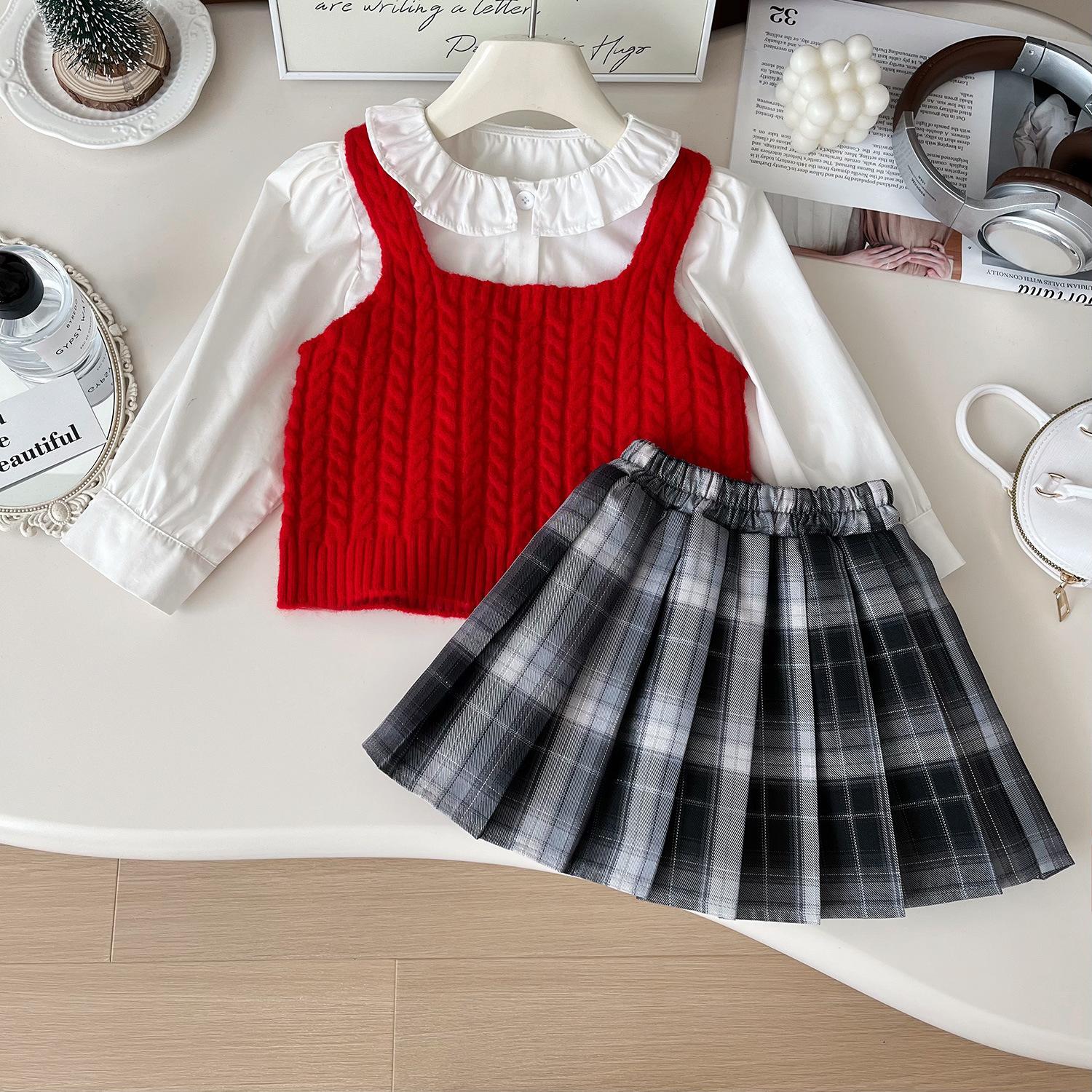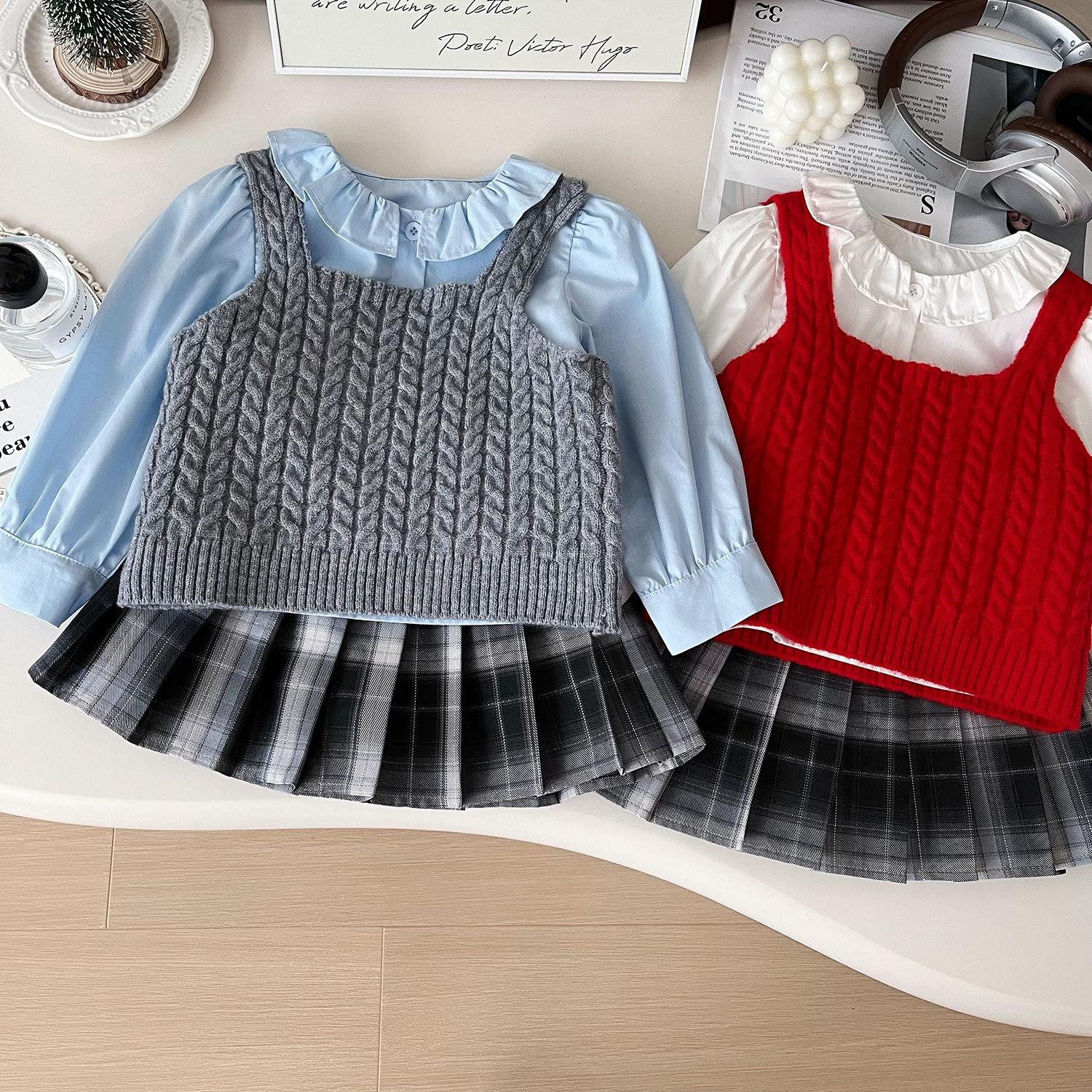 Chaleco de punto de tres piezas para niña, camiseta de muñeca con cuello redondo, falda plisada, otoño 67506