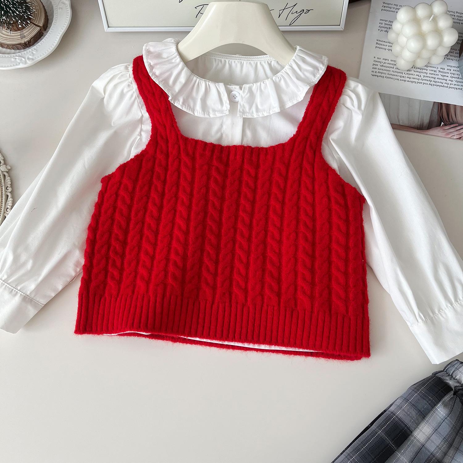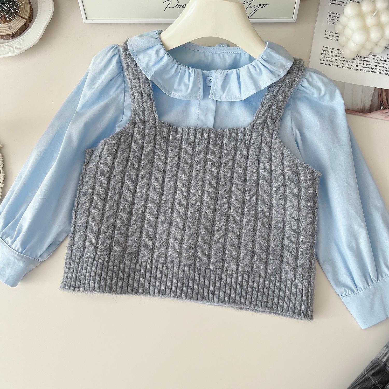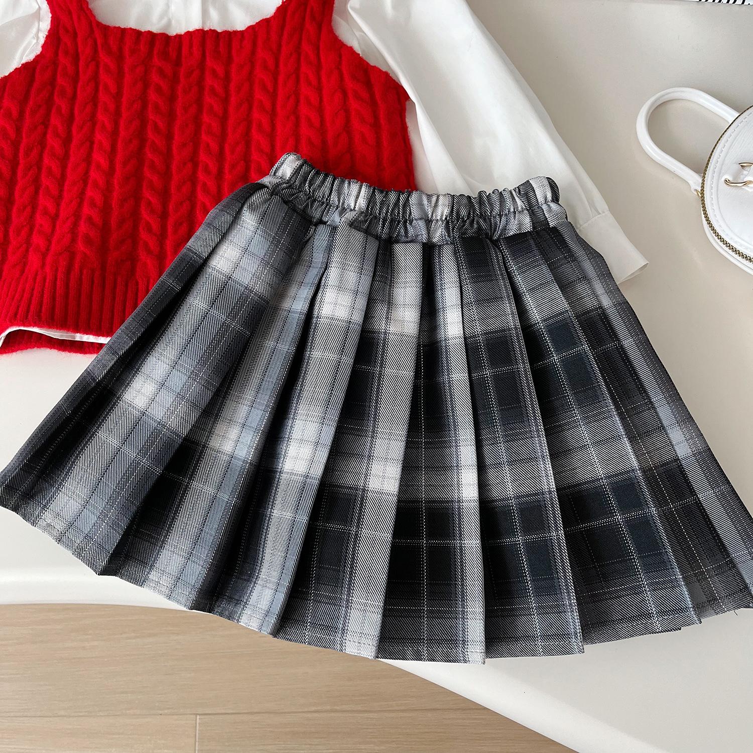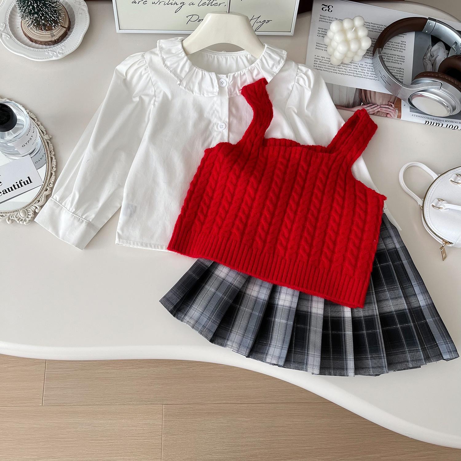 Chaleco de punto de tres piezas para niña, camiseta de muñeca con cuello redondo, falda plisada, otoño 67506