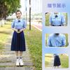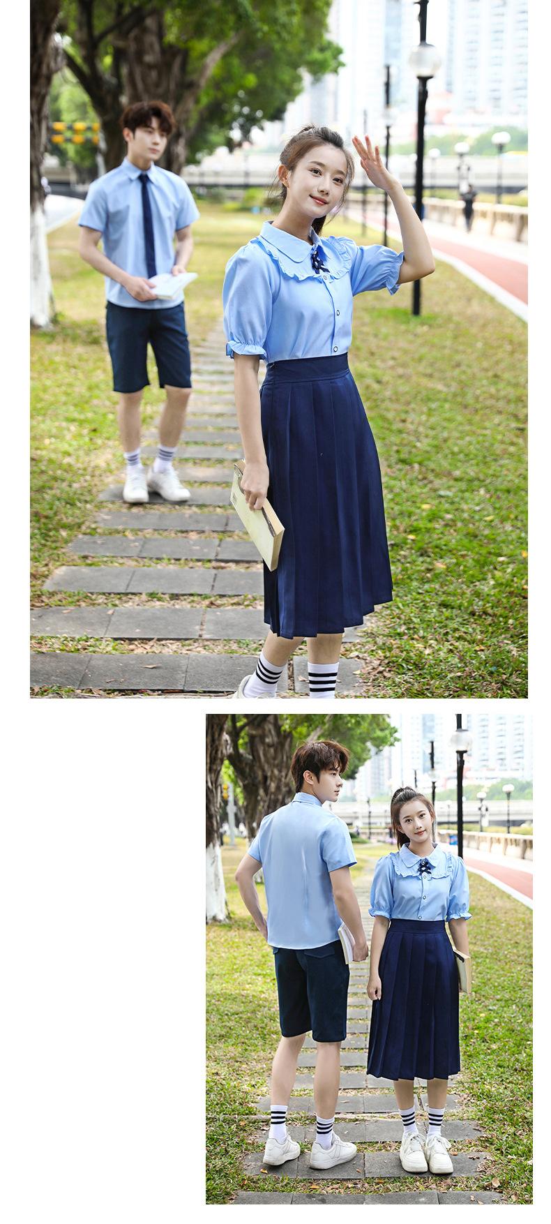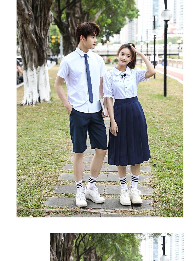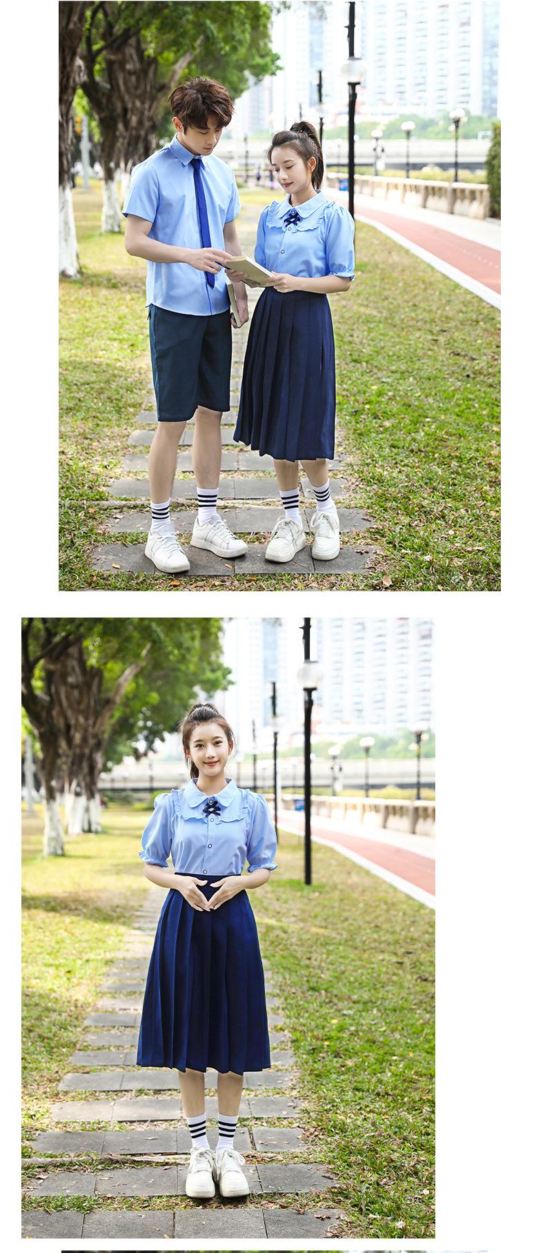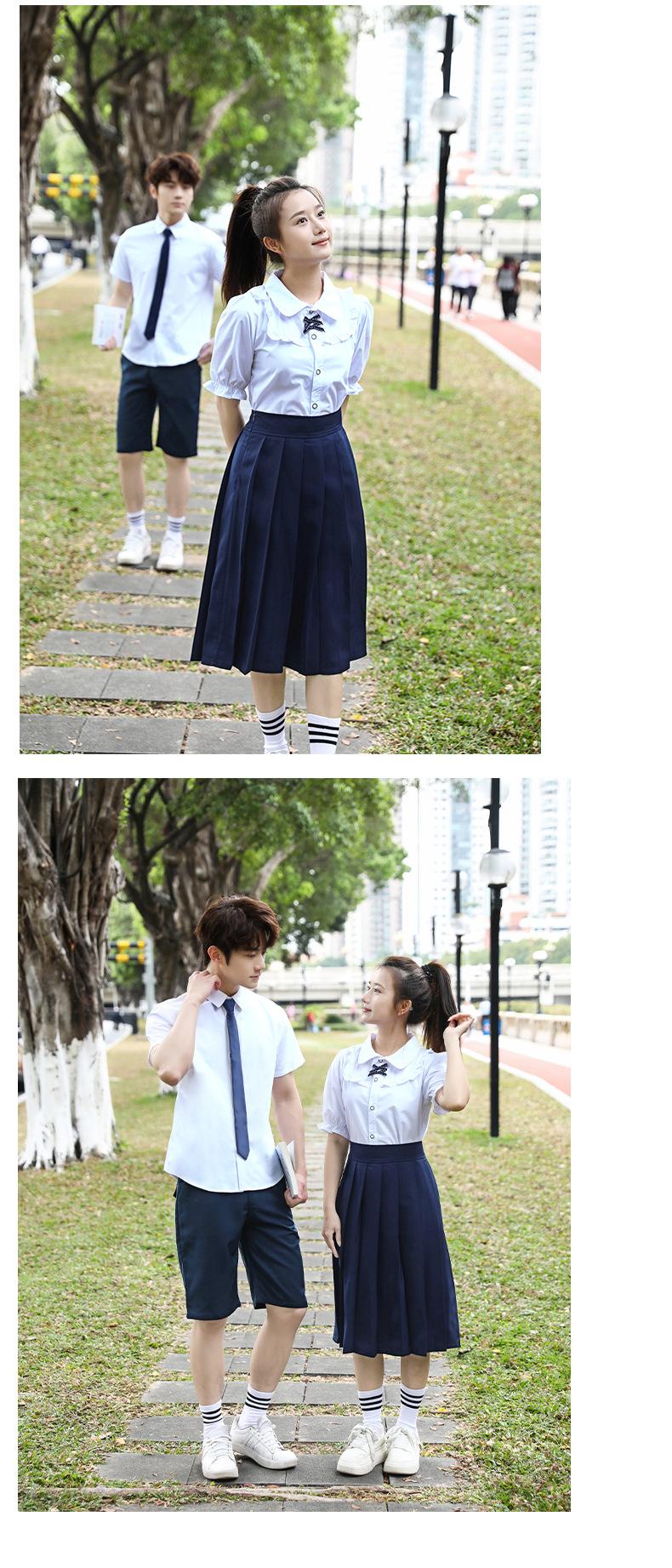 Women's bow tie white short sleeves + blue long skirt, Men's white short sleeves + blue shorts + blue tie, Wom...