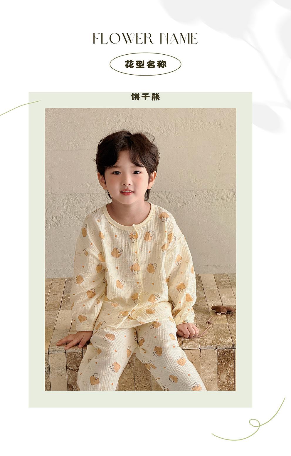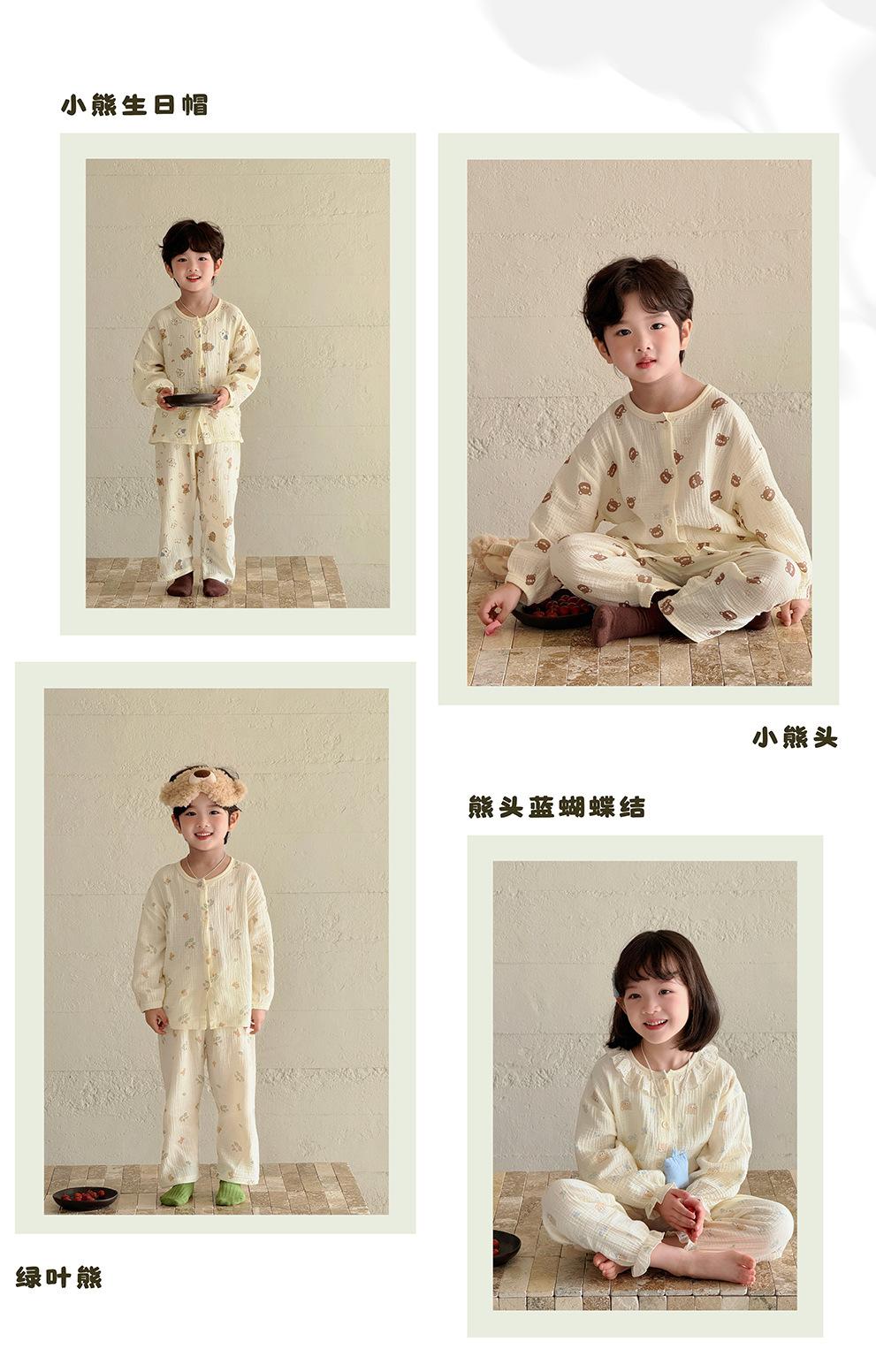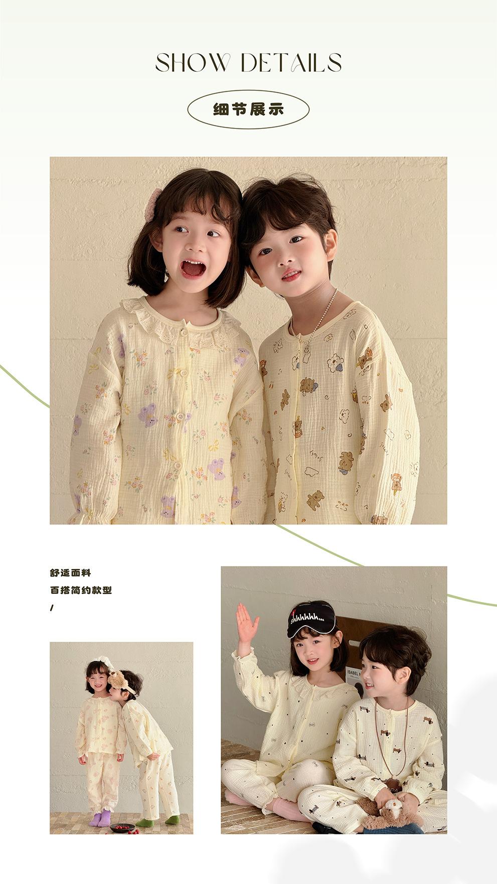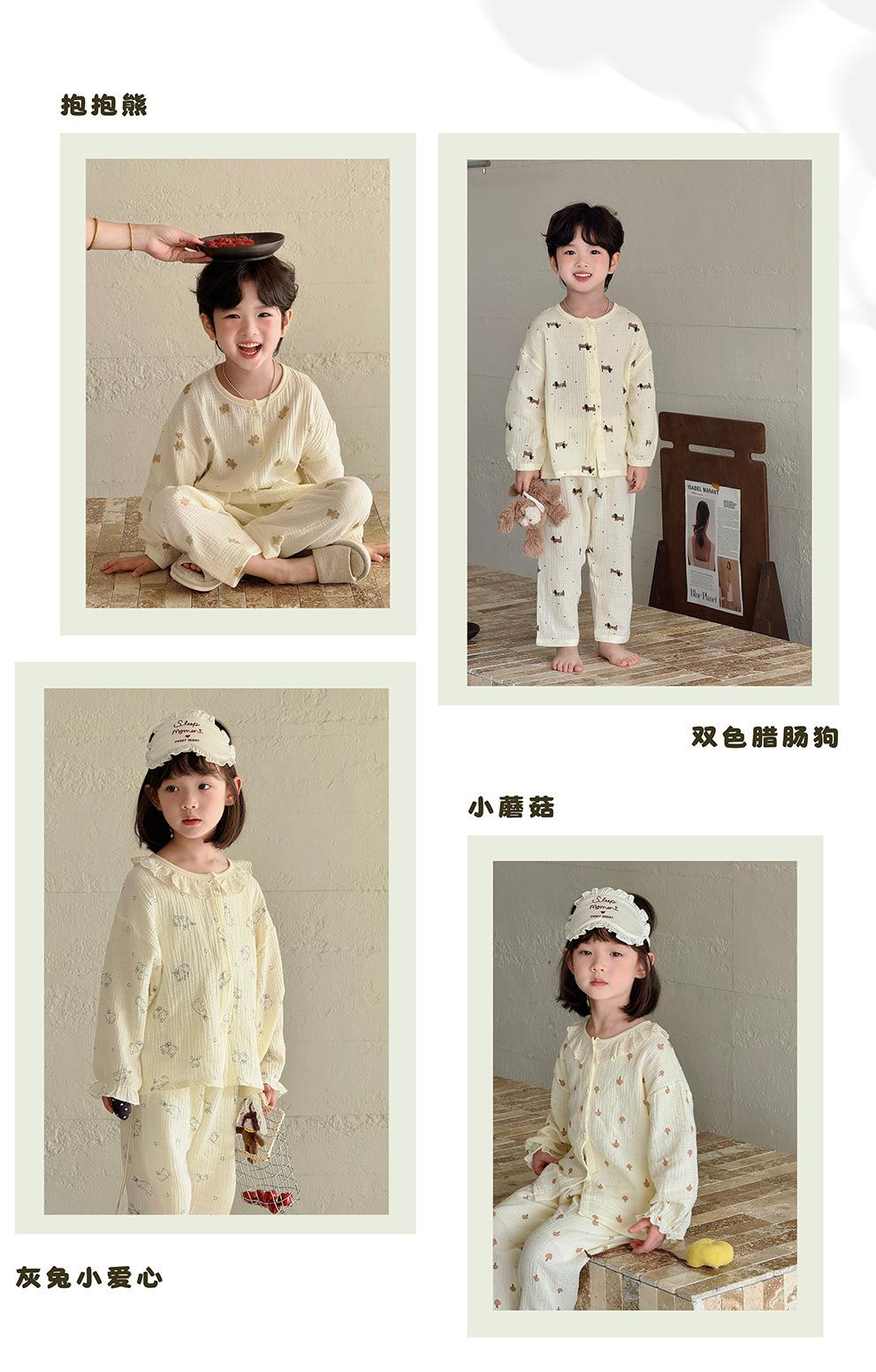 Pijamas de primavera y verano para niños, ropa de casa de gasa doble con dibujos animados de clase A, pijamas de hilo de algodón para niños y niñas.
