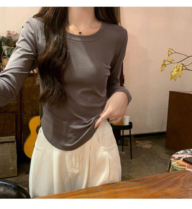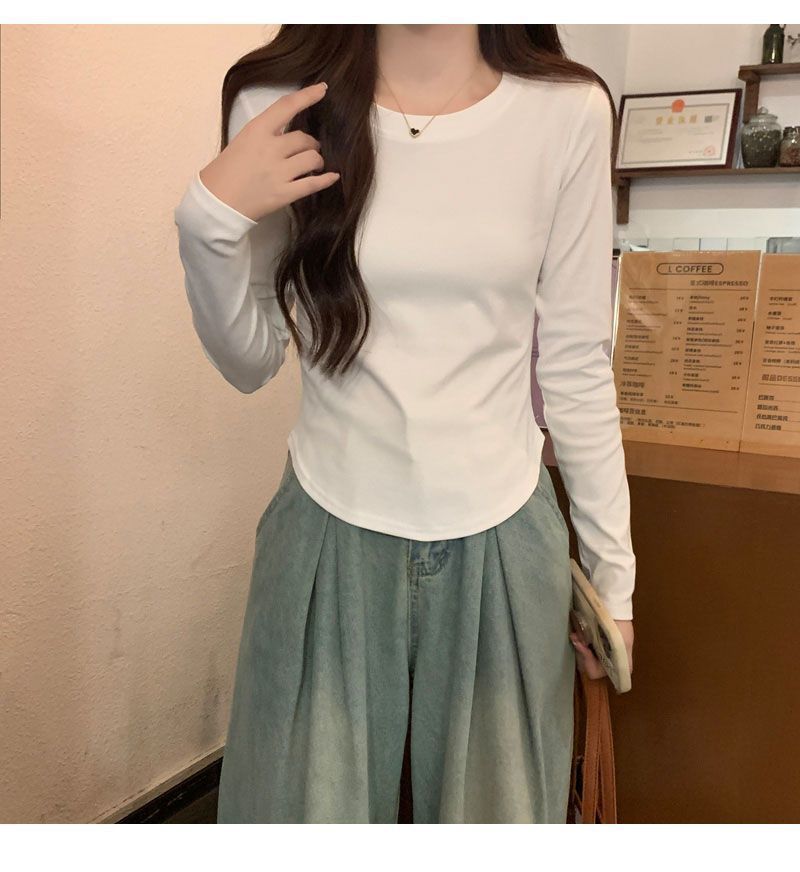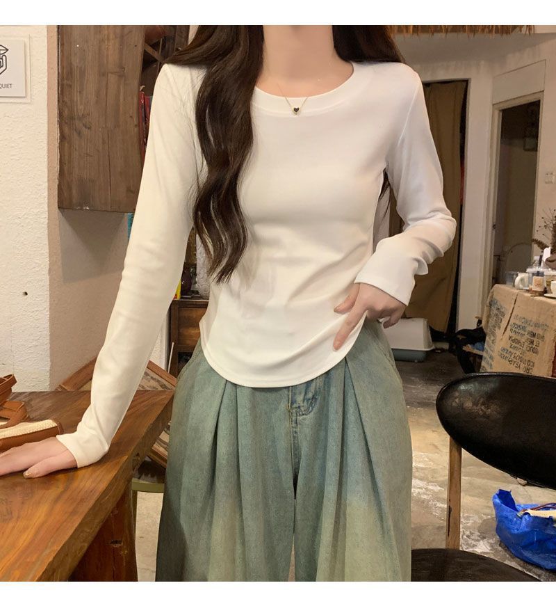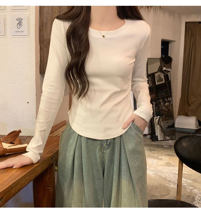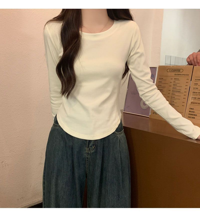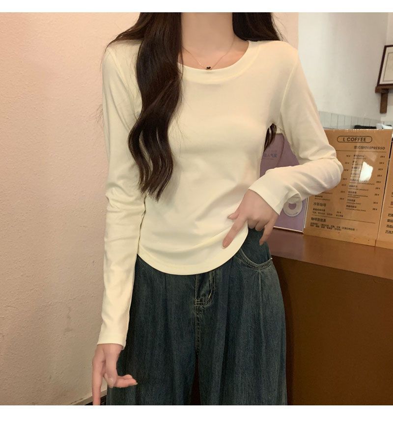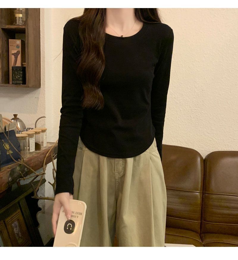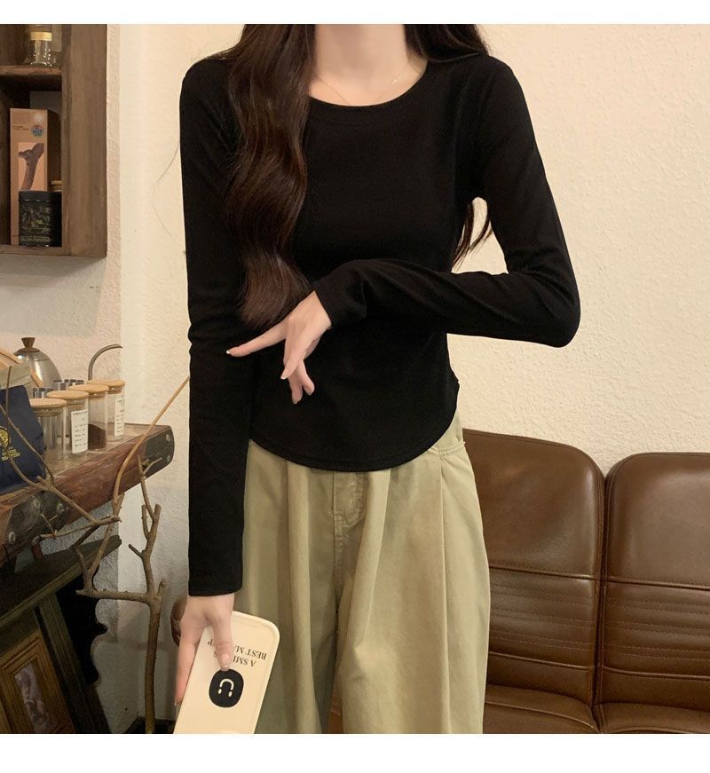 Camiseta básica de cuello redondo 2025, corte ajustado corto, camisa de manga larga para mujer, otoño e invierno, color puro, top curvo