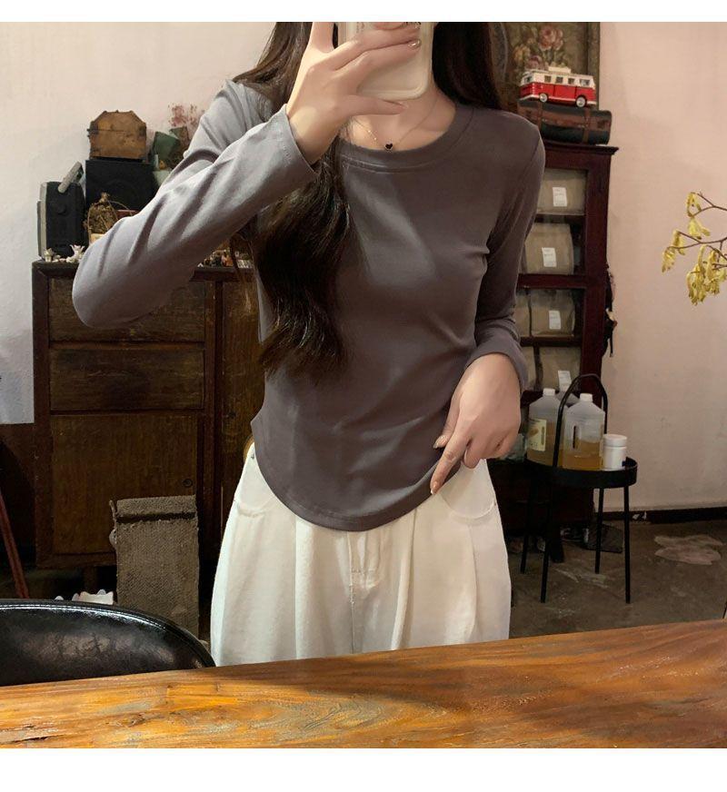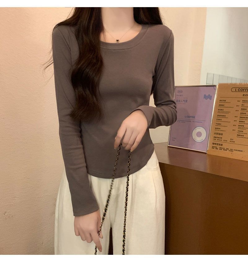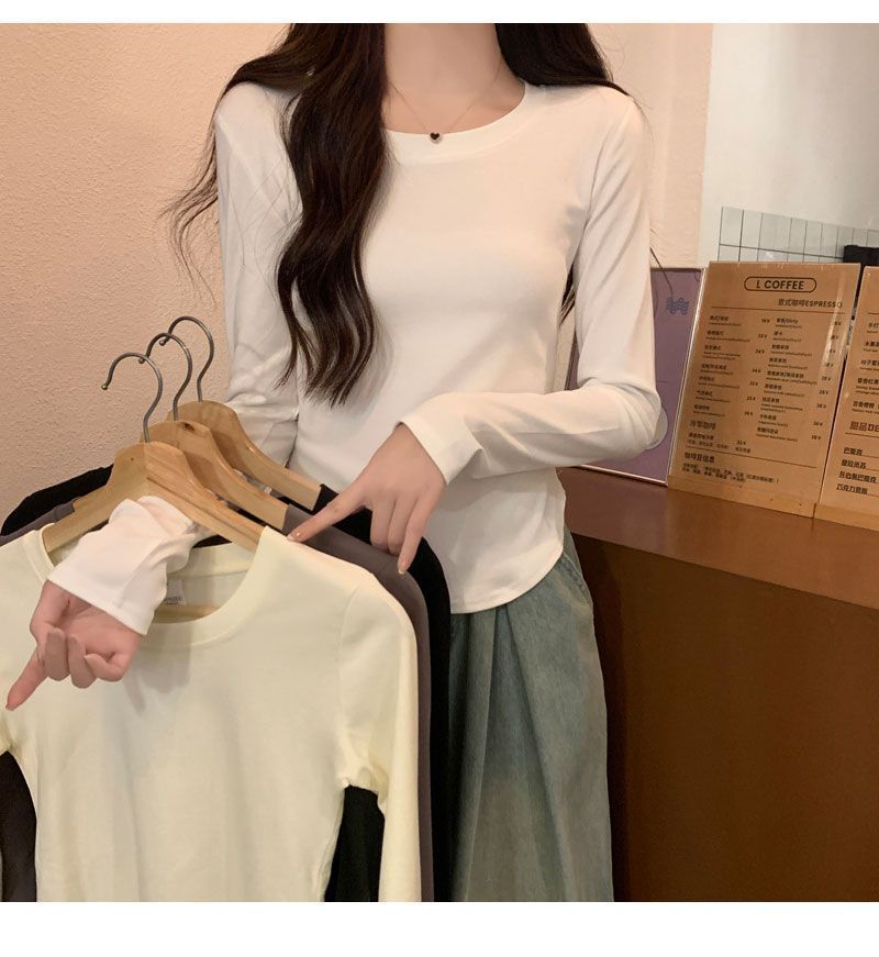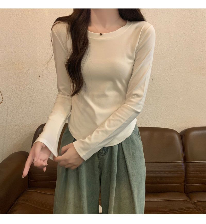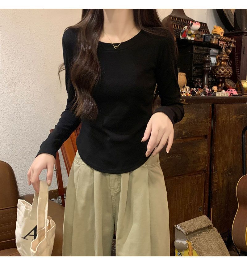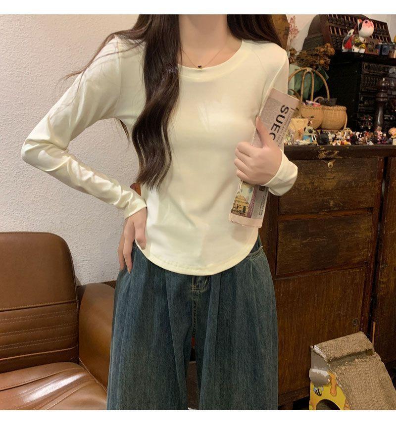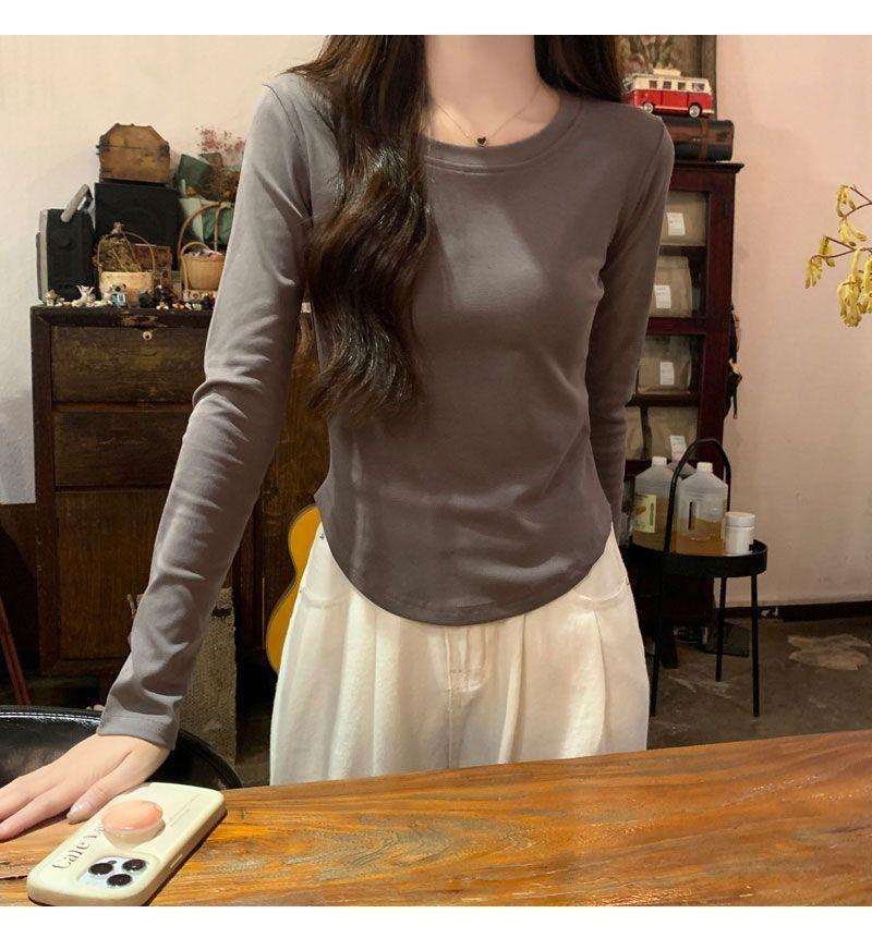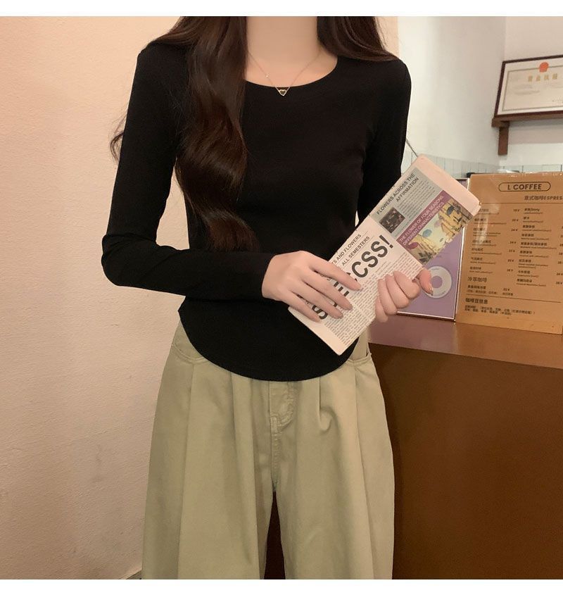 Camiseta básica de cuello redondo 2025, corte ajustado corto, camisa de manga larga para mujer, otoño e invierno, color puro, top curvo