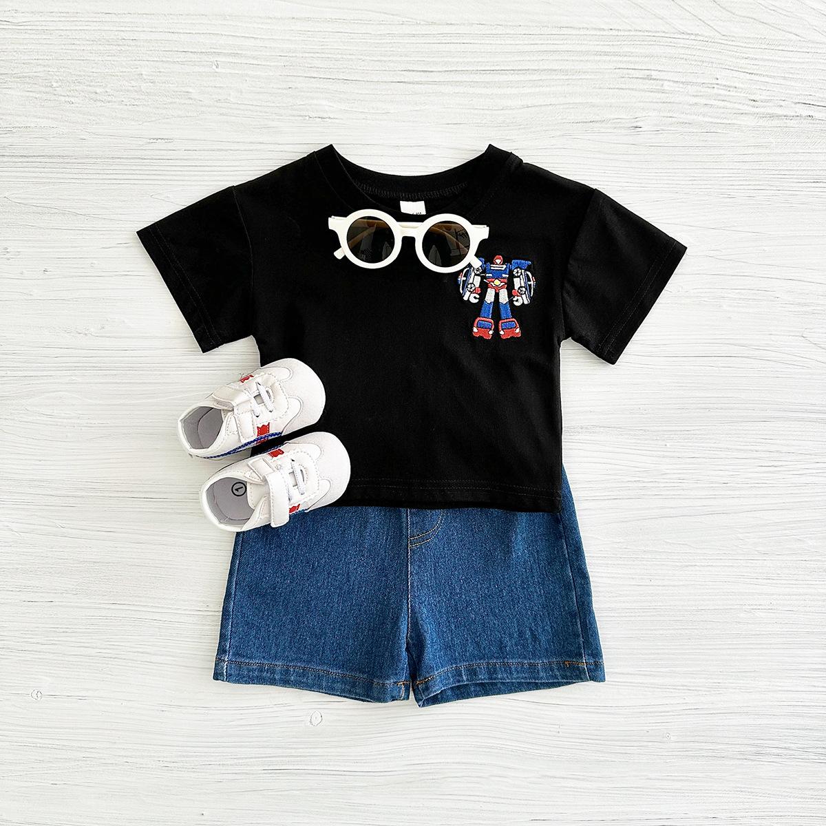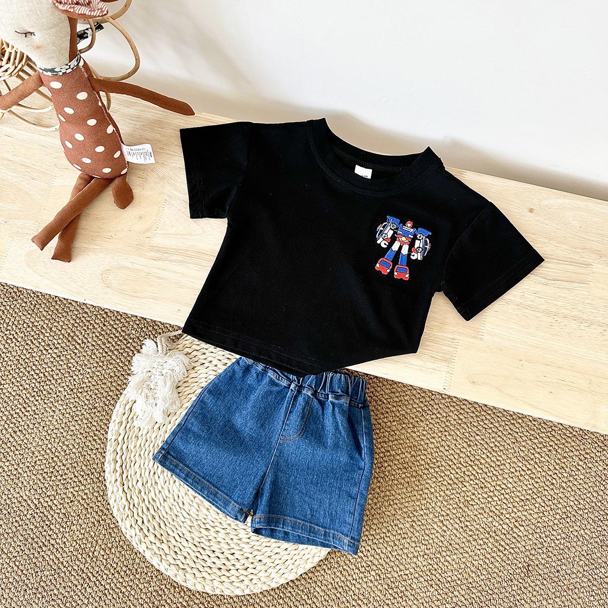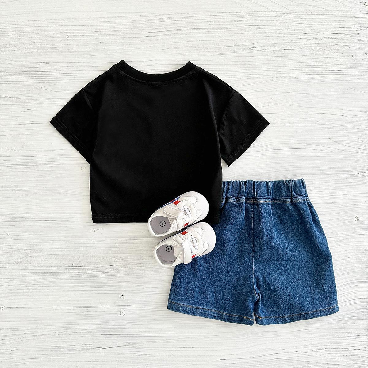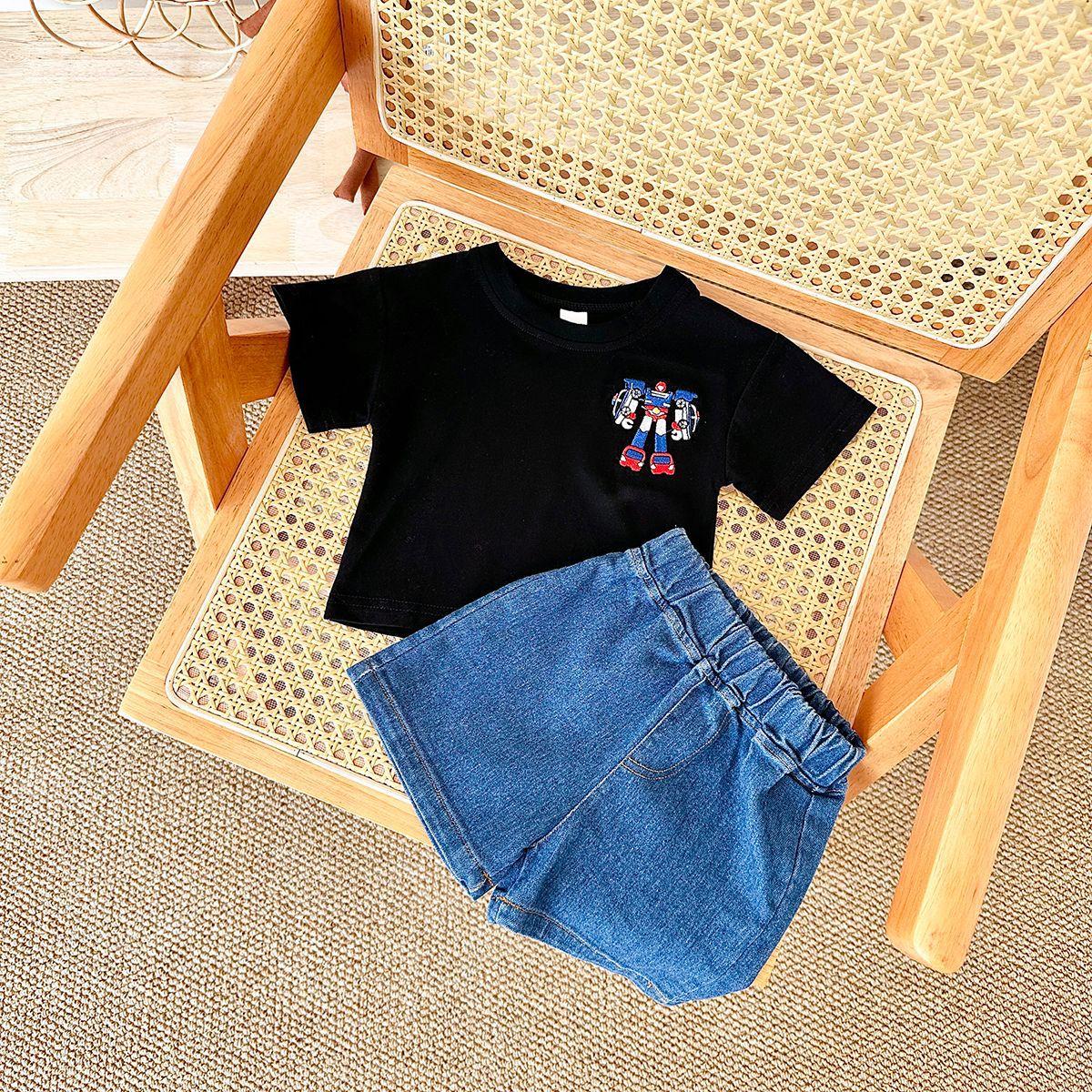 Traje de verano Bordado de dibujos animados Cuello redondo Manga corta Negro Shorts de mezclilla Ropa casual deportiva para bebé y niño