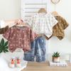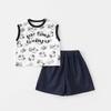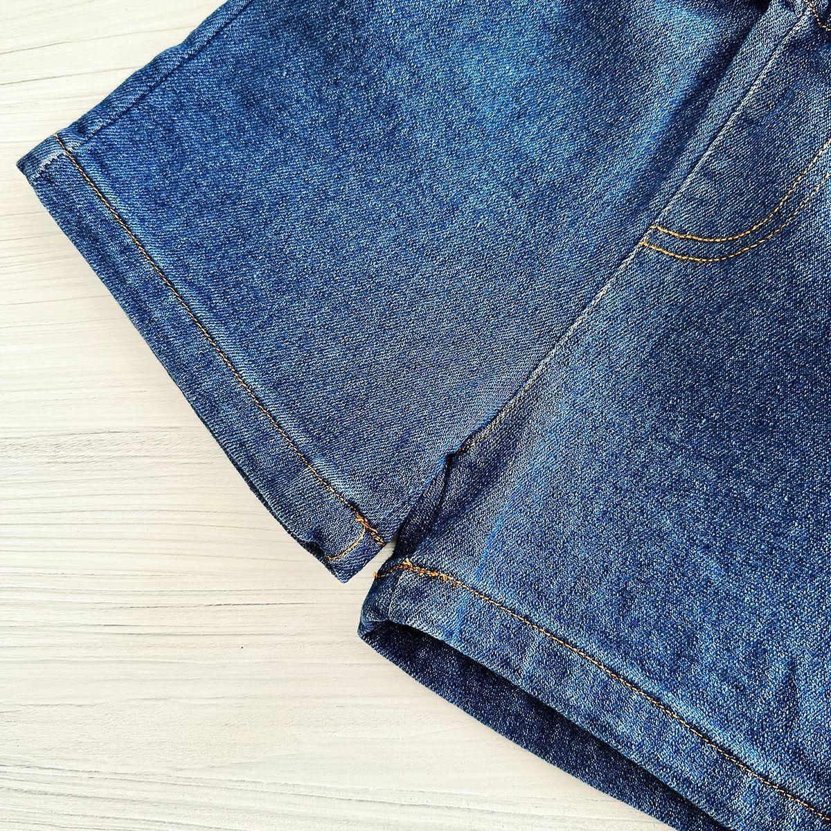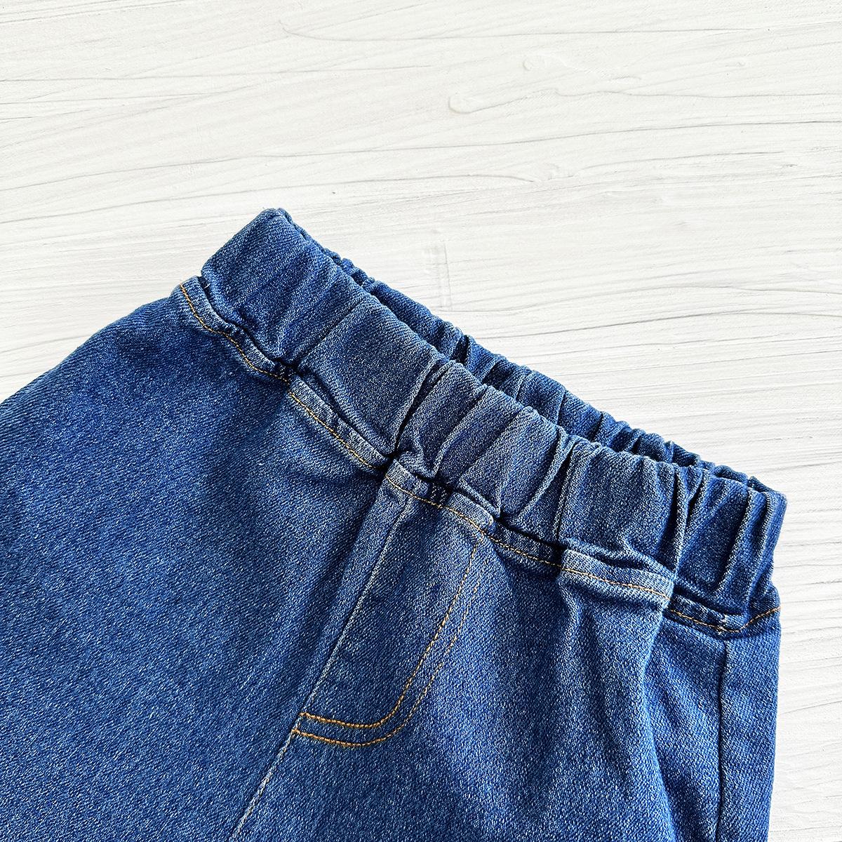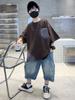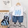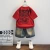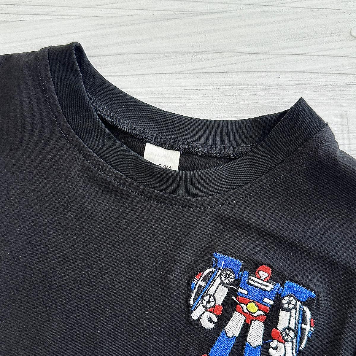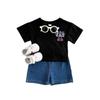 Traje de verano Bordado de dibujos animados Cuello redondo Manga corta Negro Shorts de mezclilla Ropa casual deportiva para bebé y niño