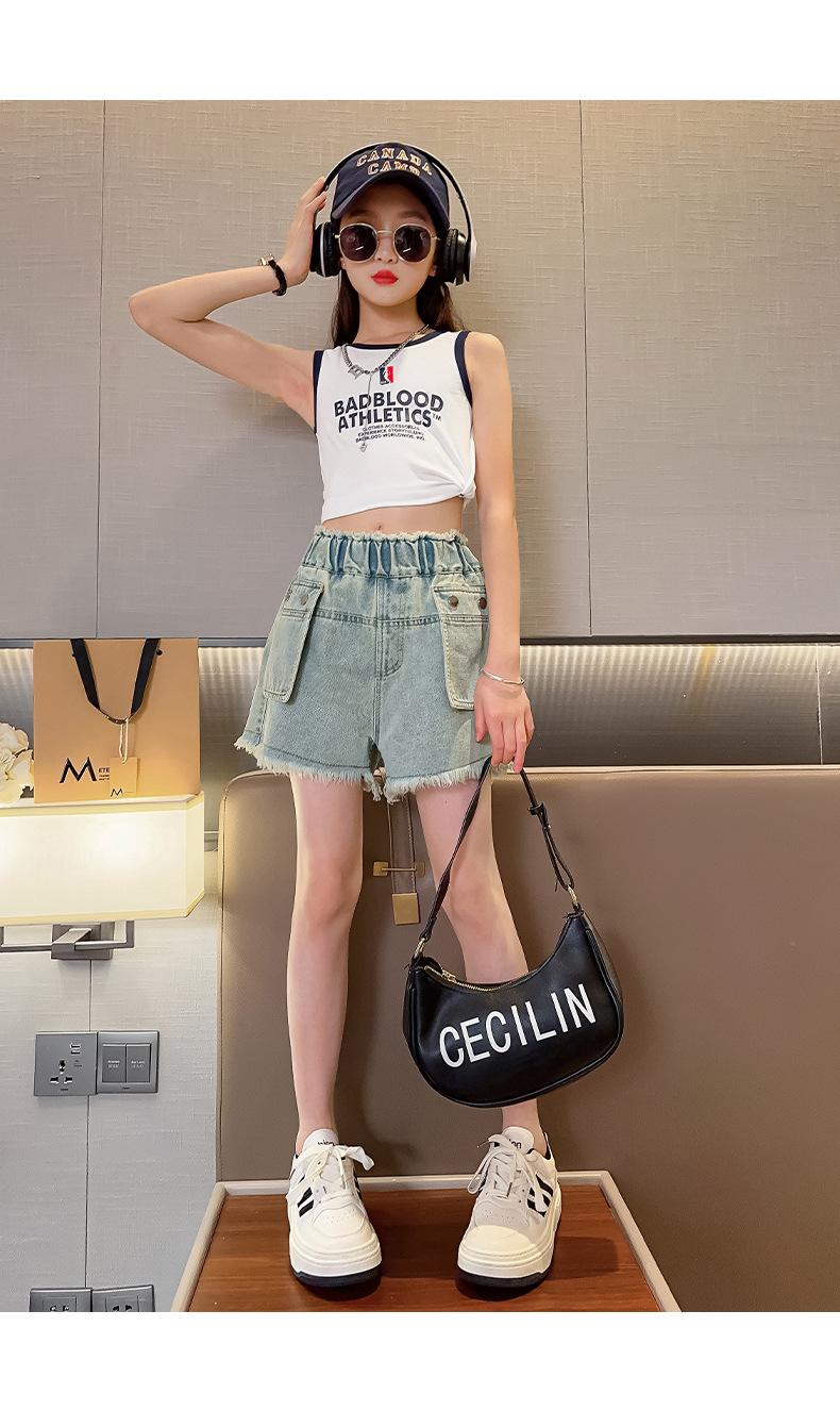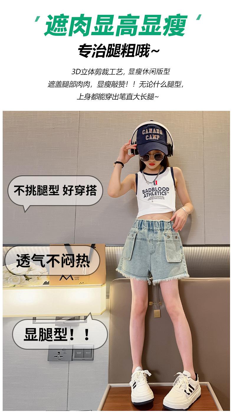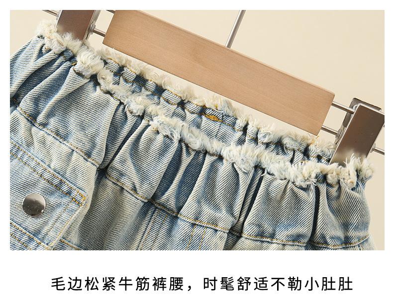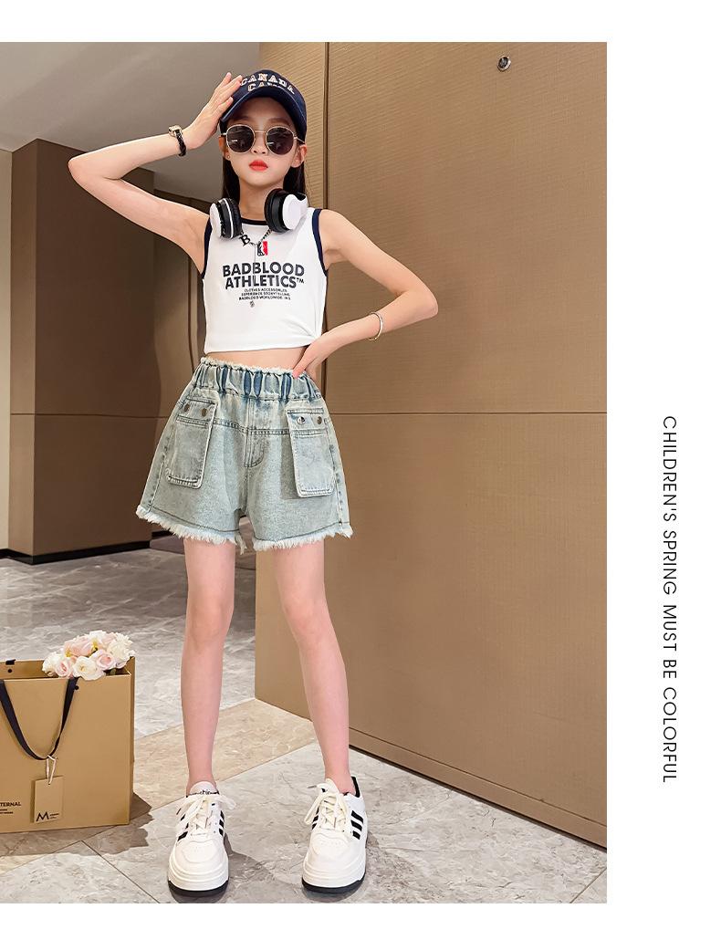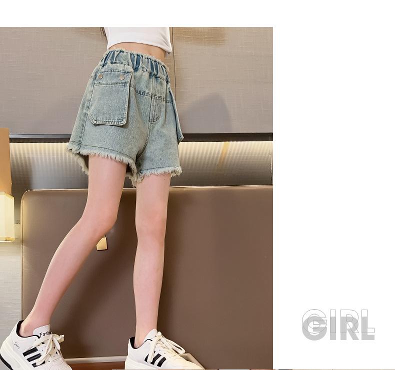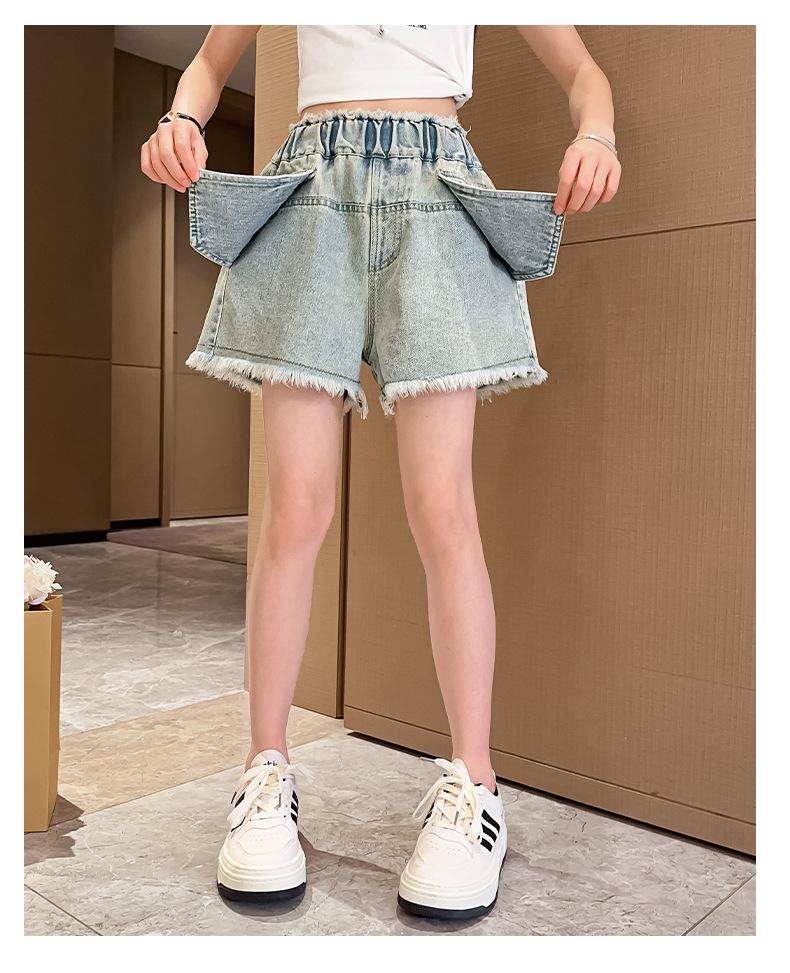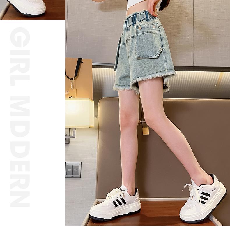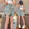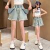 Shorts de mezclilla para niñas Verano 2025 Nuevo conjunto de pantalones delgados para niños para niñas mayores, shorts hasta la rodilla para uso veraniego