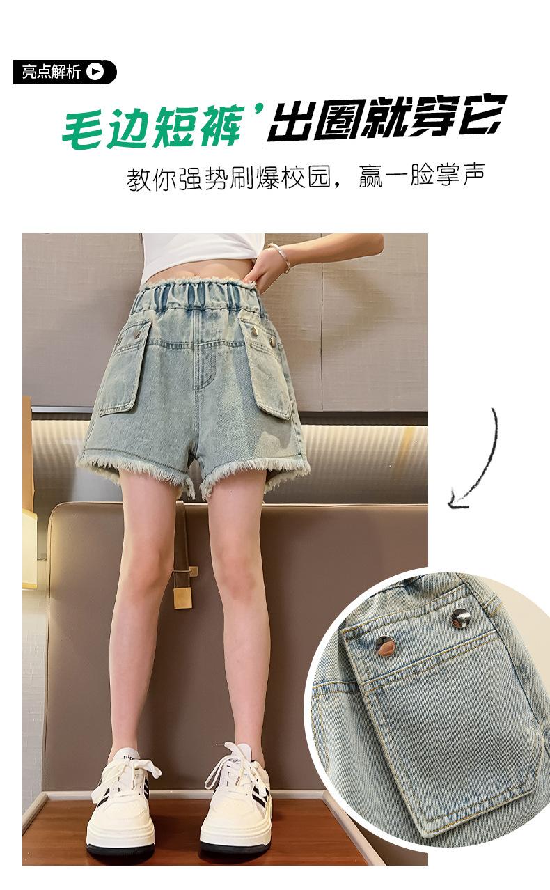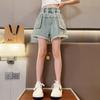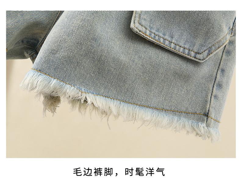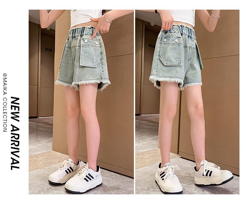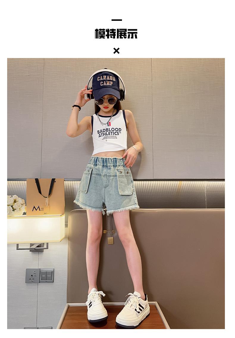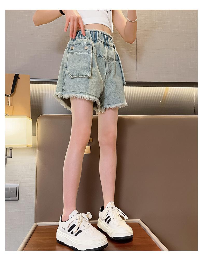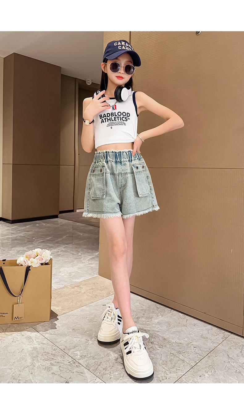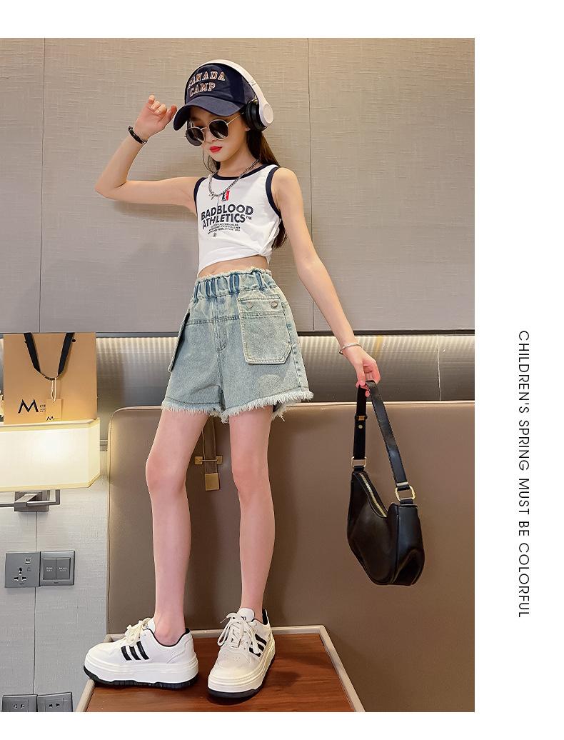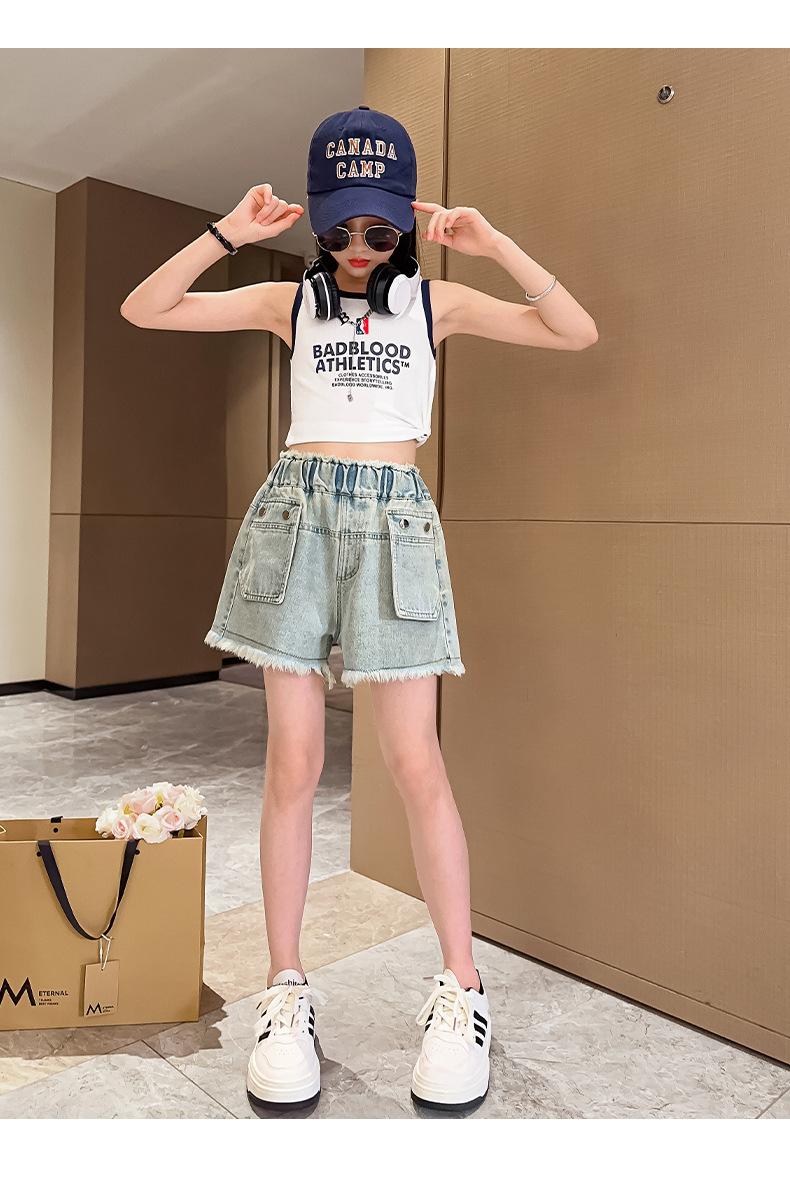 Shorts de mezclilla para niñas Verano 2025 Nuevo conjunto de pantalones delgados para niños para niñas mayores, shorts hasta la rodilla para uso veraniego