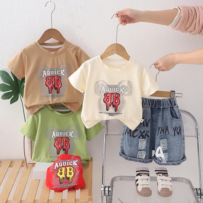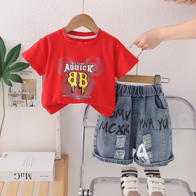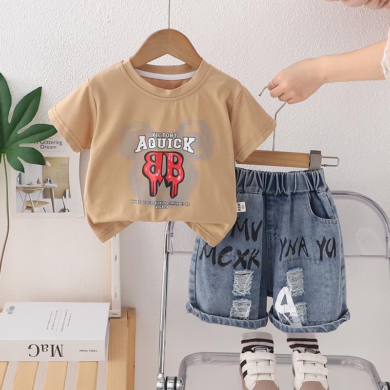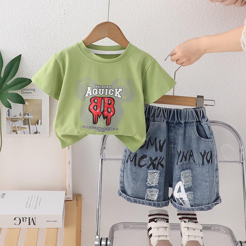Traje de verano para niños 2025, nueva y atractiva ropa para niños, ropa de verano de manga corta vaquera para niños.