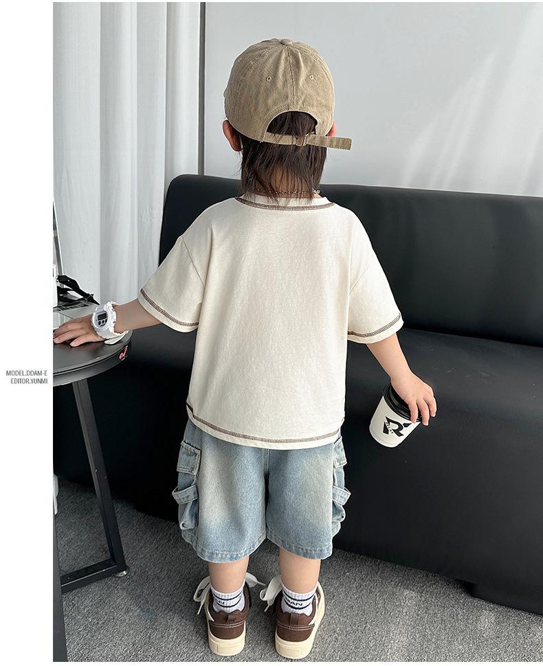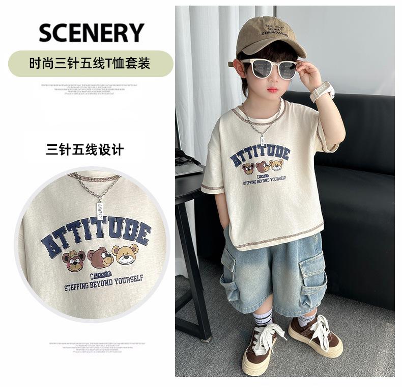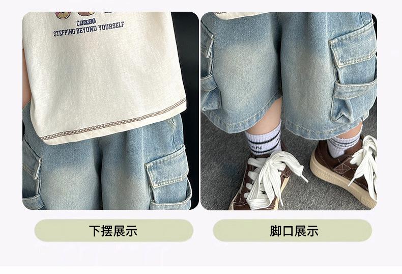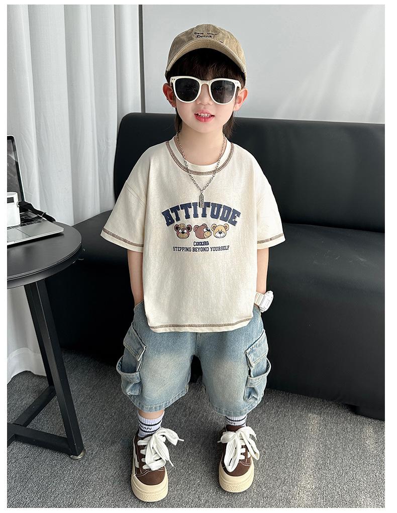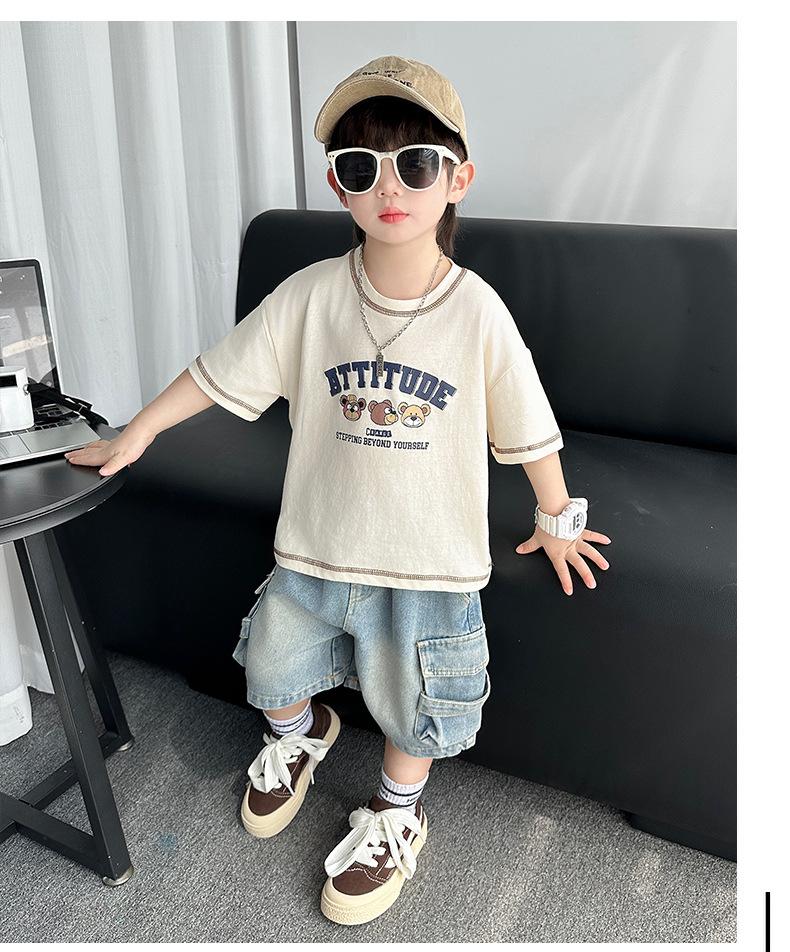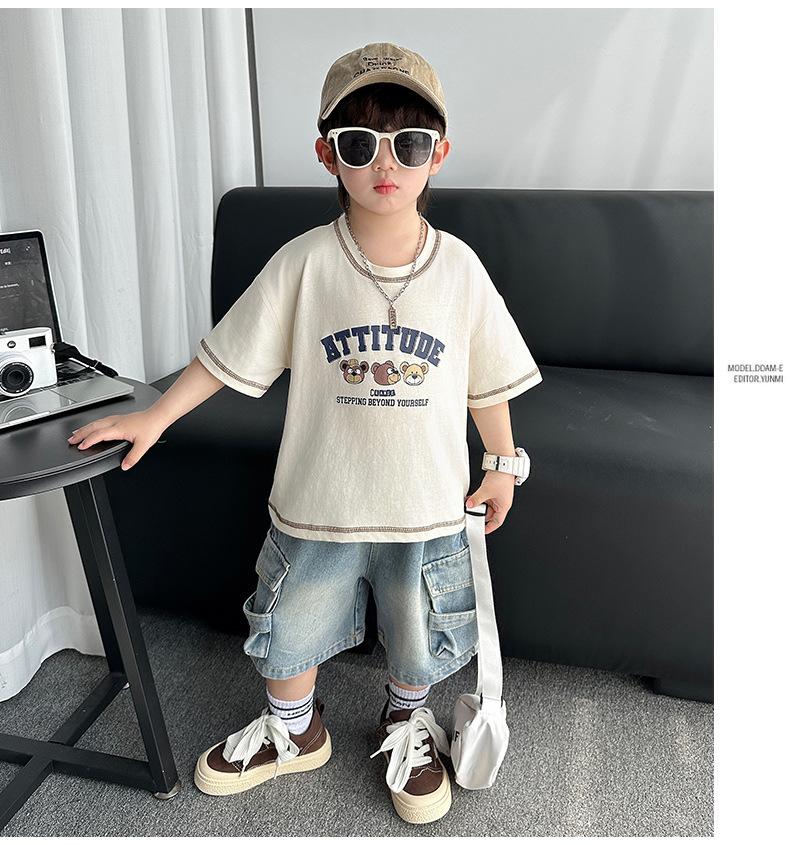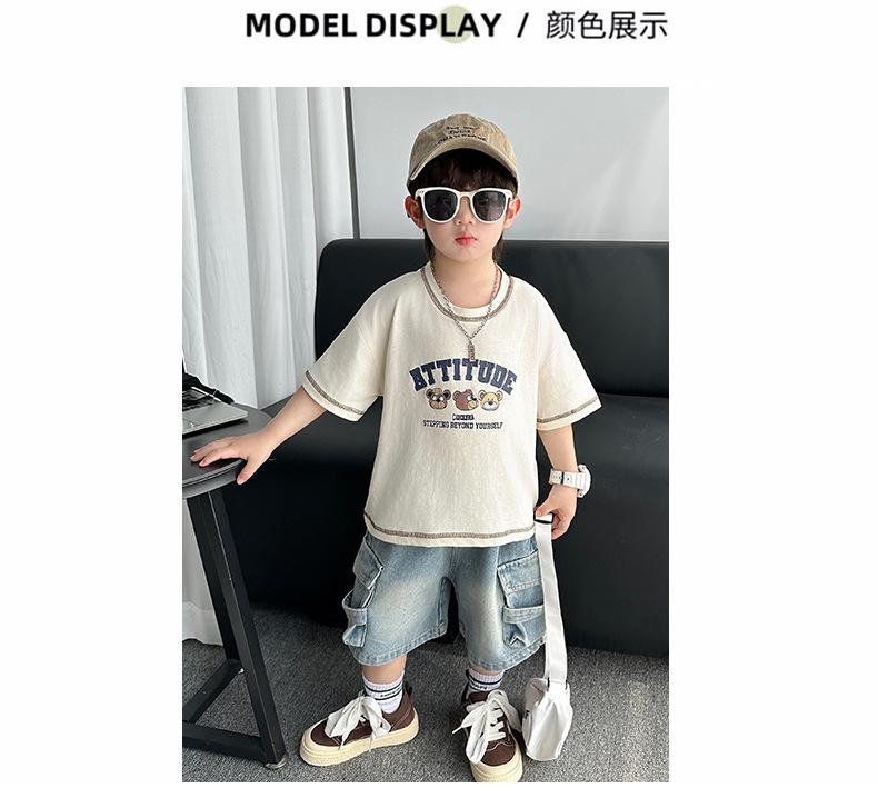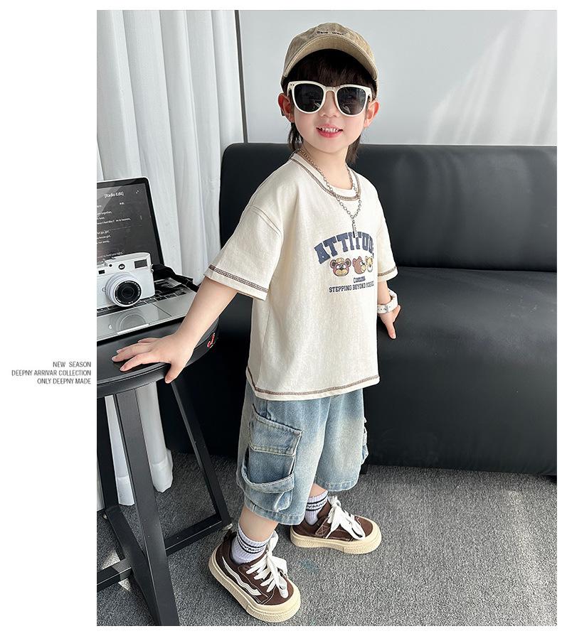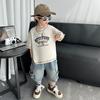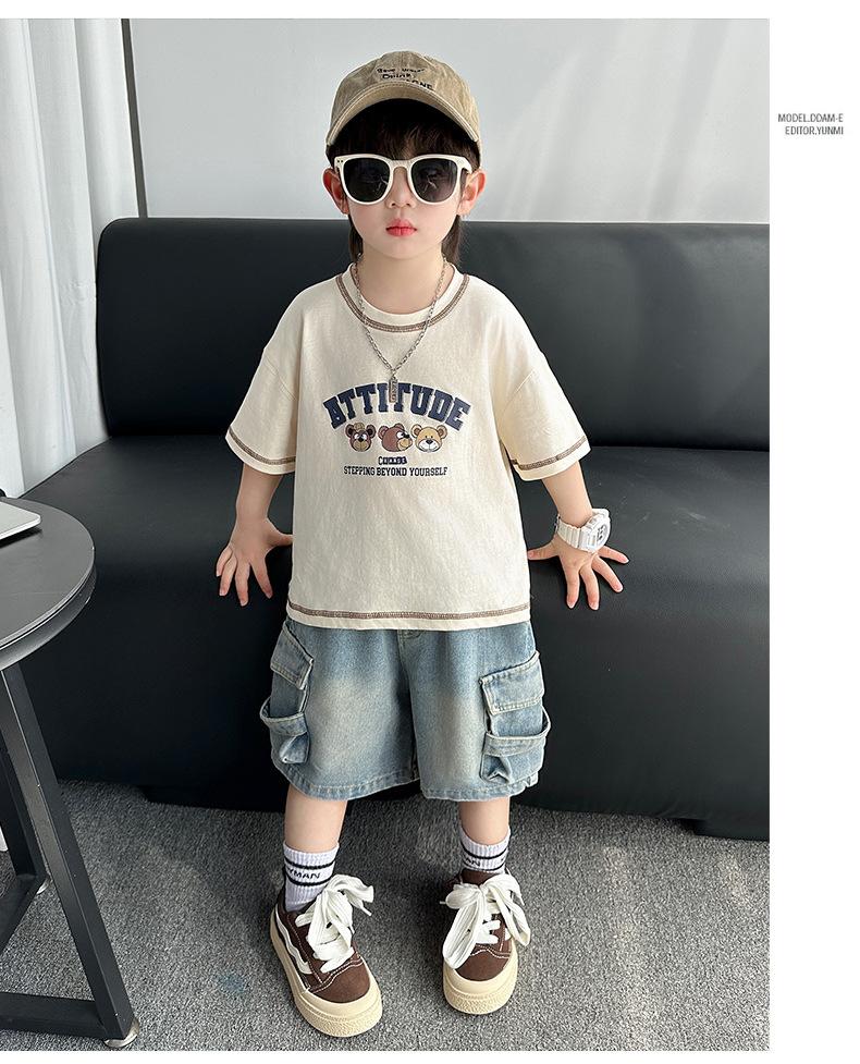 Traje de verano para niños 2025, nuevo conjunto de dos piezas de pantalones cortos vaqueros de manga corta para niños, ropa de verano atractiva para bebés a la moda.