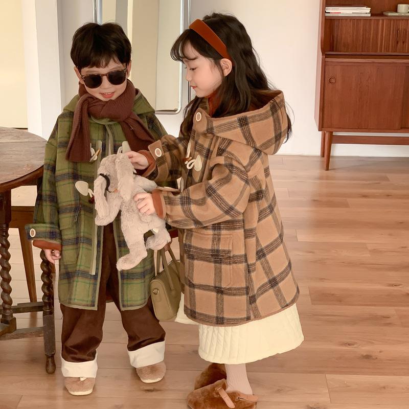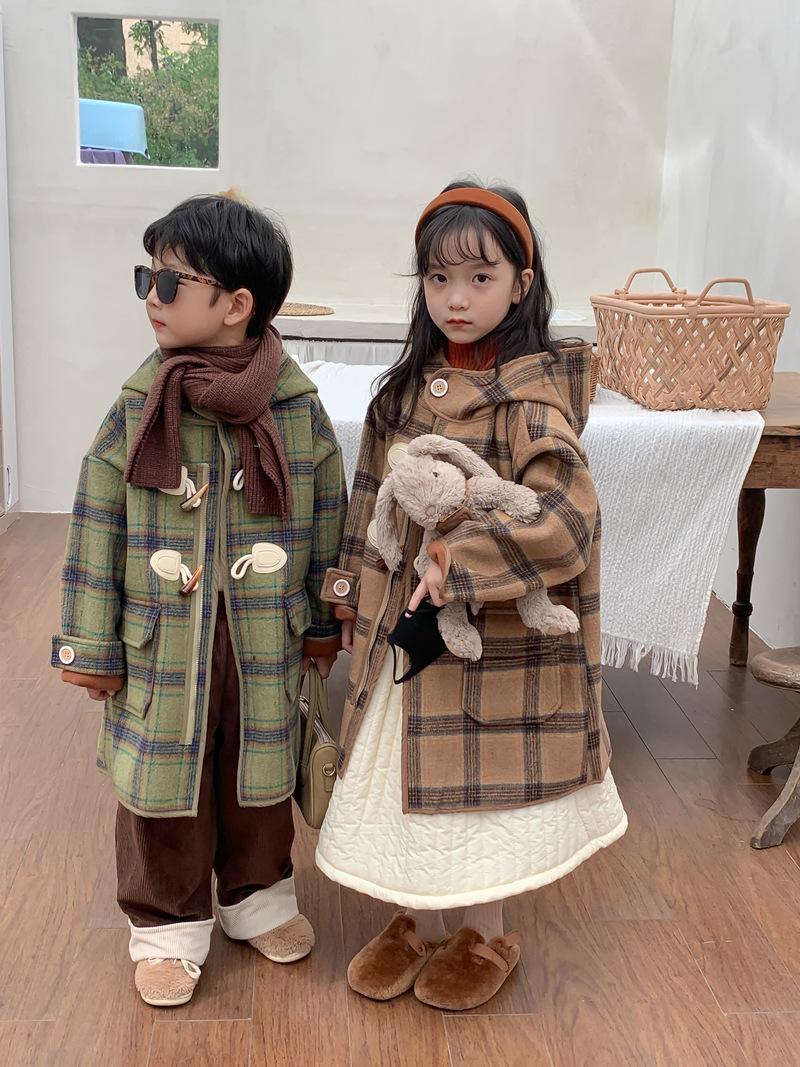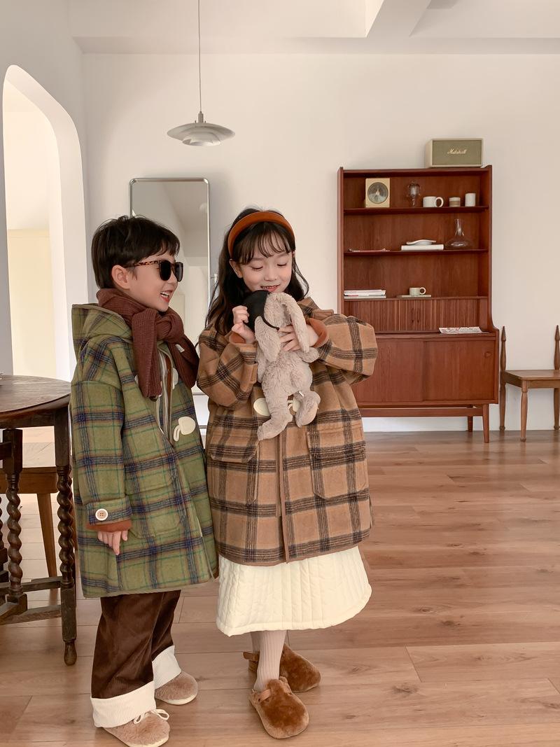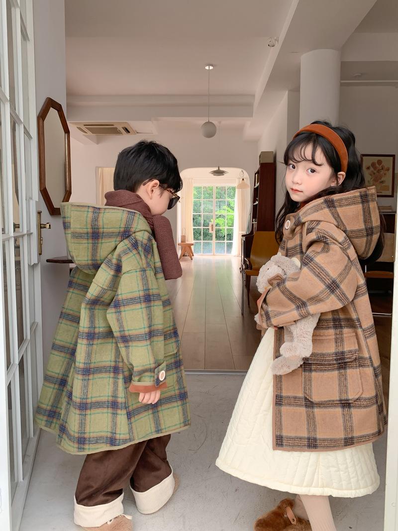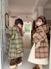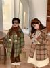 Ropa exterior infantil 2025 Estilo de invierno Estilo coreano Con capucha A cuadros Una pieza Chaqueta de terciopelo para niños y niñas, Cortavientos infantil grueso de longitud media