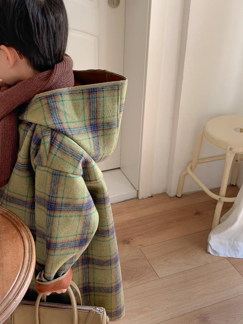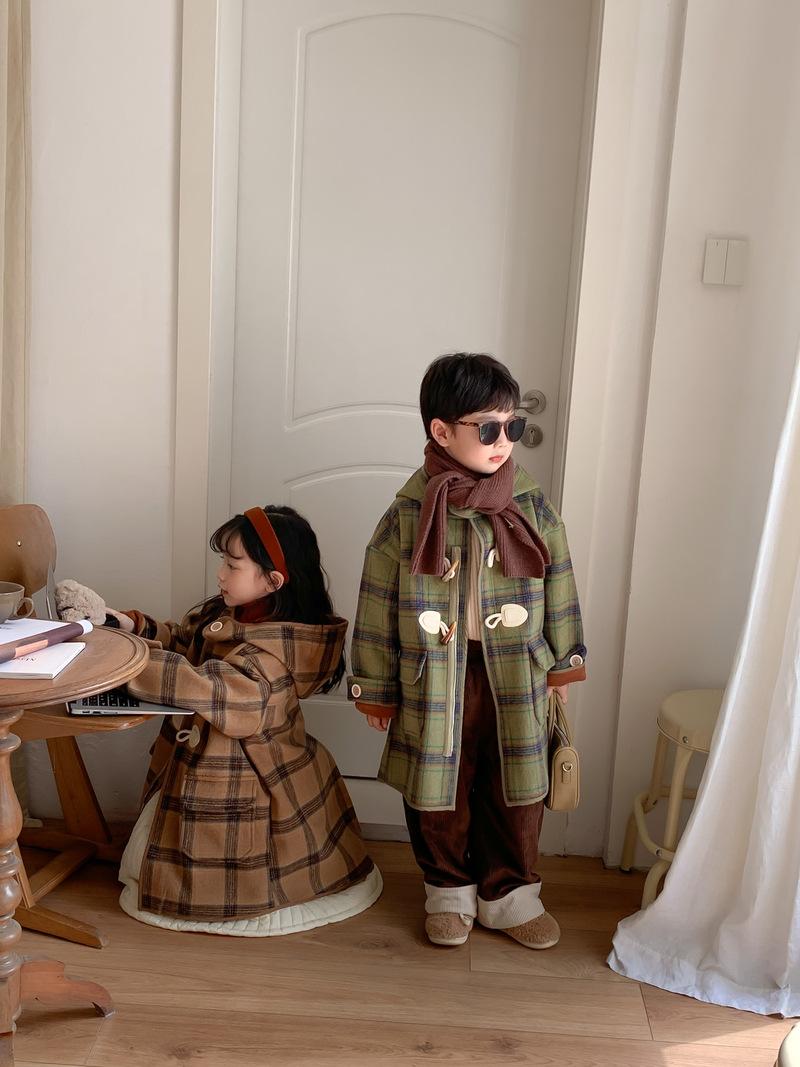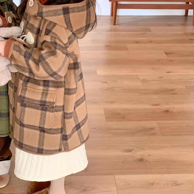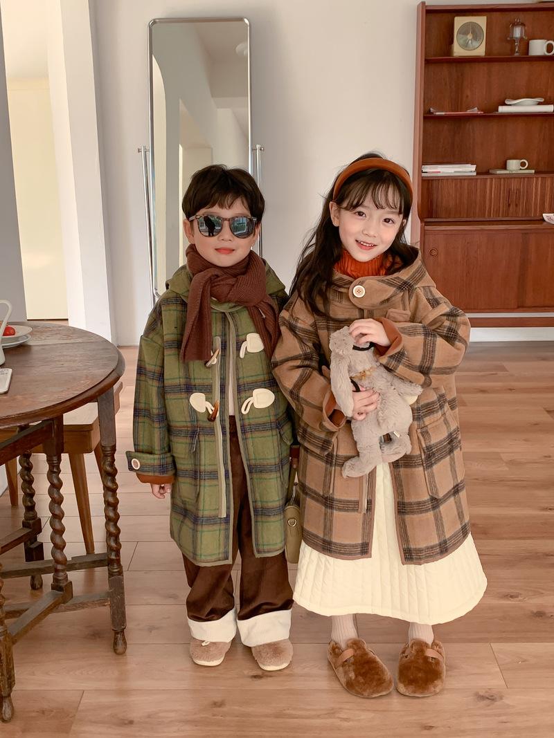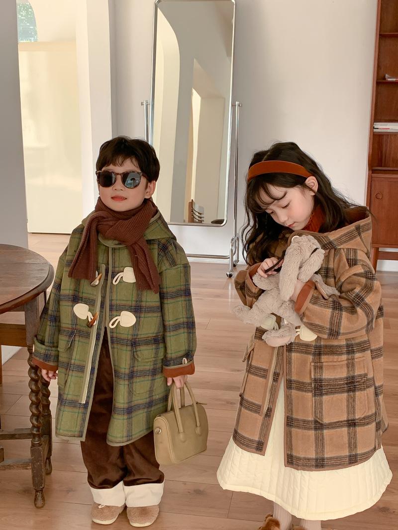 Ropa exterior infantil 2025 Estilo de invierno Estilo coreano Con capucha A cuadros Una pieza Chaqueta de terciopelo para niños y niñas, Cortavientos infantil grueso de longitud media