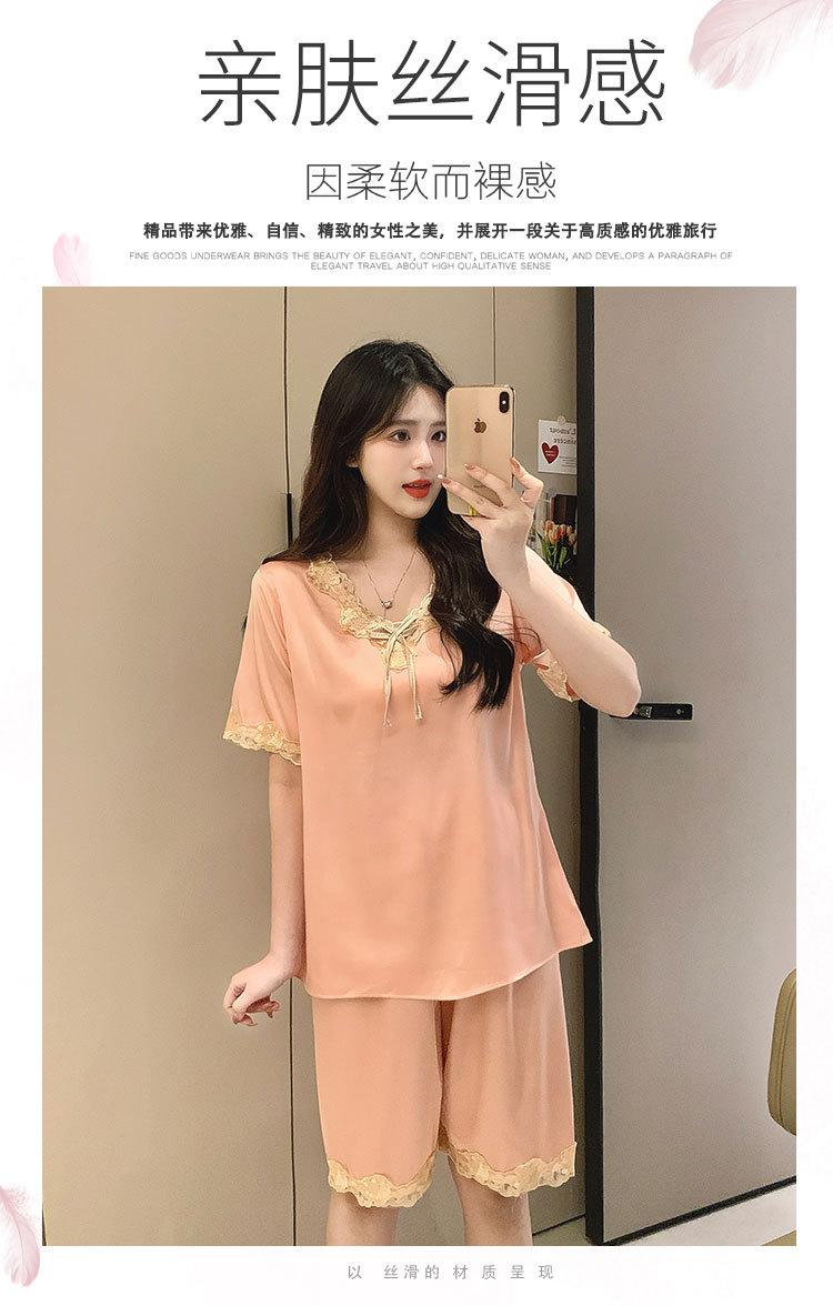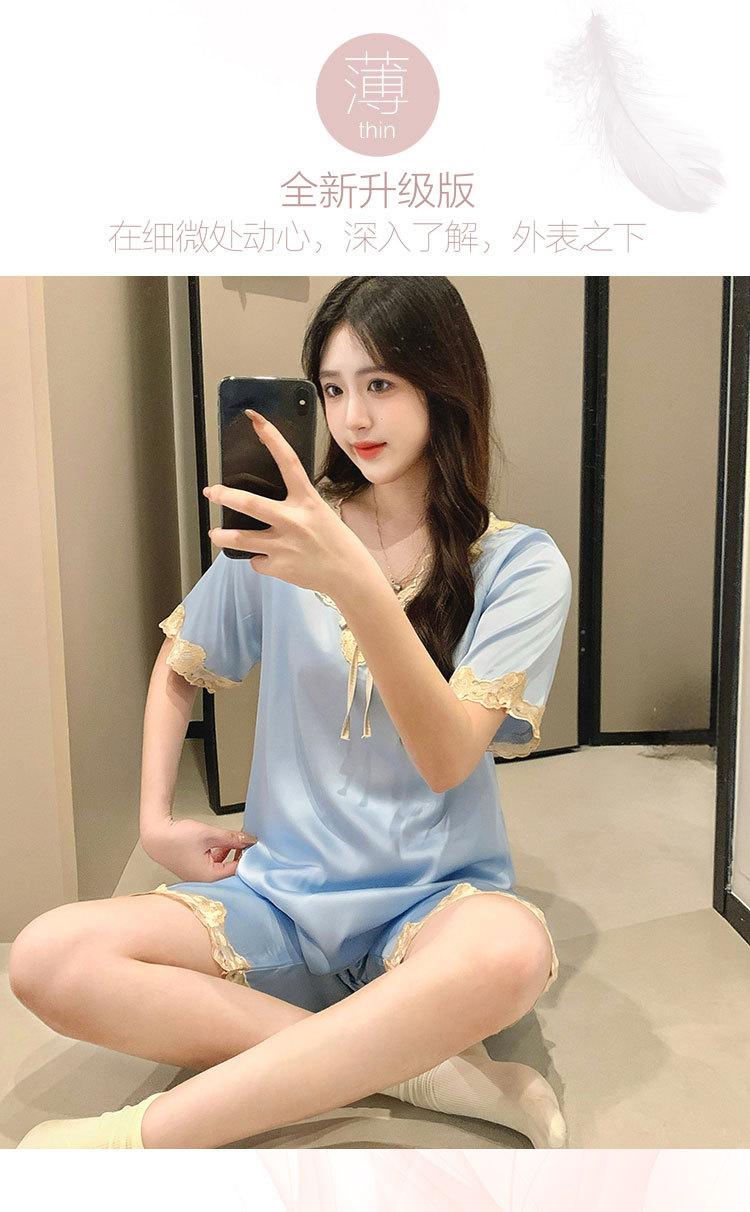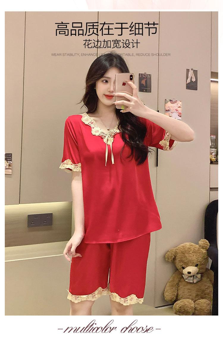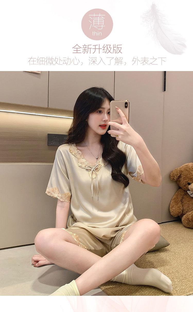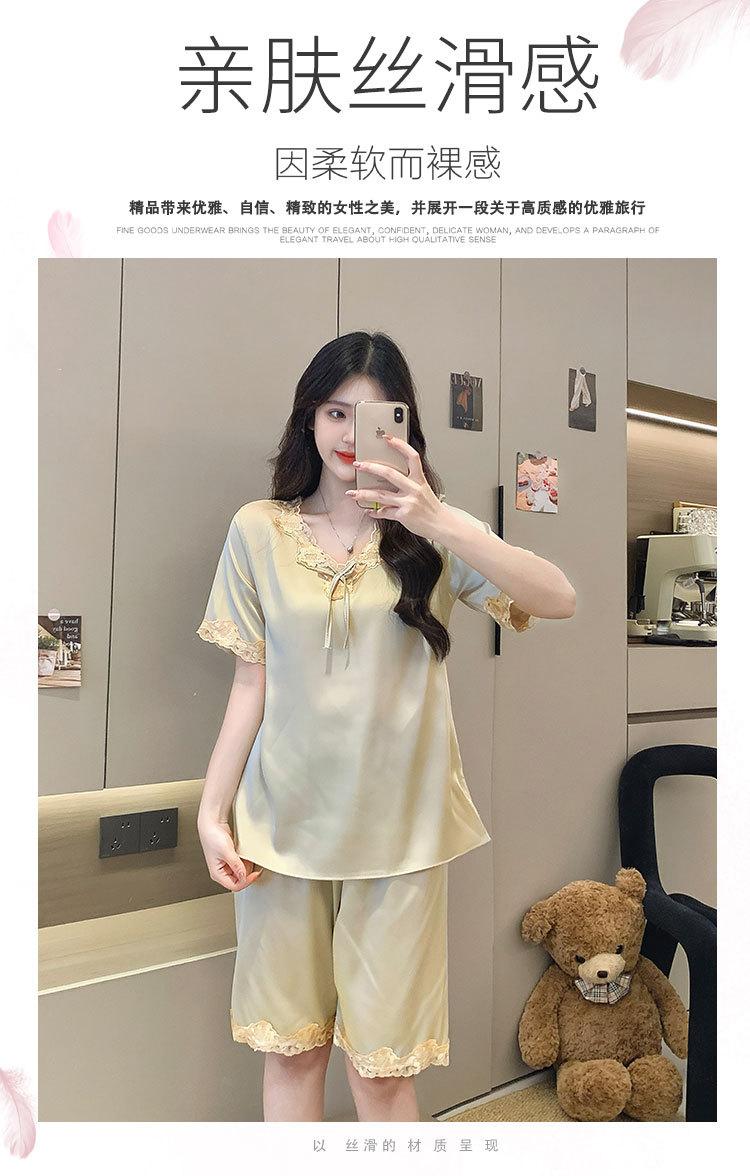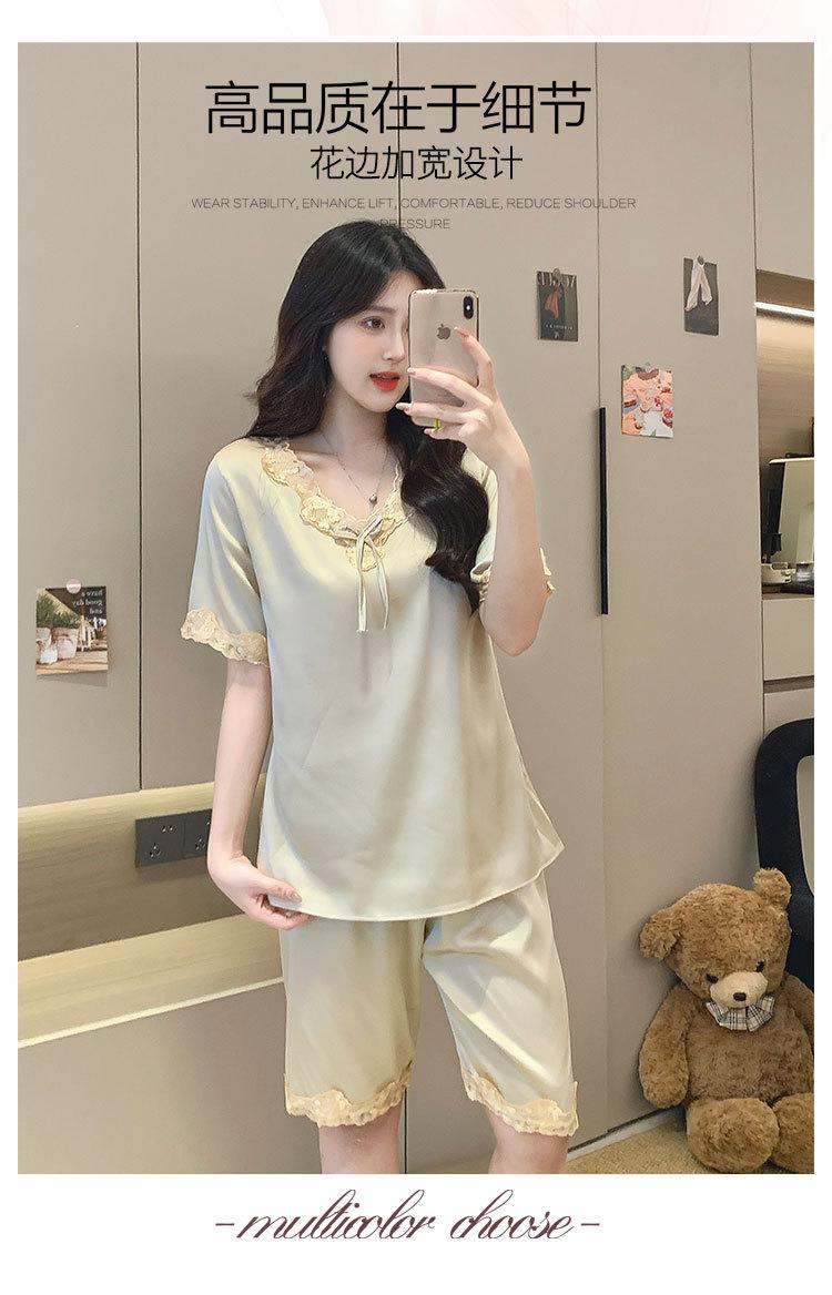 Pijama de Seda de Hielo para Mujer Verano Delgado Manga Corta Shorts Traje Cuello en V Seda de Hielo Estilo Coreano Talla Extra Jersey Ropa para el Hogar