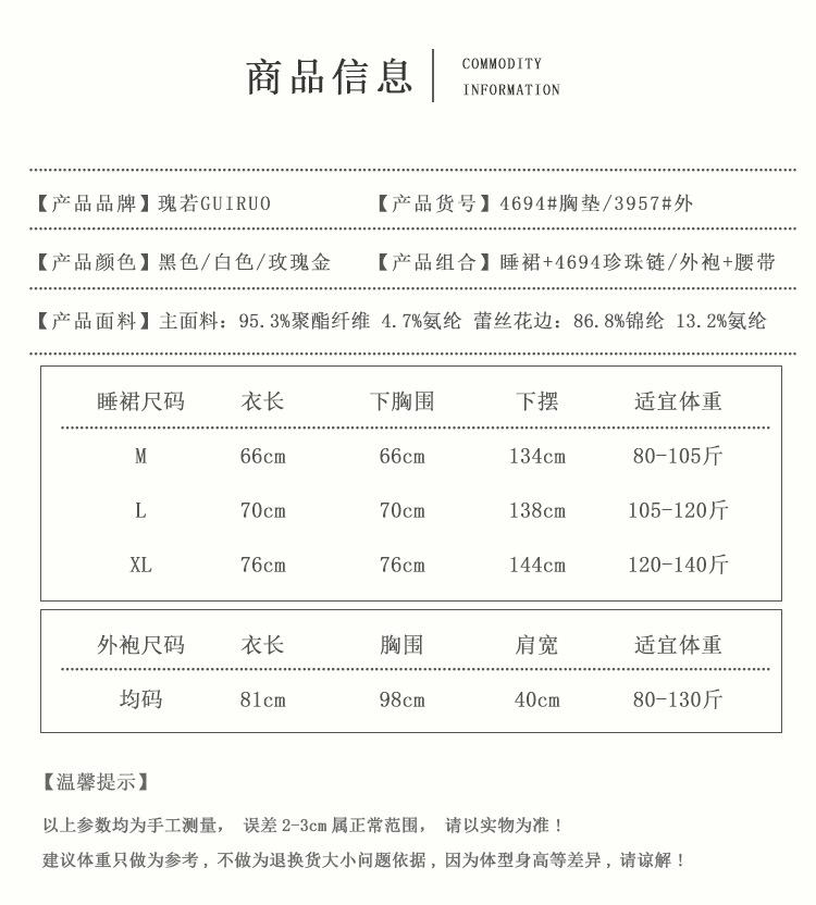 4694 black (nightgown + 4694 pearl chain), 3957 black (robe + belt), 4694 white (nightgown + 4694 pearl chain)...
