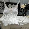 Pijama de seda helada de verano para mujer, pantalones cortos con tirantes Pure Desire, ropa de casa, pijama estampado, traje de encaje para niña, rosa y dulce