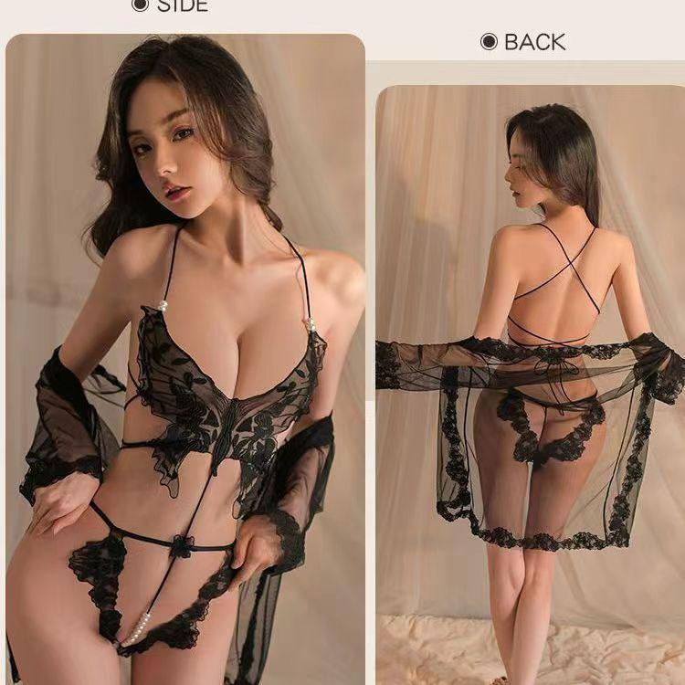 Lencería Sexy de Una Pieza de Tres Puntos Sexy Transparente Top Mariposa Blusa con Tirantes Traje