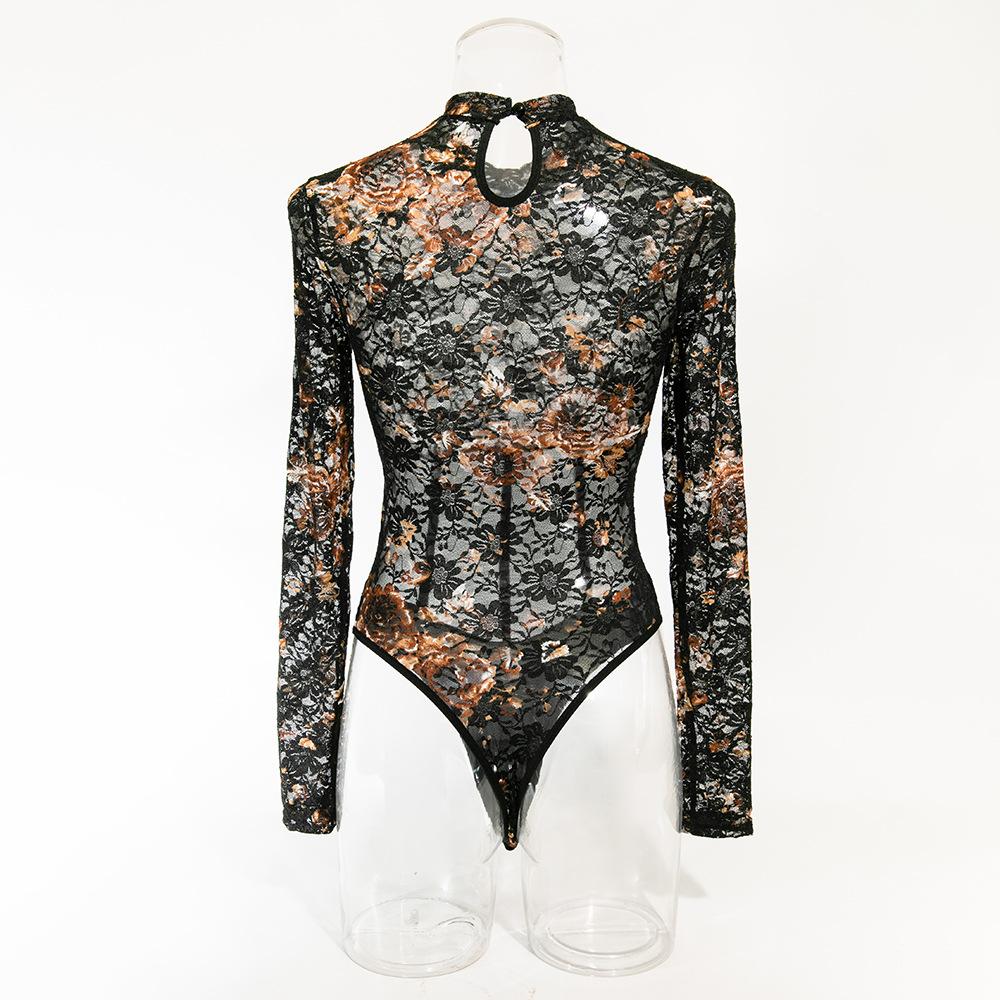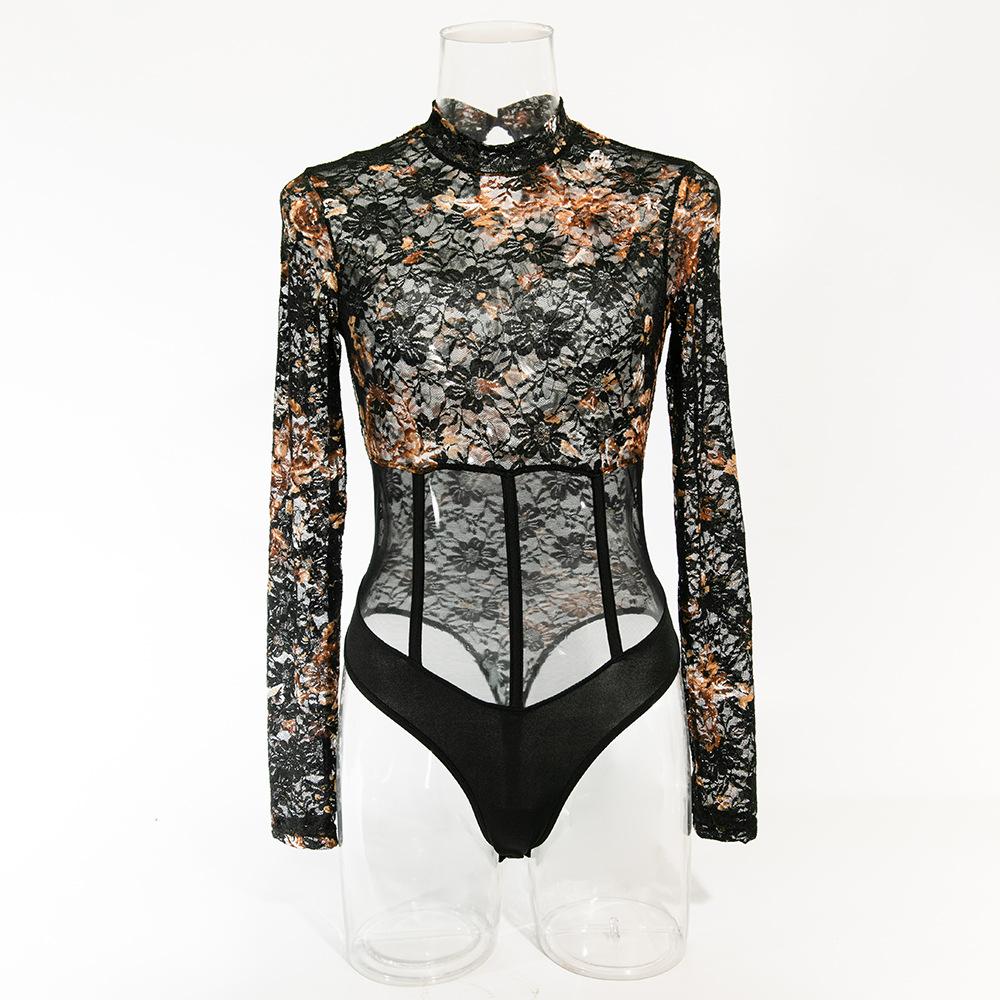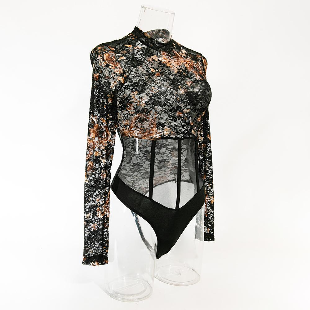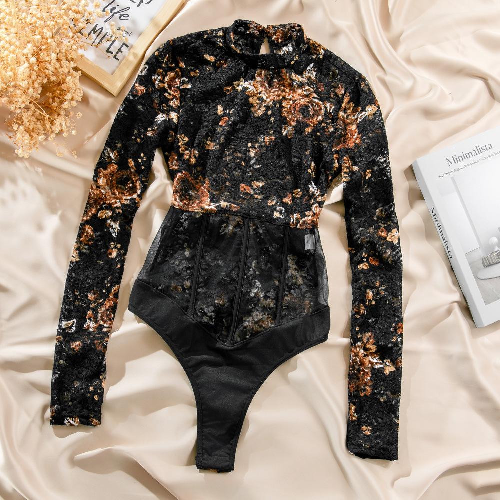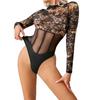 Verano Luz y Maduro Lujuria Pura Sexy Malla Encaje Estampado Cuello Redondo Manga Larga Adelgazamiento de Cintura Chica Caliente Mono Corte Alto