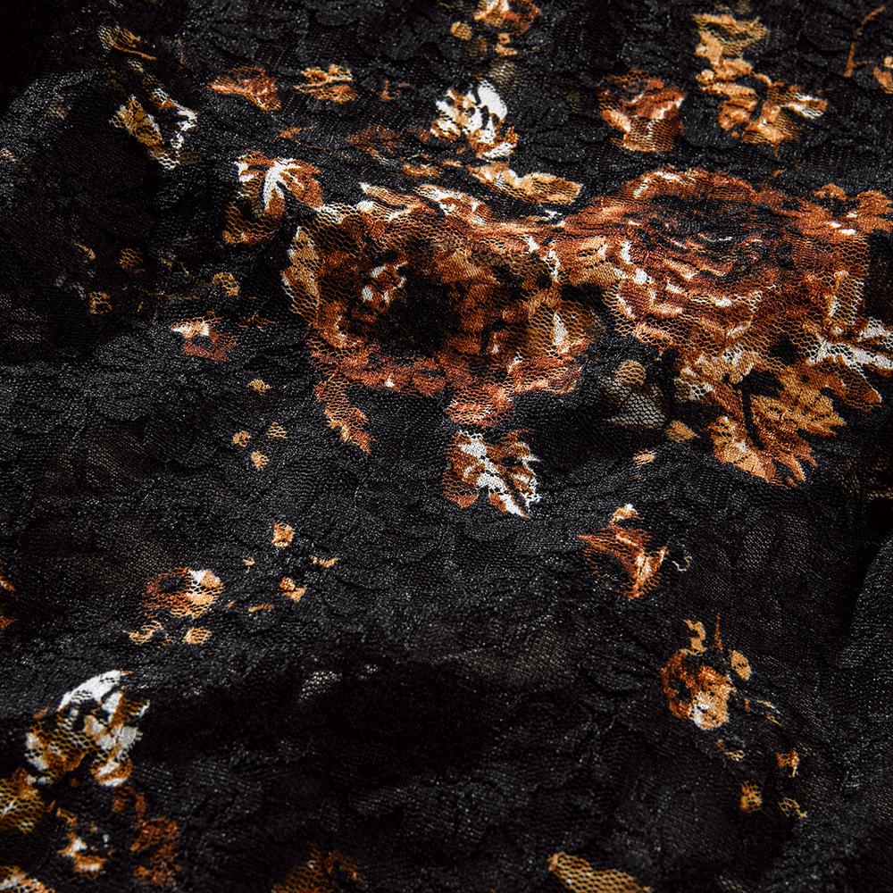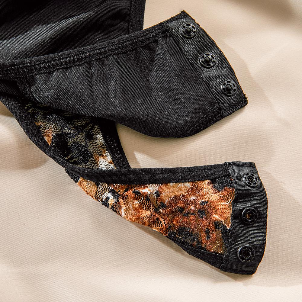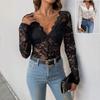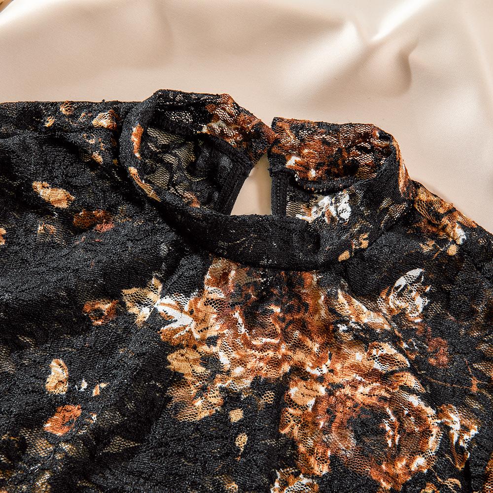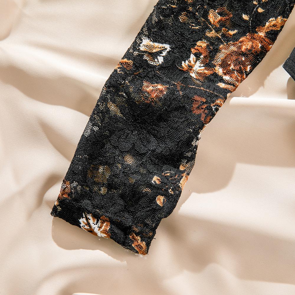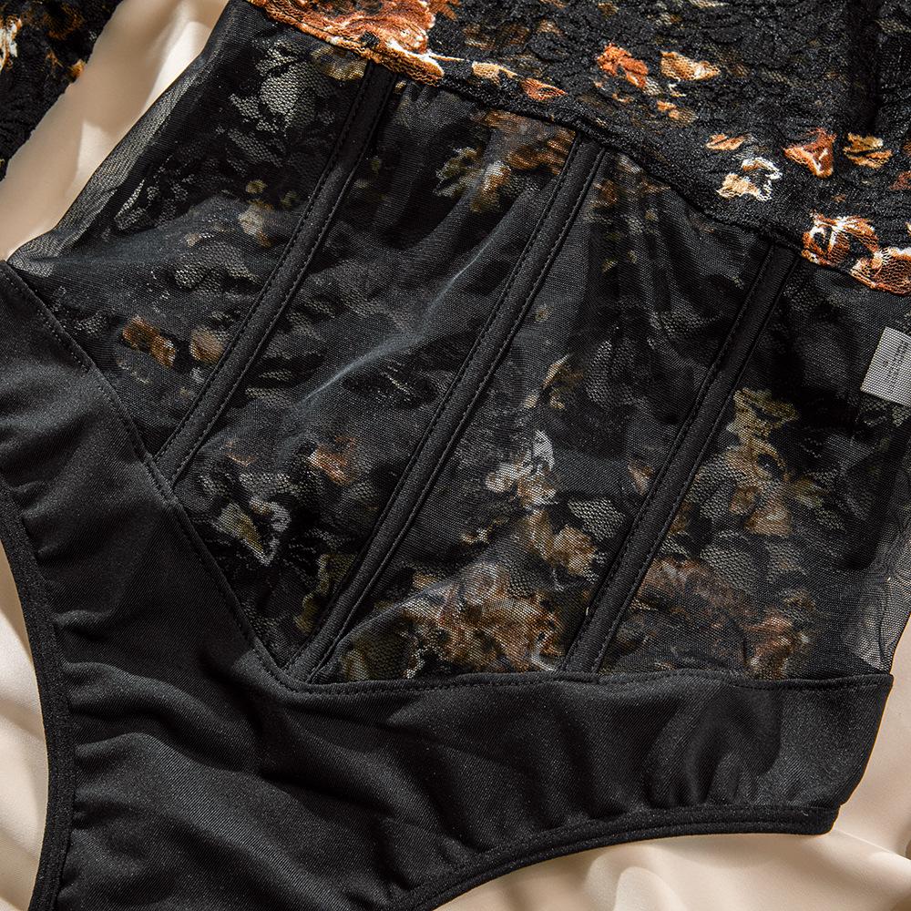 Verano Luz y Maduro Lujuria Pura Sexy Malla Encaje Estampado Cuello Redondo Manga Larga Adelgazamiento de Cintura Chica Caliente Mono Corte Alto