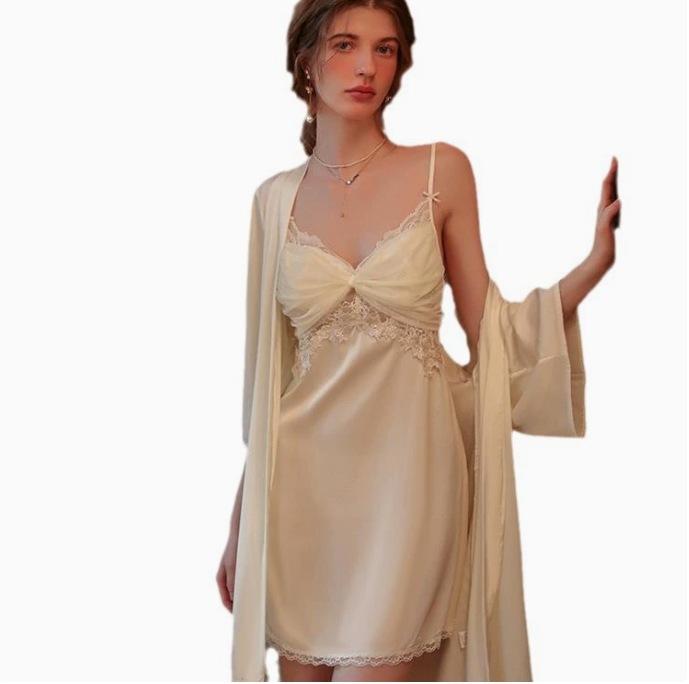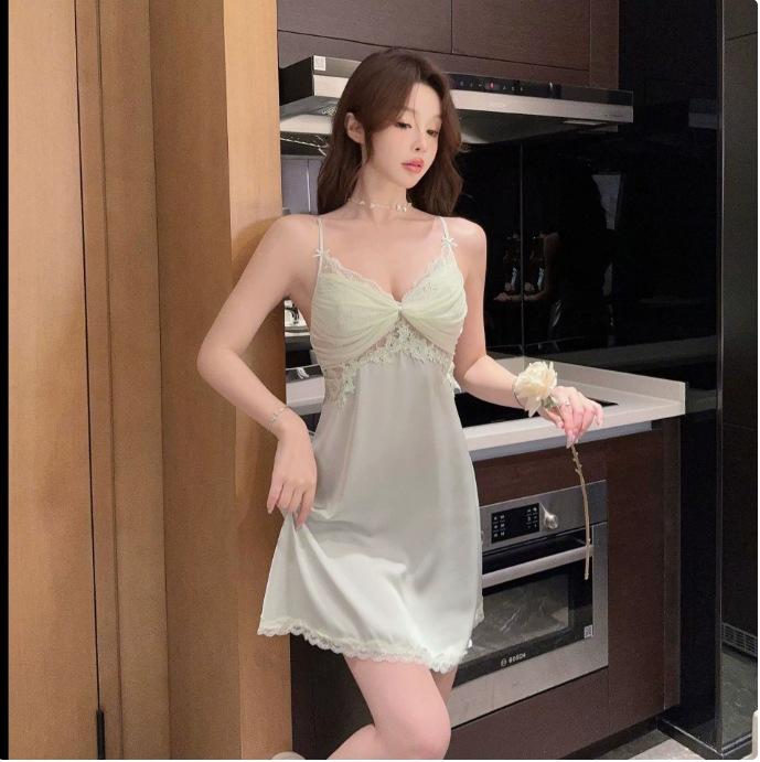 Pijama Sexy de Tirantes para Mujer, Seda de Hielo con Almohadillas para el Busto, Estilo Pura Lujuria 2023 Nuevo Camisón Casero de Encaje con Tirantes, Suave