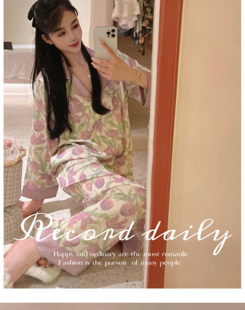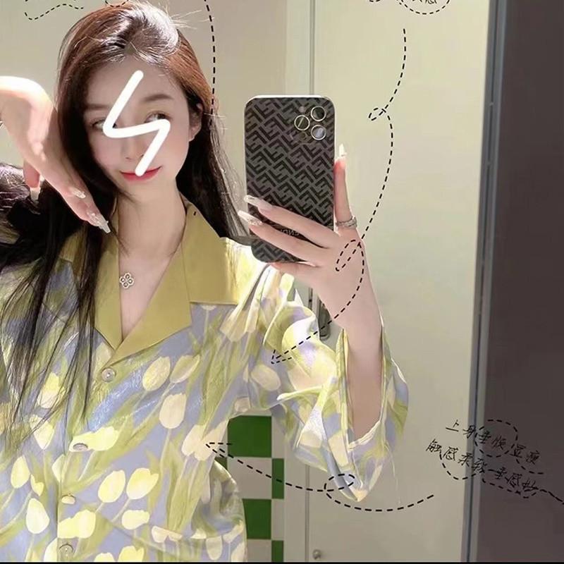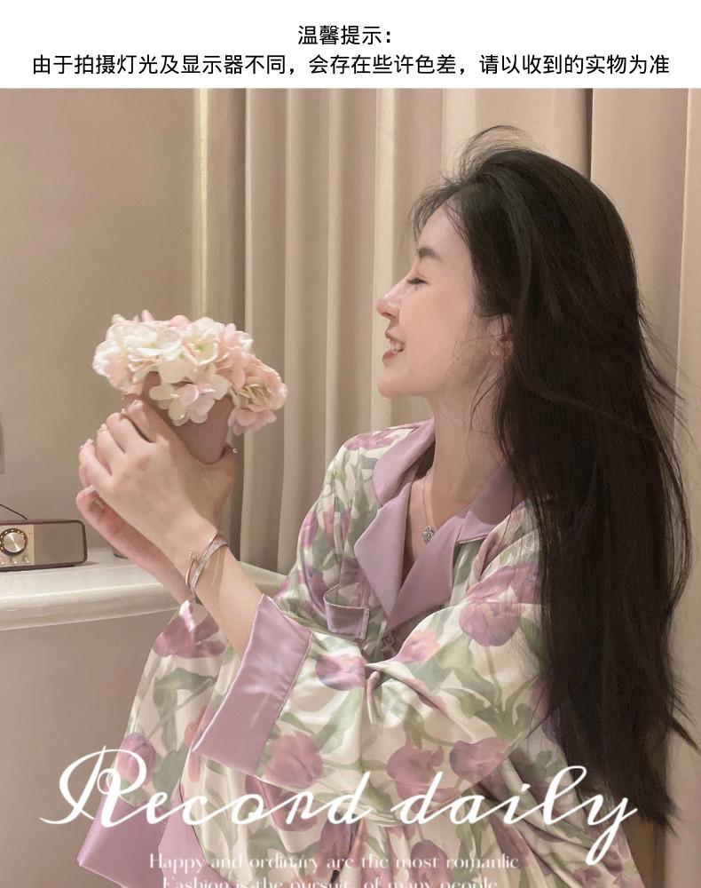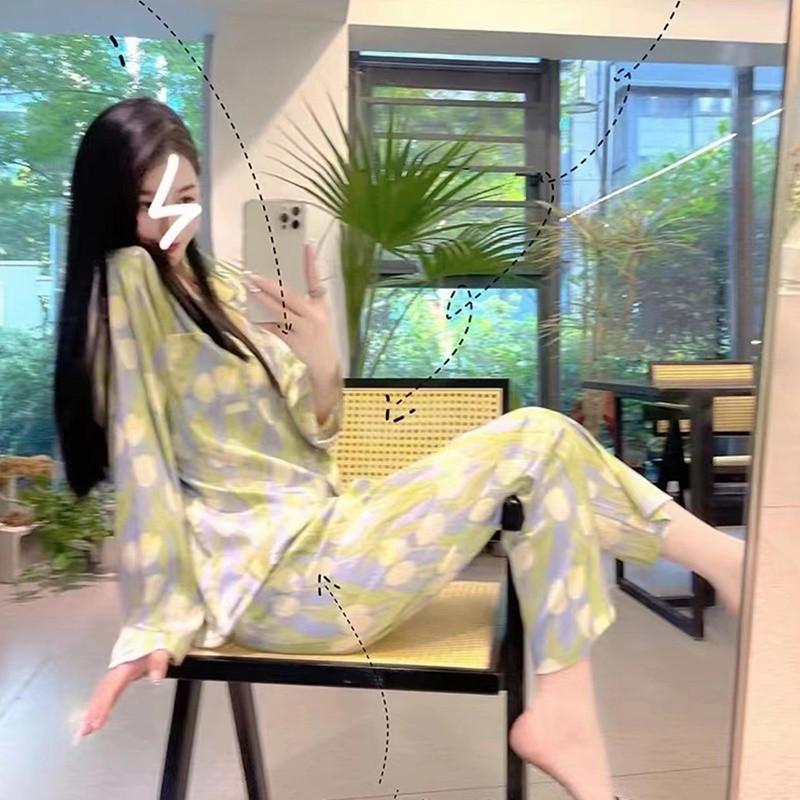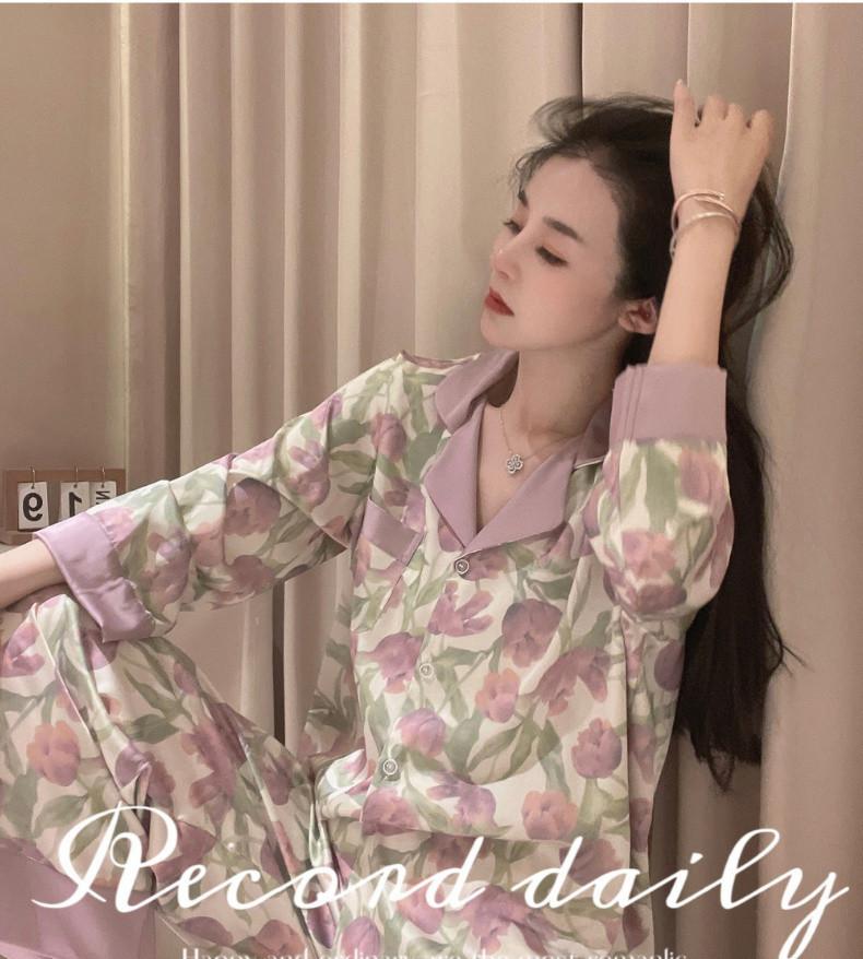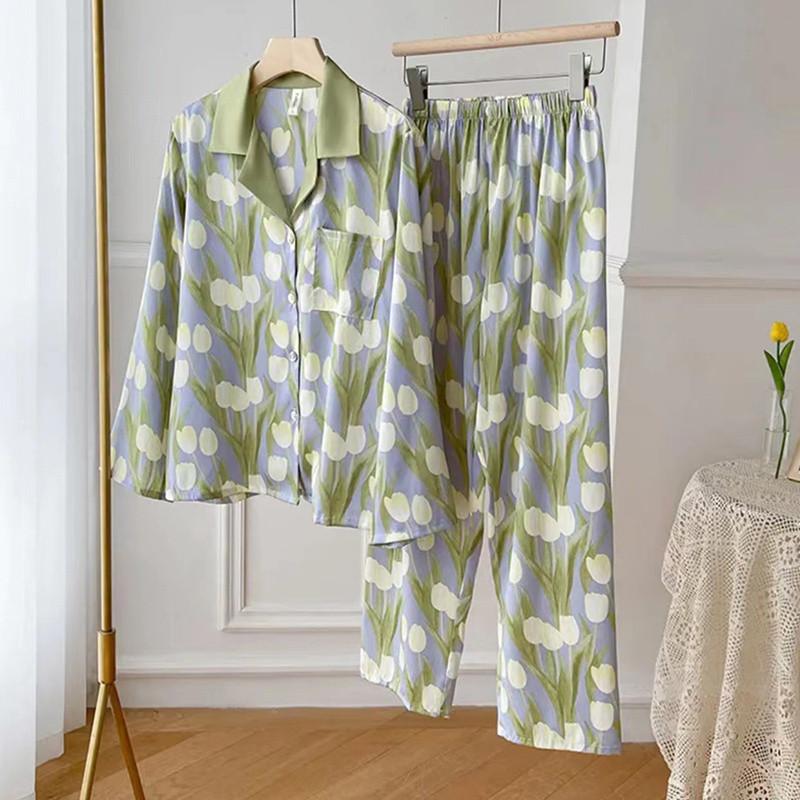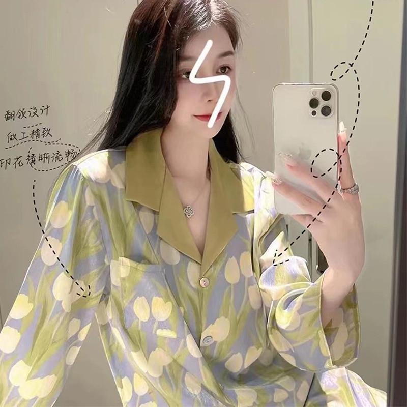 Gran Oferta Pijama Tulipán Seda de Hielo para Mujer Primavera y Otoño Manga Larga Fino Conjunto de Ropa de Casa de Seda para Mujer Se Puede Usar Afuera en Verano