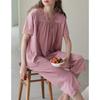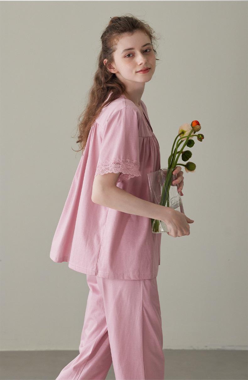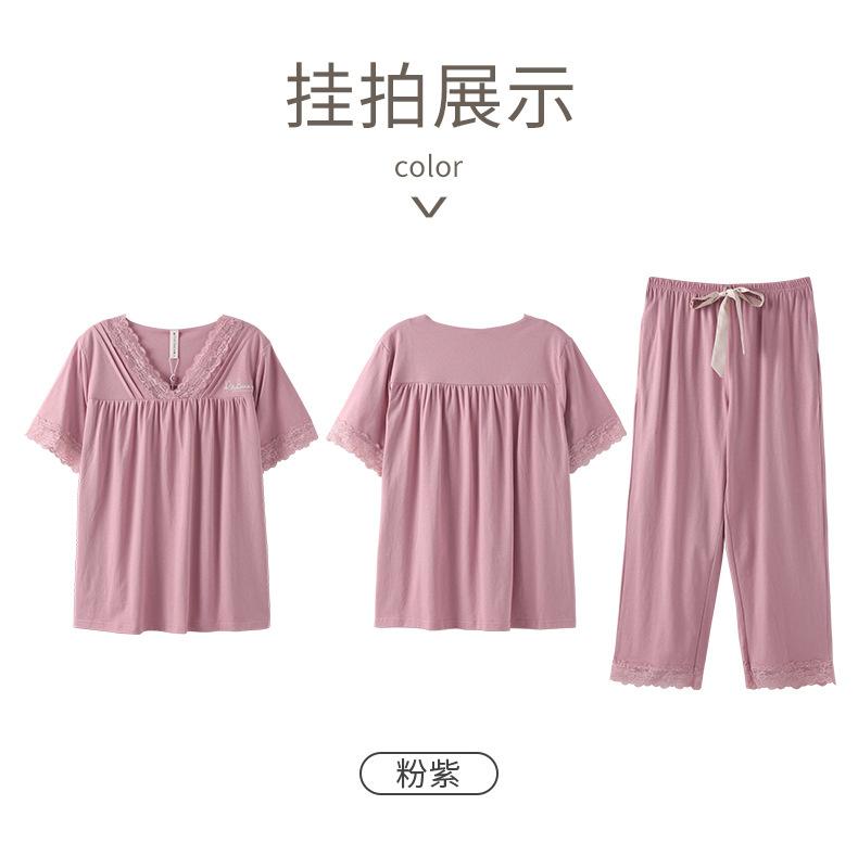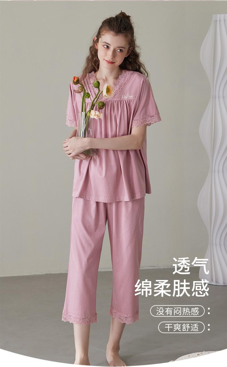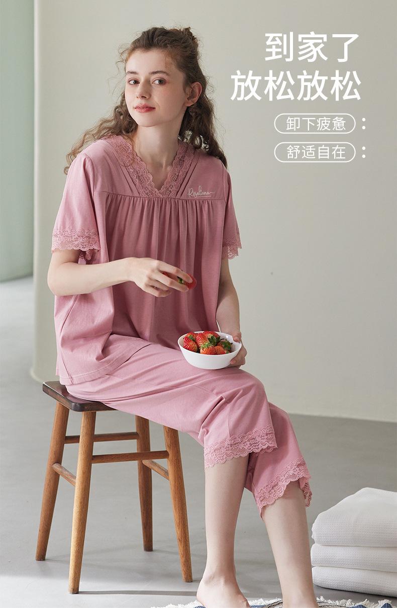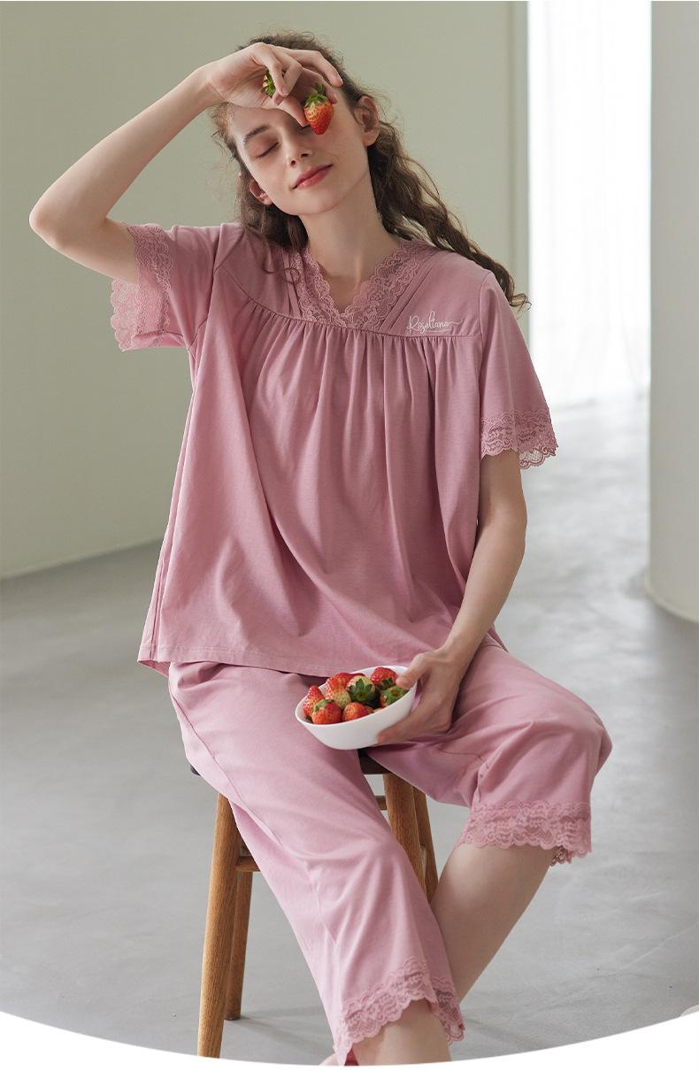 [Algodón Suave para la Piel] Pijama para Mujer Verano Manga Corta Pantalón Capri Traje Delgado Borde de Encaje Holgado Casual Ropa para el Hogar