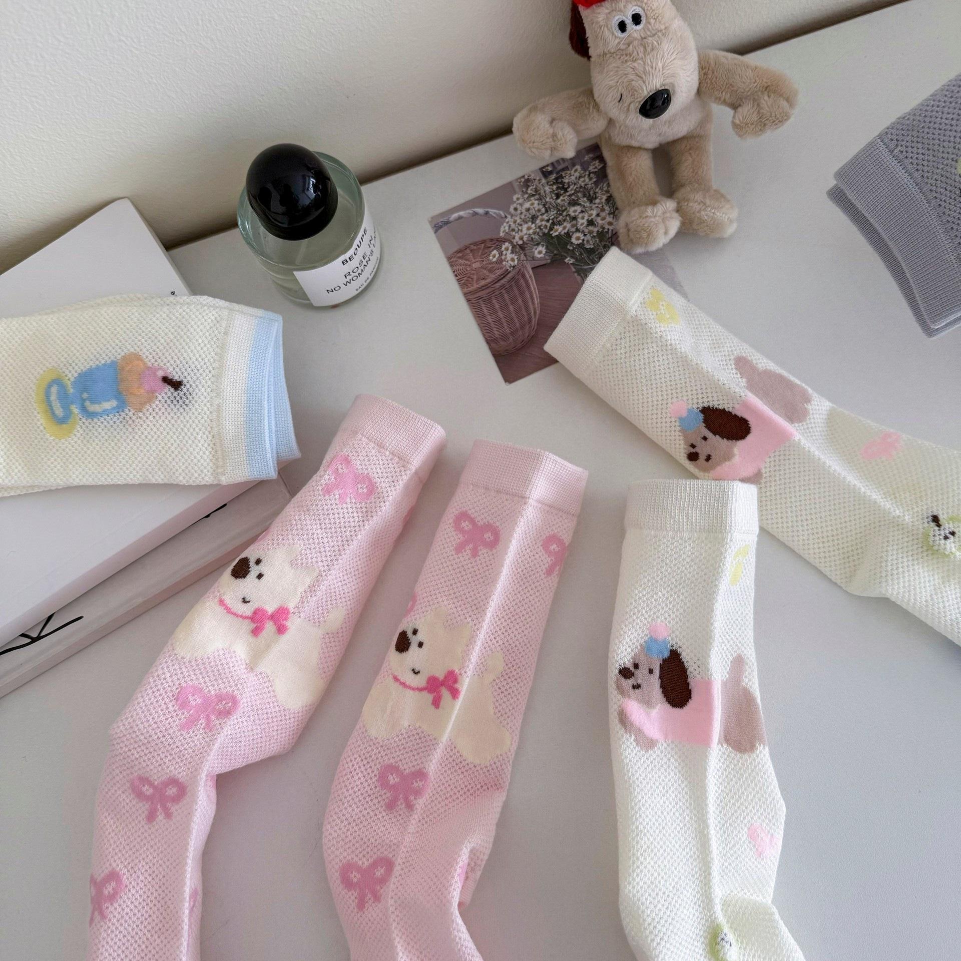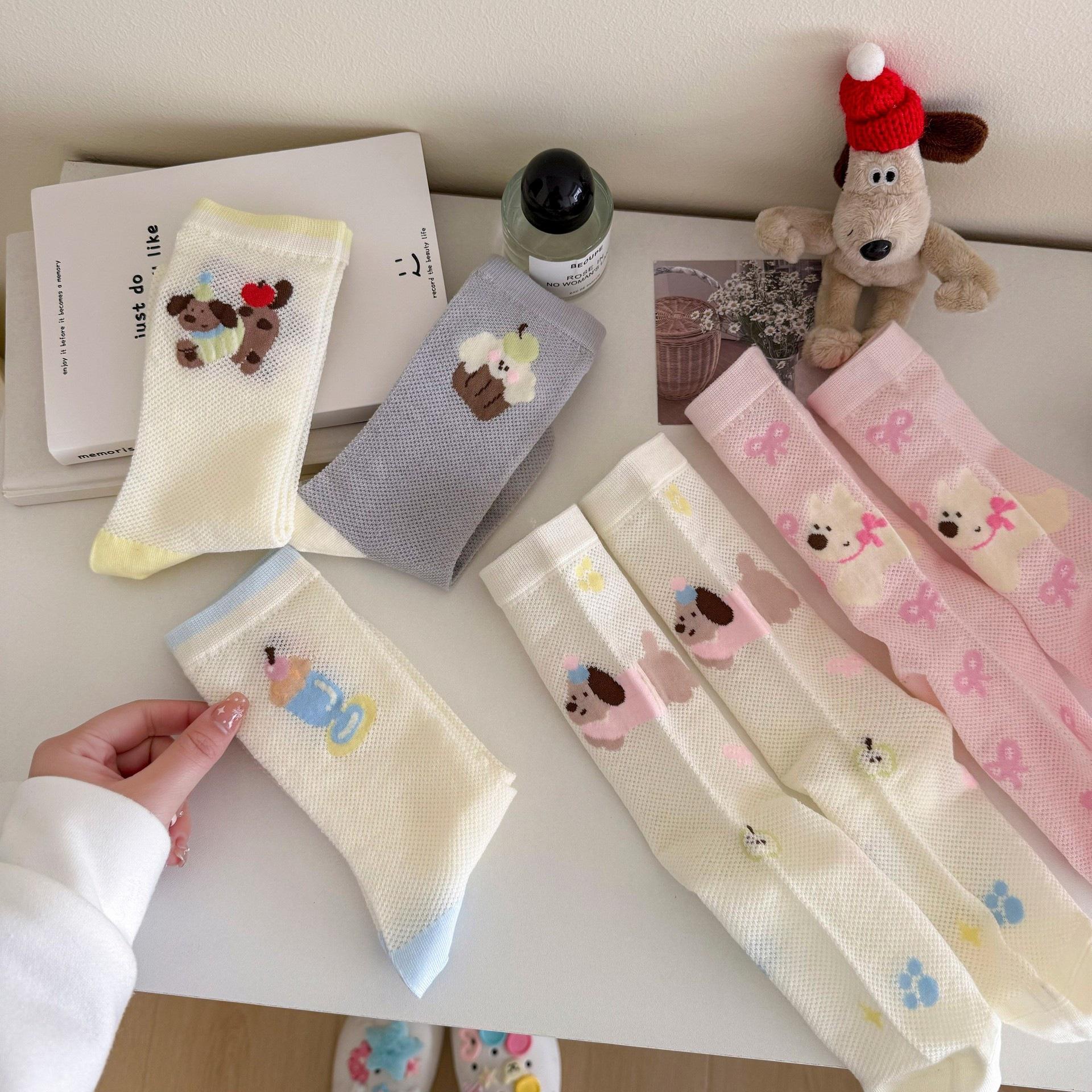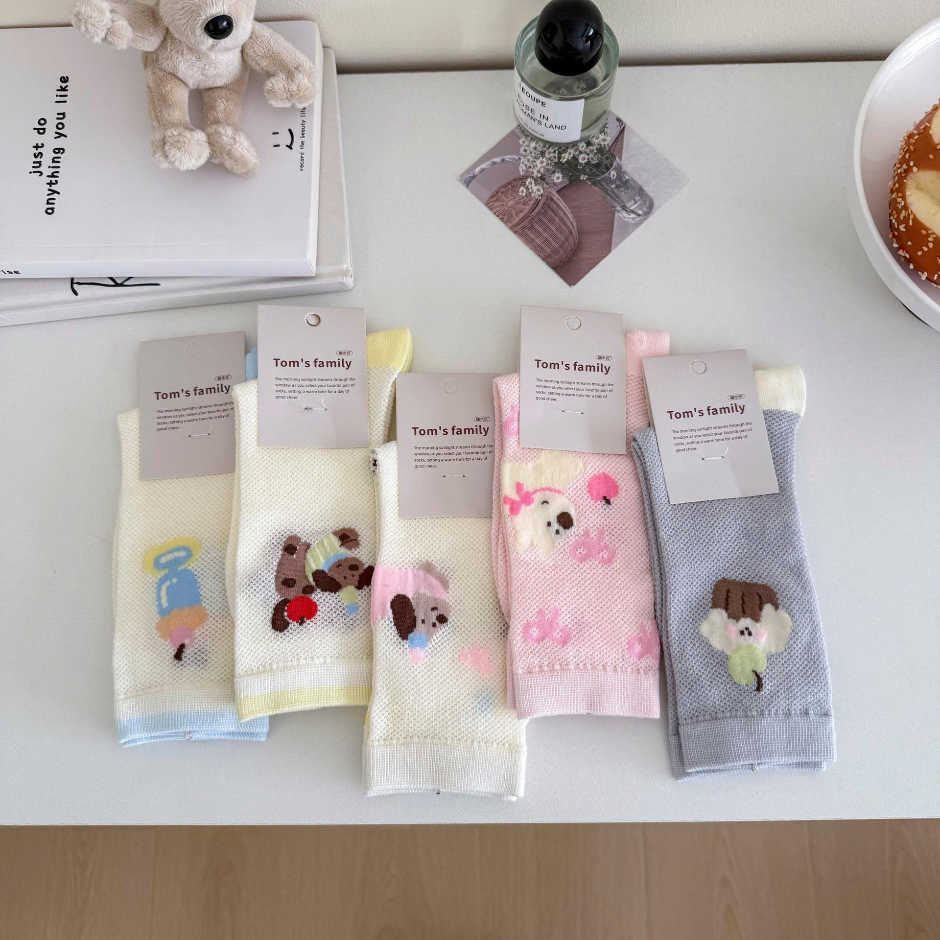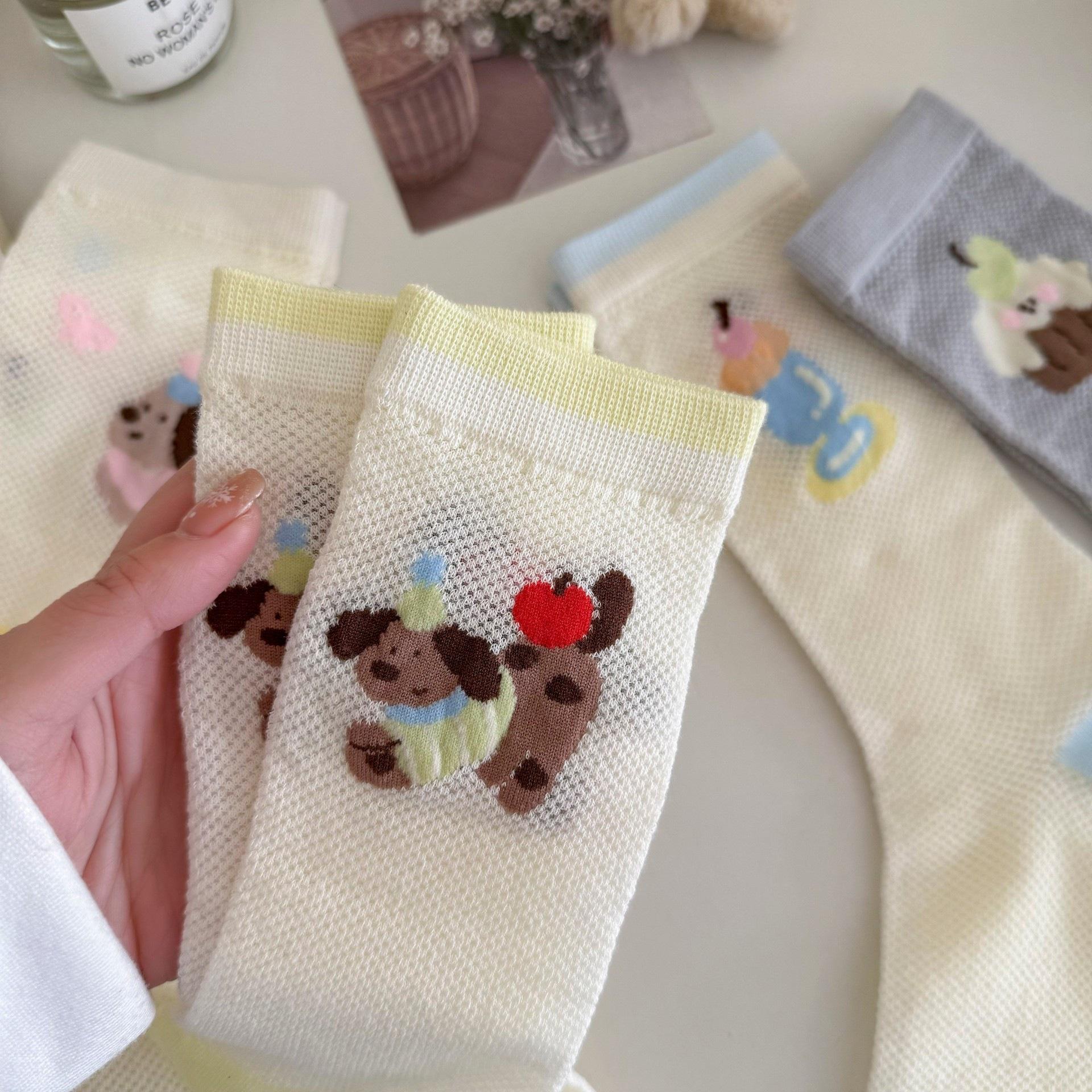 Primavera y verano nuevos calcetines de algodón de malla fina transpirable para mujer todo en uno sin costuras lindo perro de dibujos animados calcetines de montón al por mayor