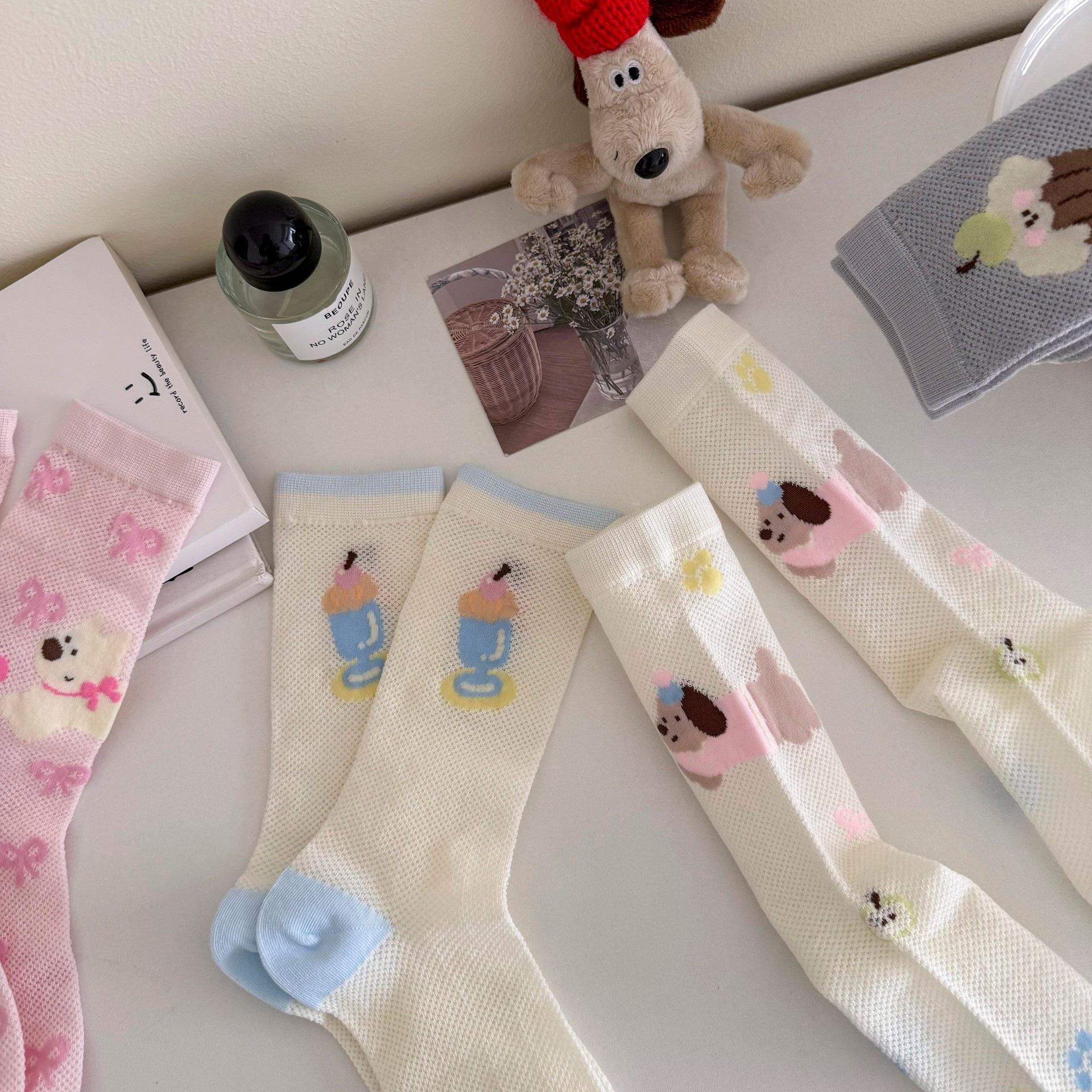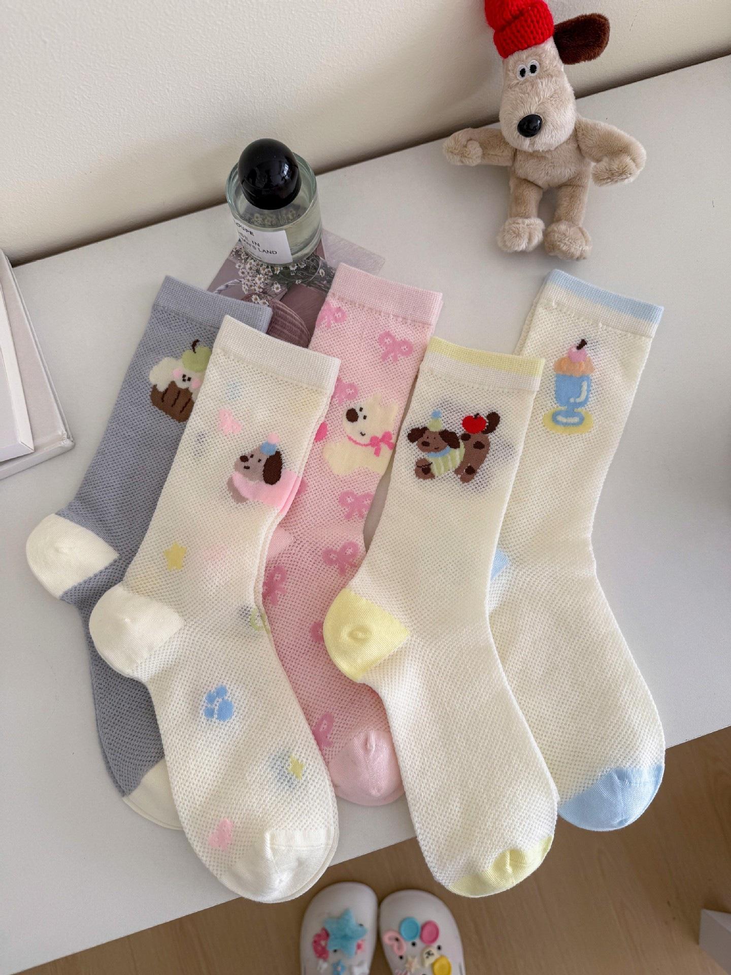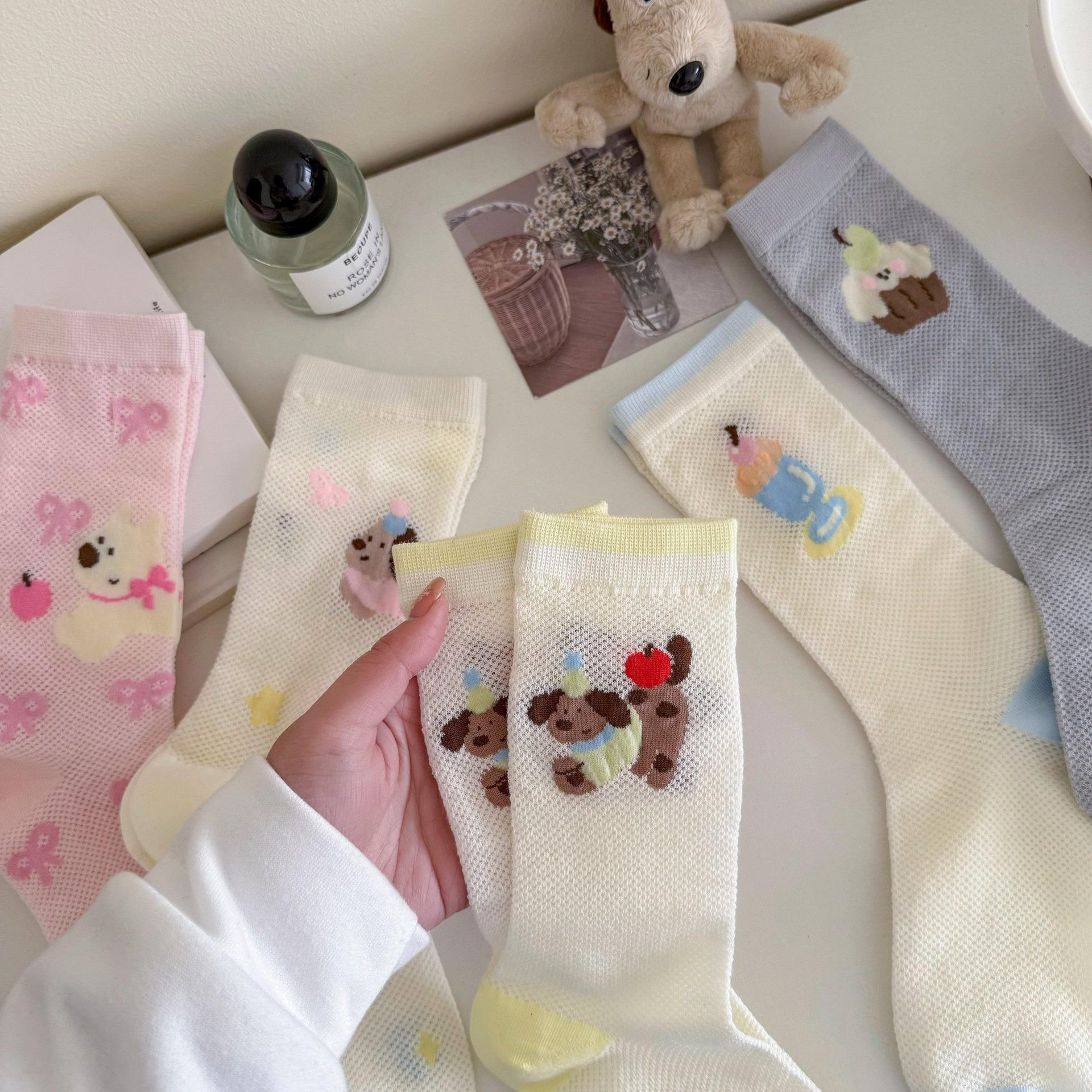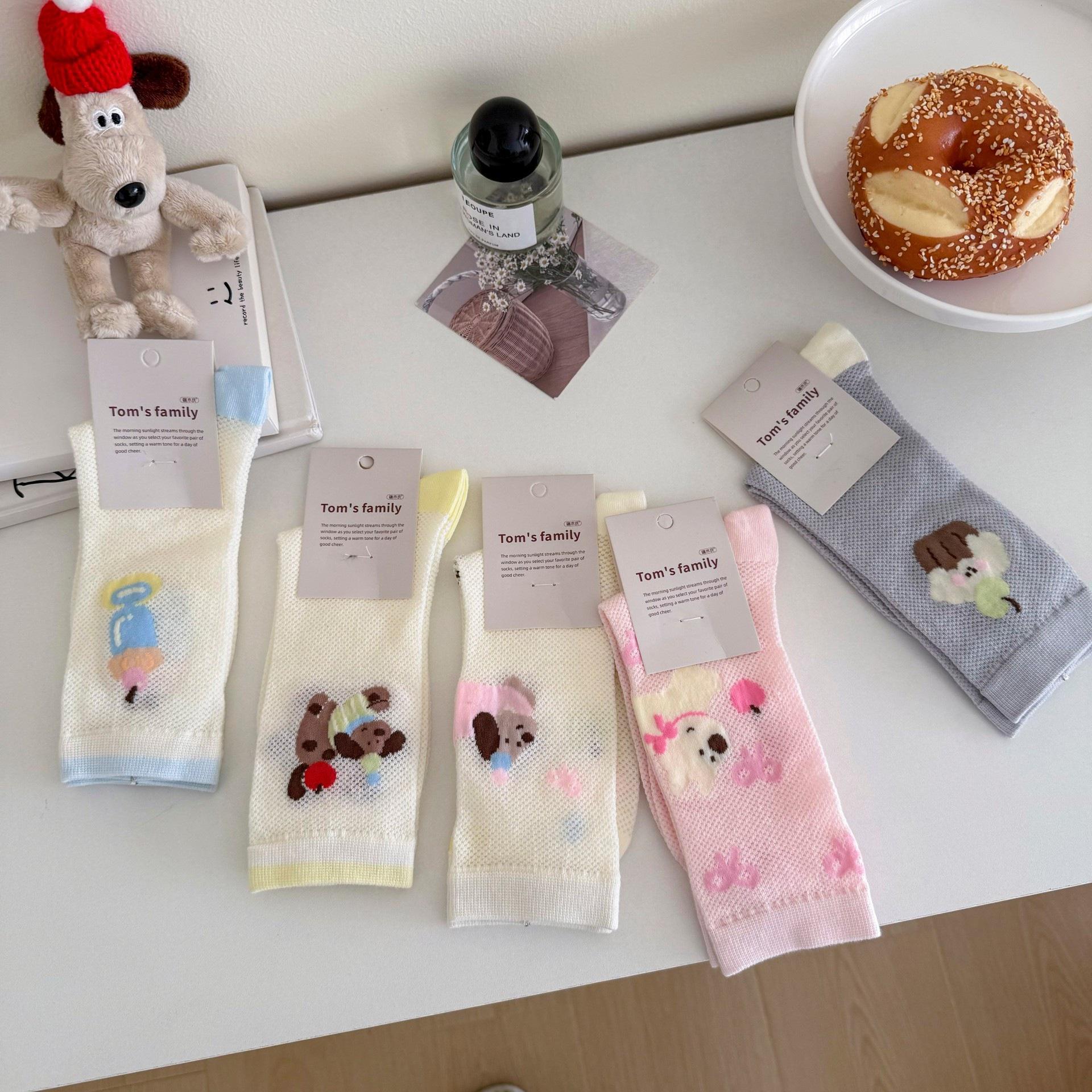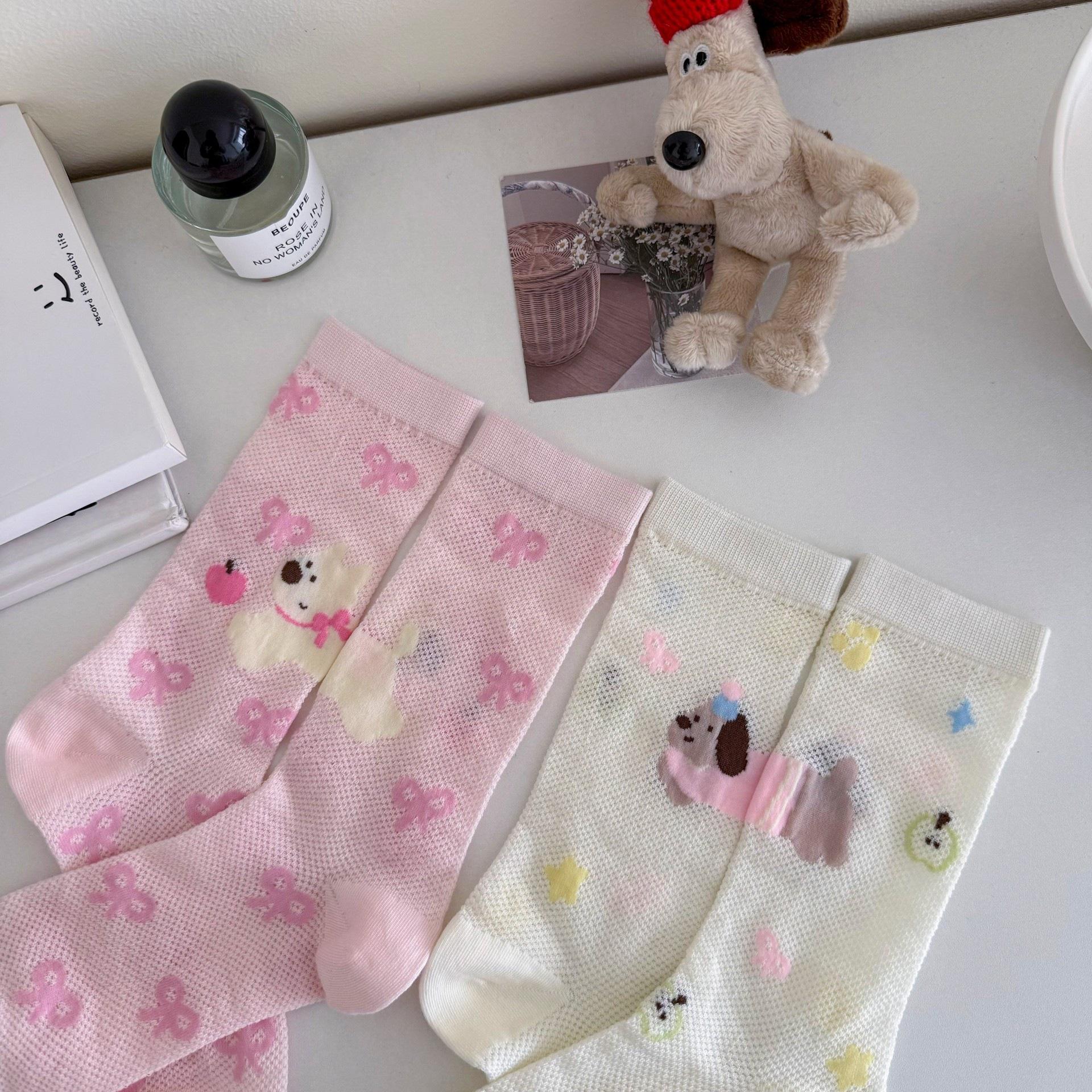 Primavera y verano nuevos calcetines de algodón de malla fina transpirable para mujer todo en uno sin costuras lindo perro de dibujos animados calcetines de montón al por mayor