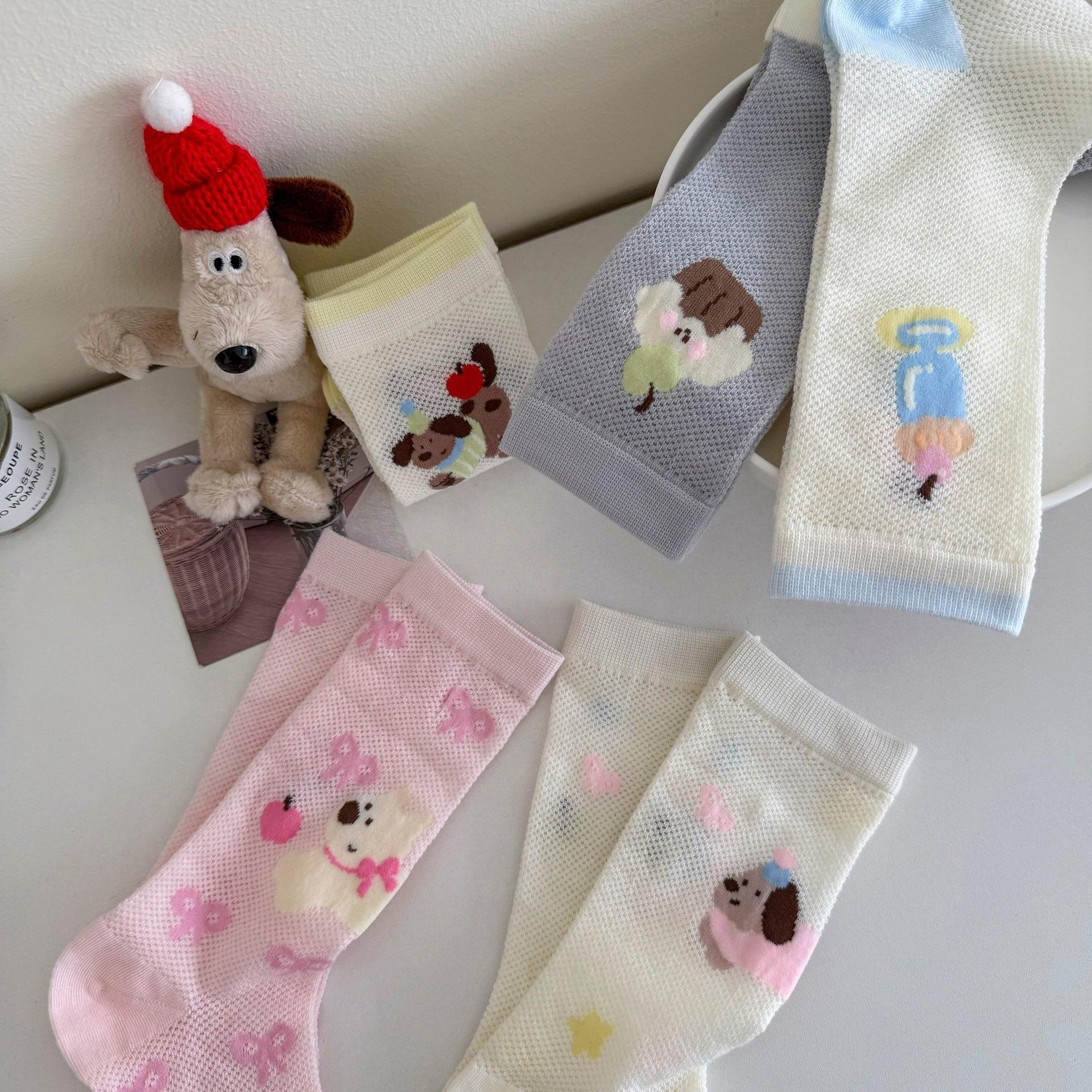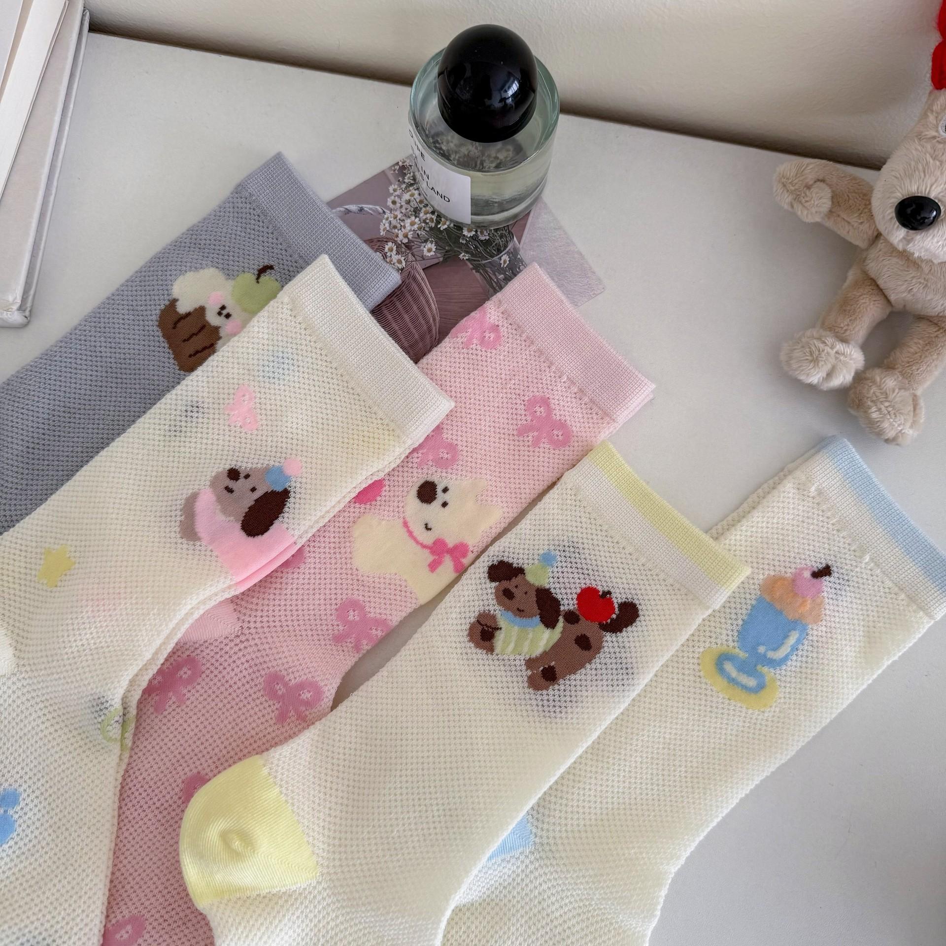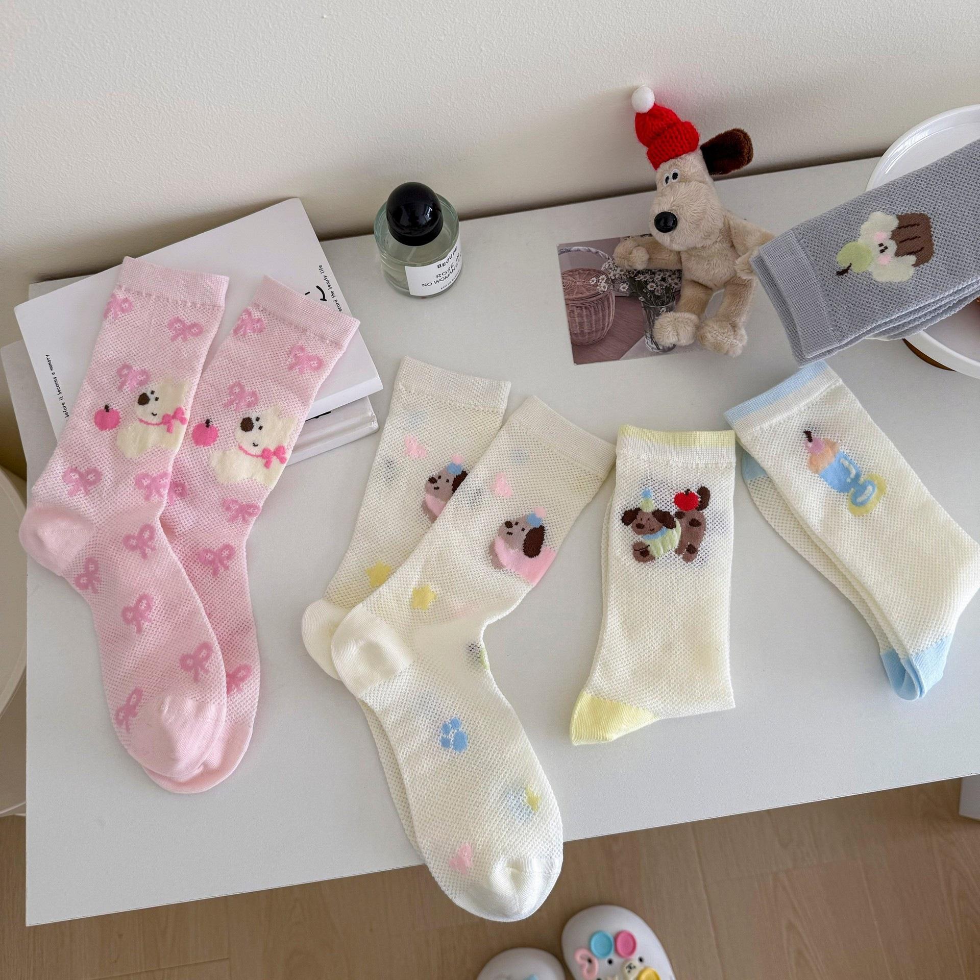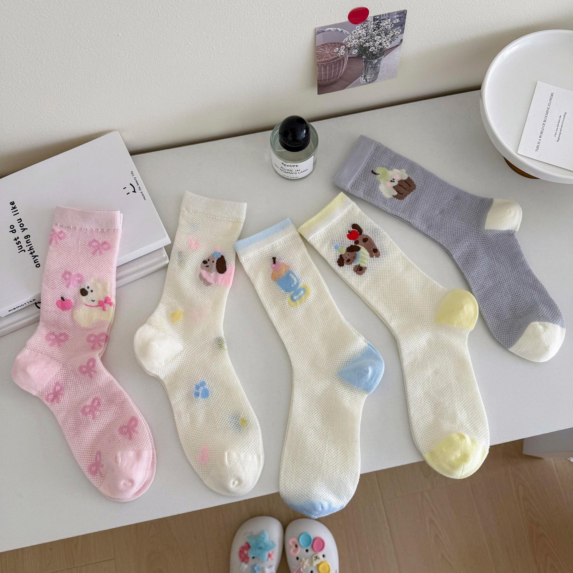 Primavera y verano nuevos calcetines de algodón de malla fina transpirable para mujer todo en uno sin costuras lindo perro de dibujos animados calcetines de montón al por mayor