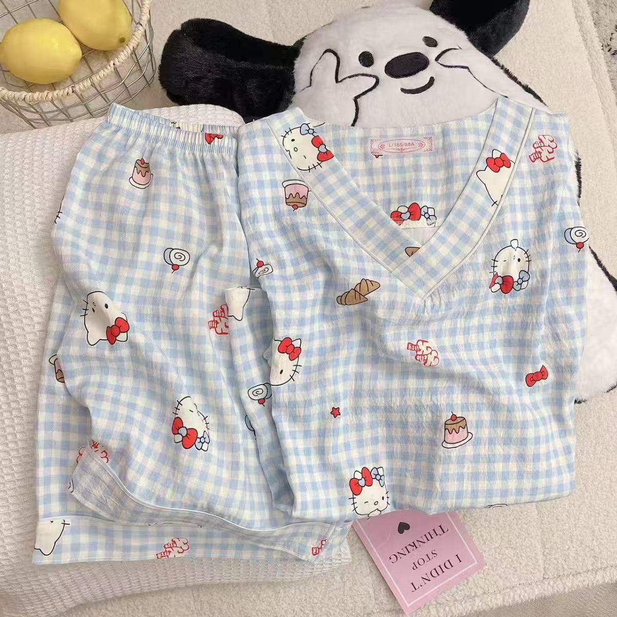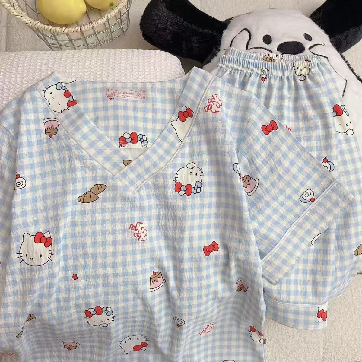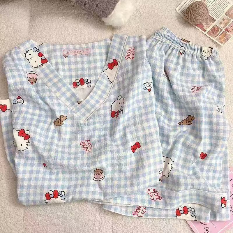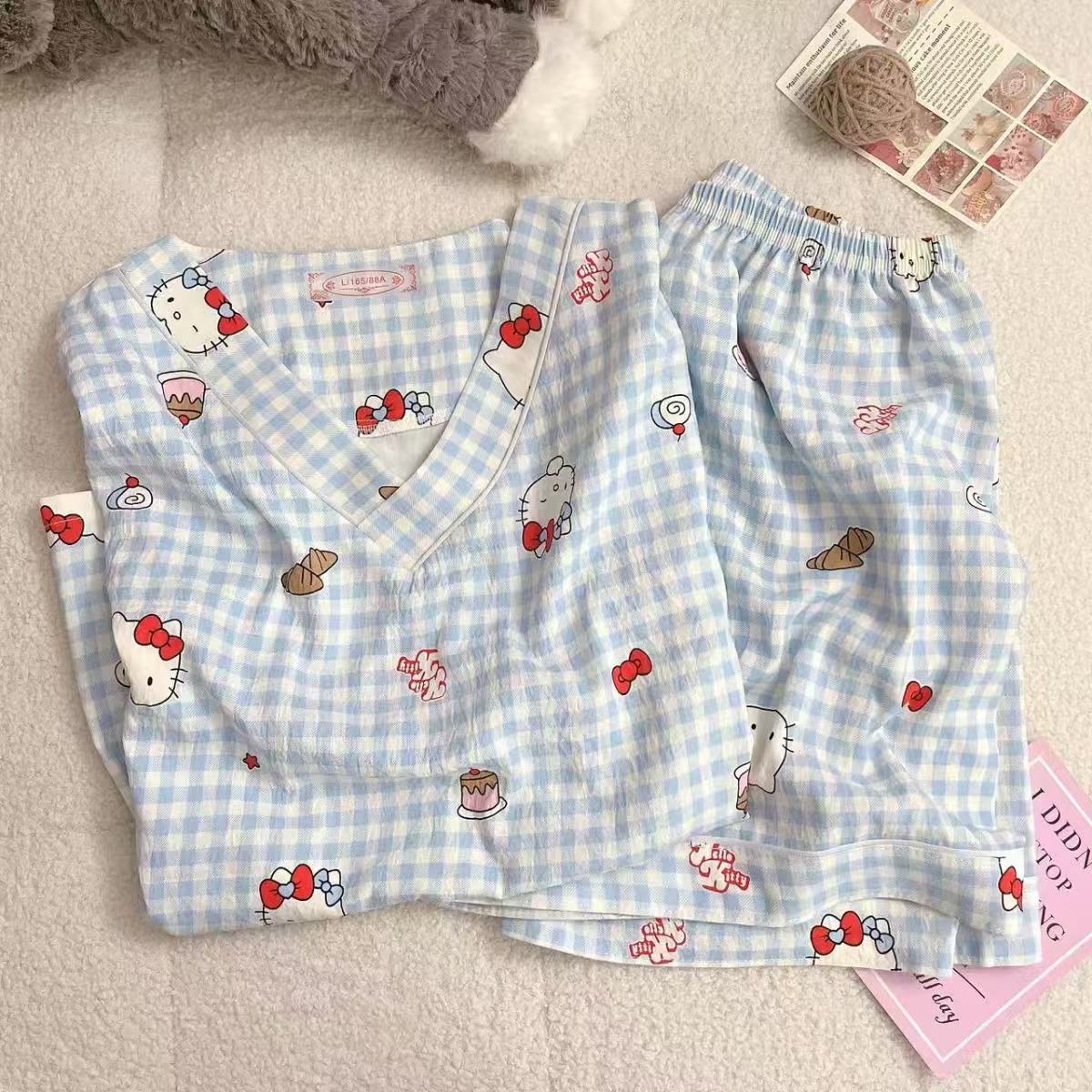 Pijama de algodón de nube para mujer, de verano, fino, con dibujos animados de gato KT, color liso, de manga corta, para el hogar, ropa exterior de verano.