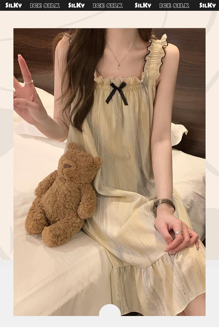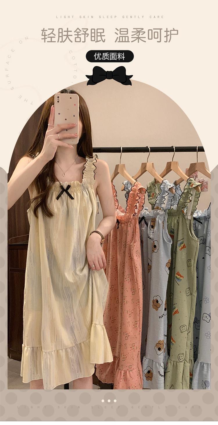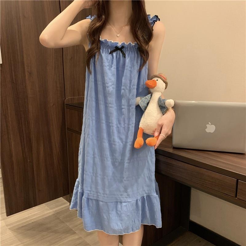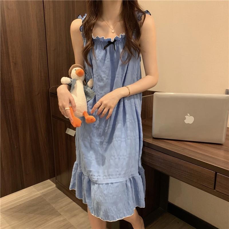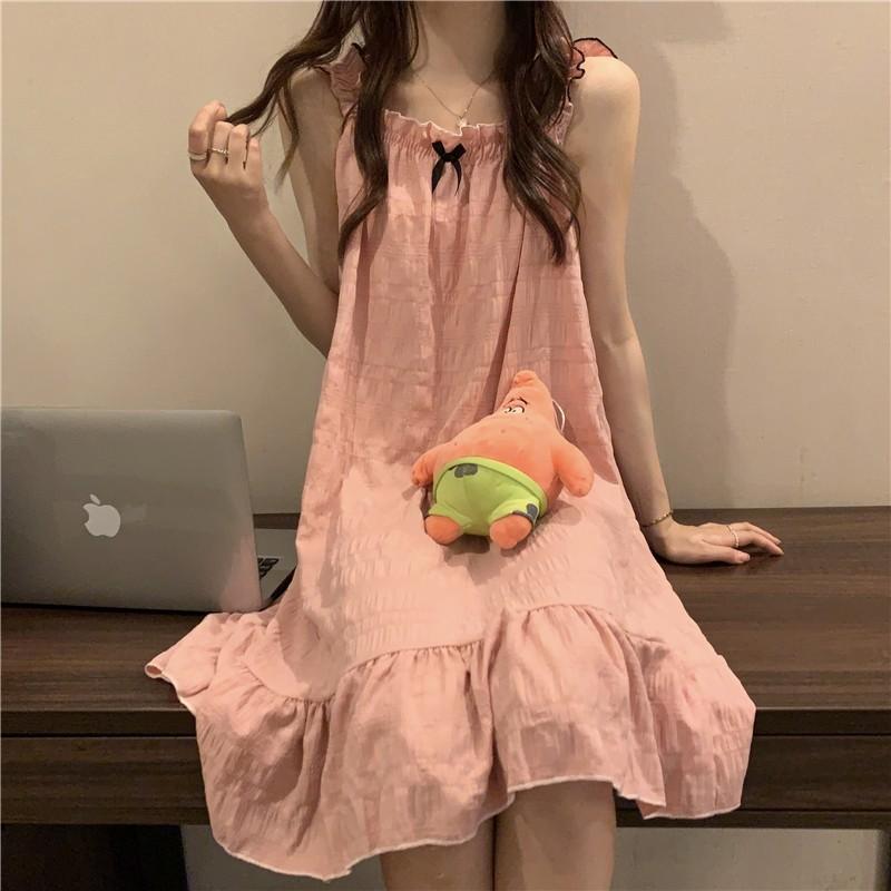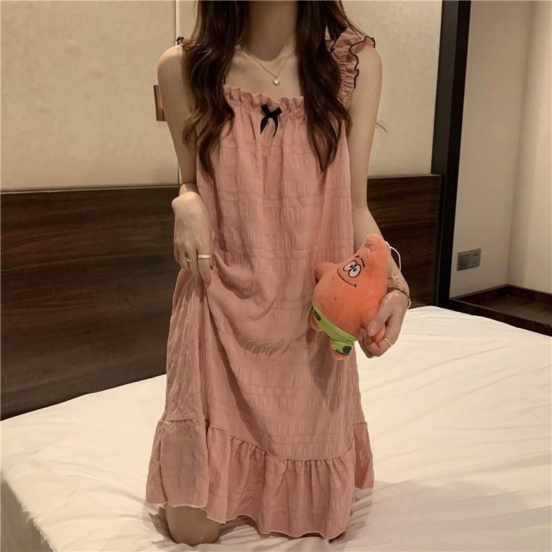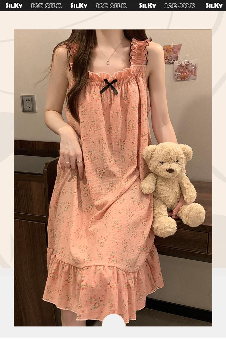 Gran Venta Pijamas Estilo Princesa con Almohadillas para el Busto Verano Nuevo Estilo Puro Lujuria Camisón de Tirantes de Largo Medio y Manga Corta Ropa de Casa para Mujer
