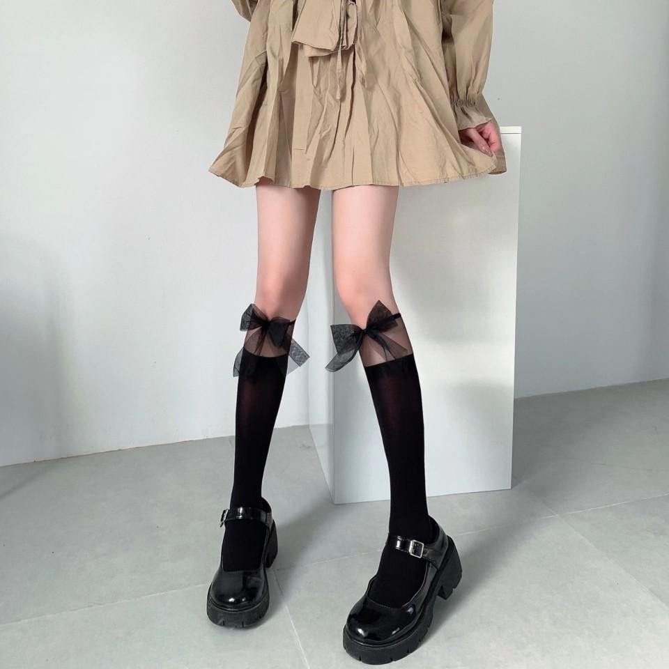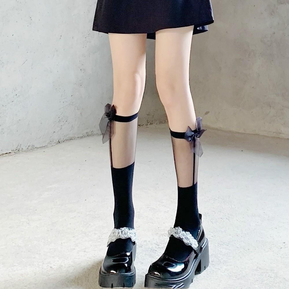 Medias blancas de encaje JK con costuras para mujer, medias blancas finas de primavera y verano, calcetines de pantorrilla Lolita con lazo