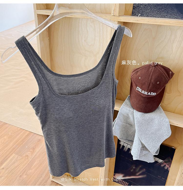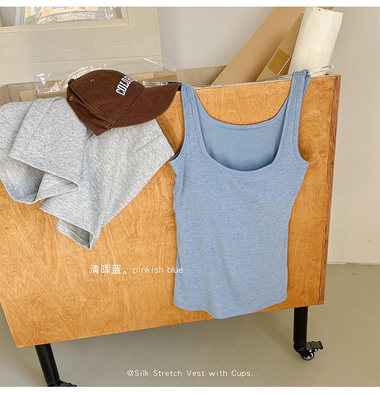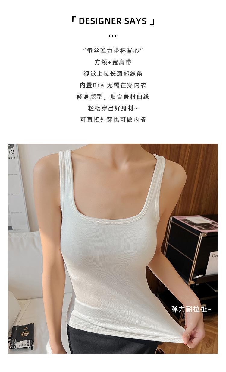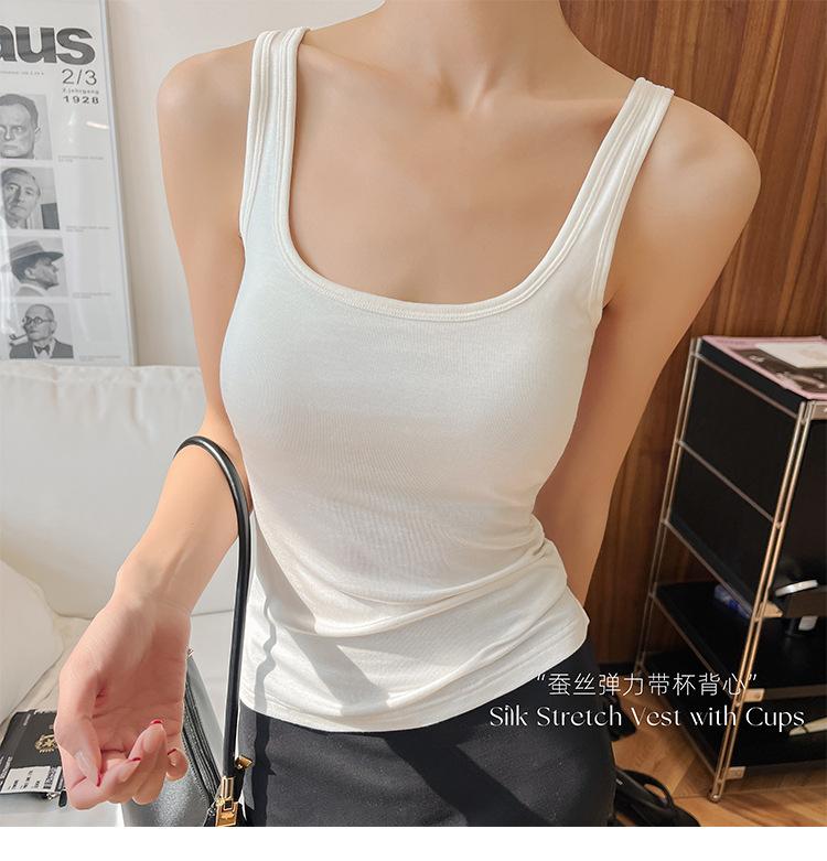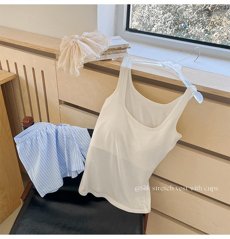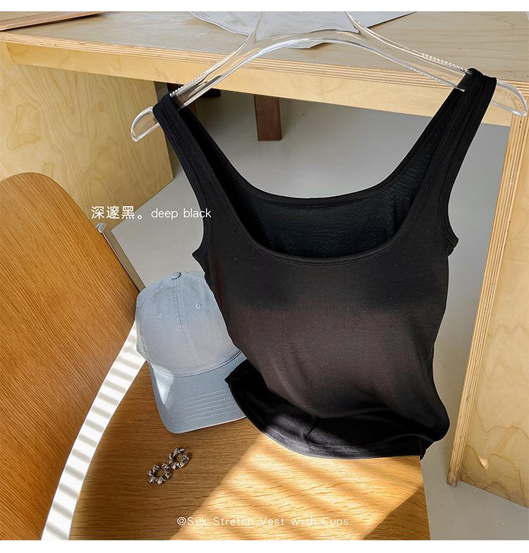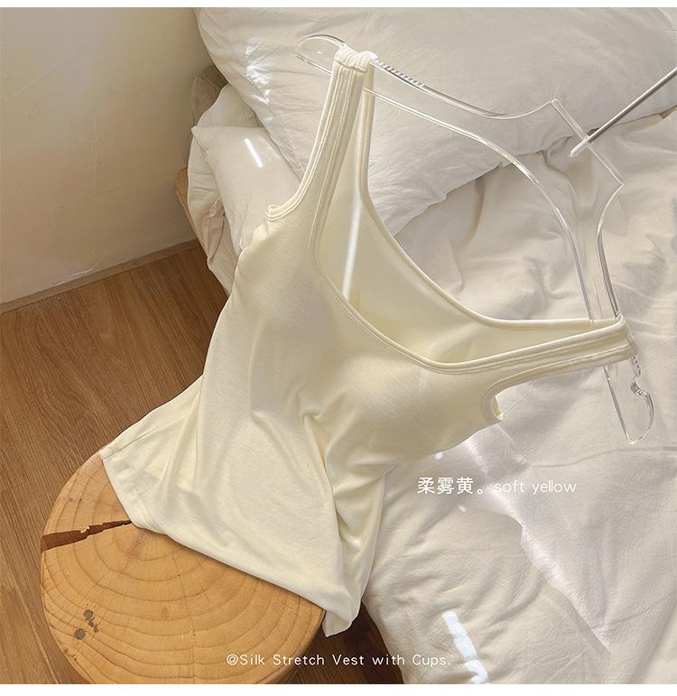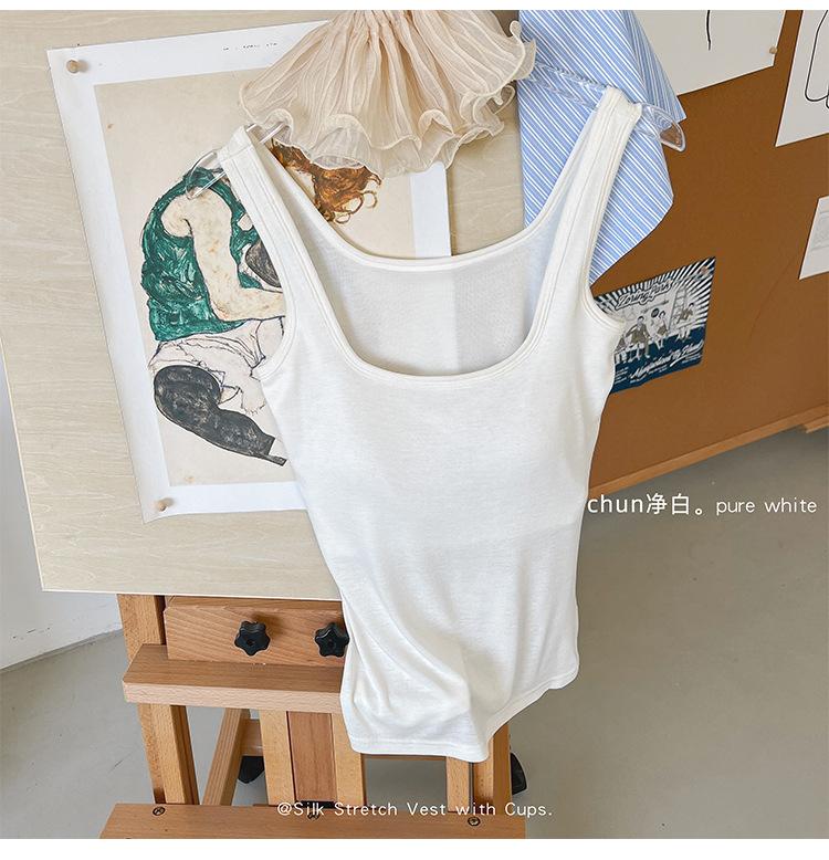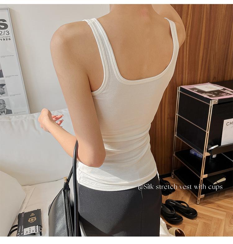 Chaleco elástico fresco de seda con cuello cuadrado para mujer con almohadilla en el pecho, sling básico, primavera y verano, nuevo estilo, top interior sin mangas