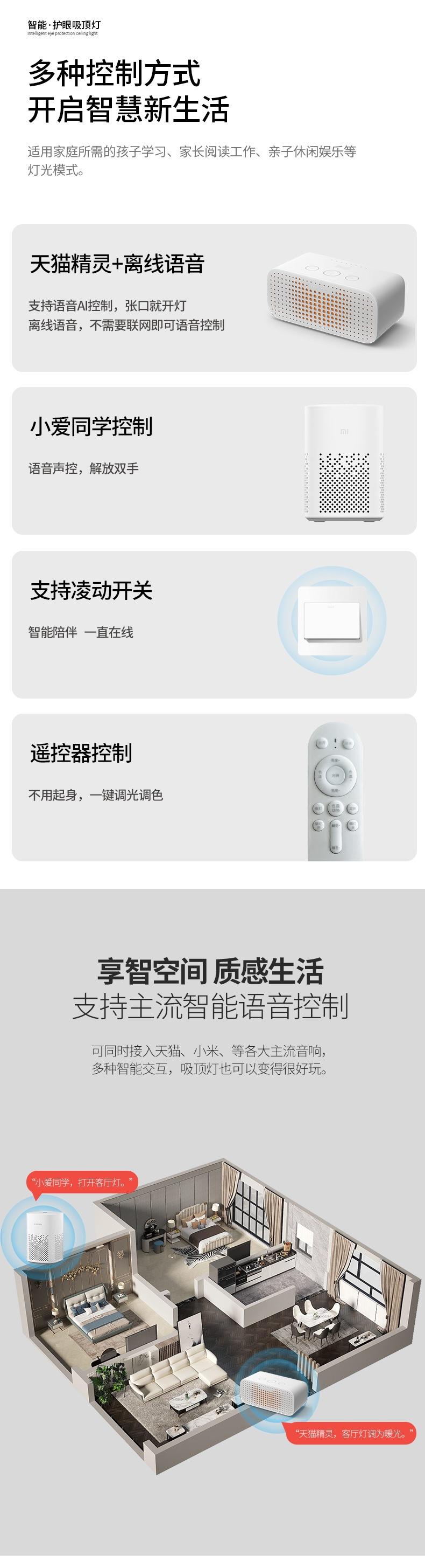 Three color dimming, Wuji tmall + offline voice (voice control + wuji remote control), Xiaomi xiaoai (voice co...