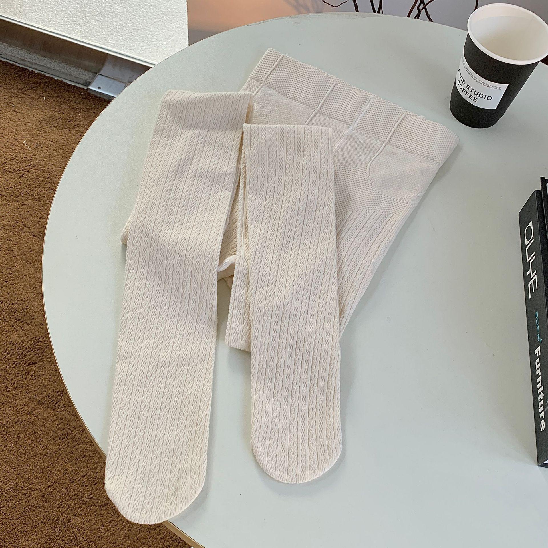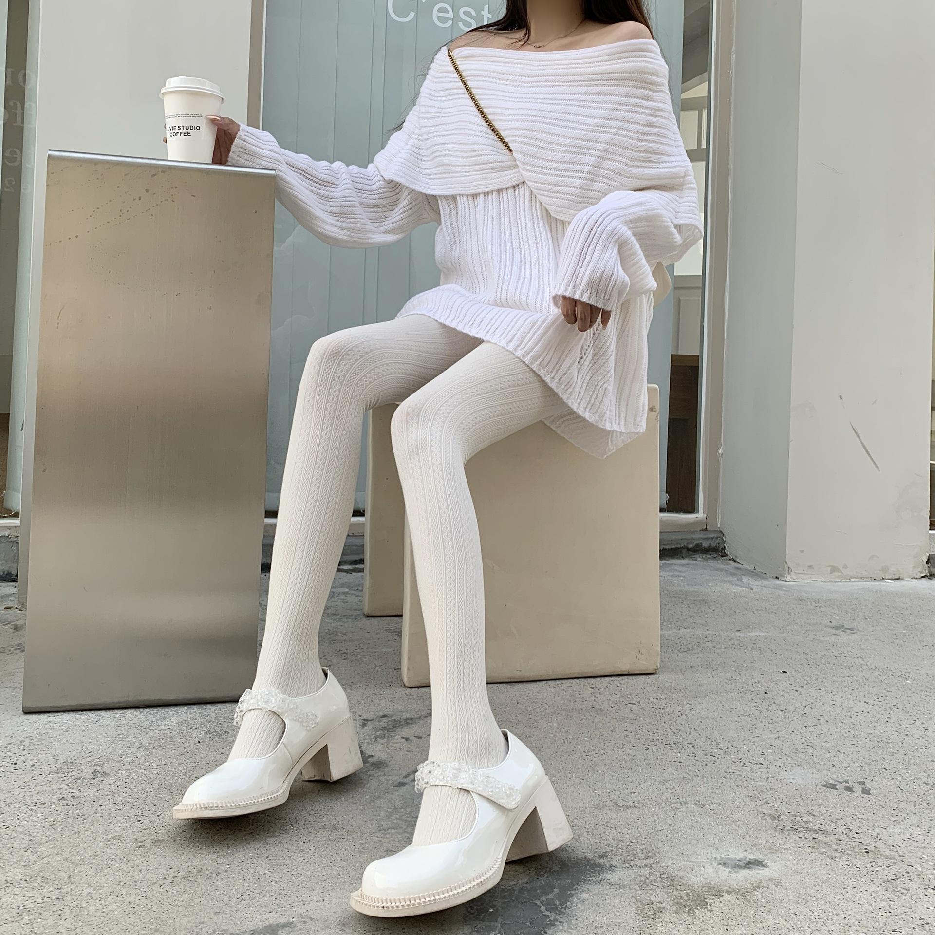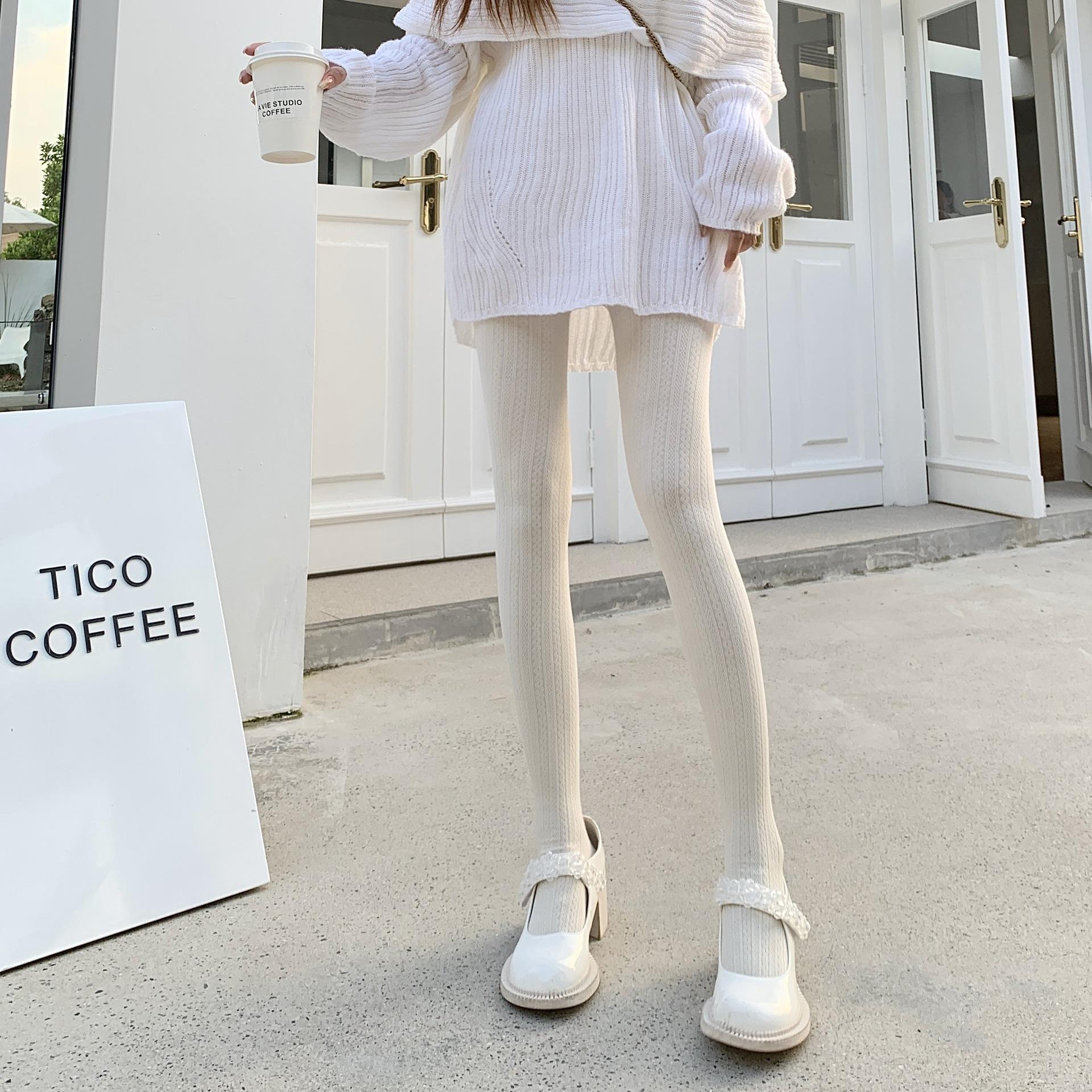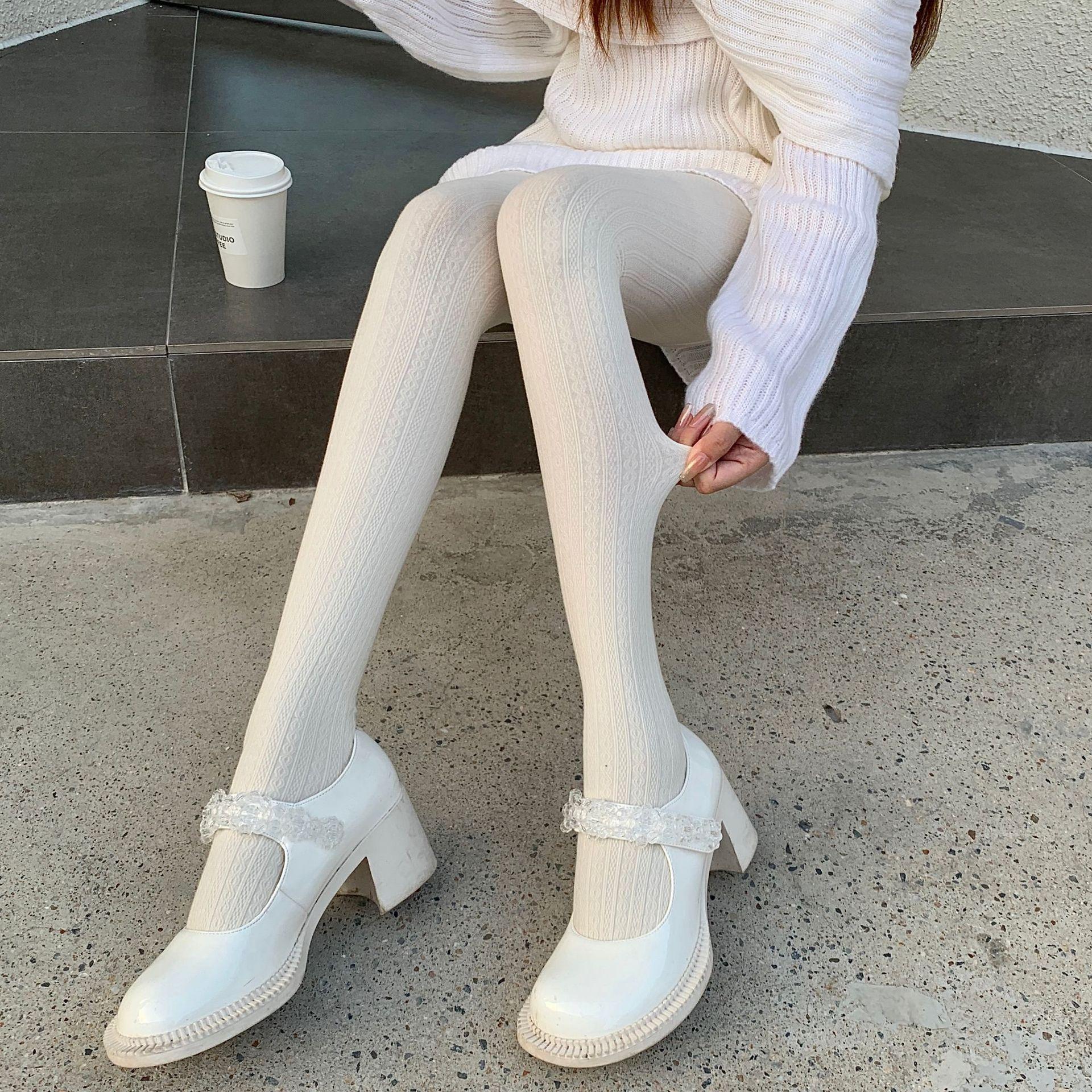 Calcetines japoneses retro de algodón peinado, de punto trenzado, de color blanco avena, con fondo dulce, con forro polar, para otoño e invierno, para mujer