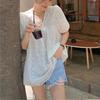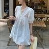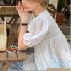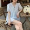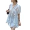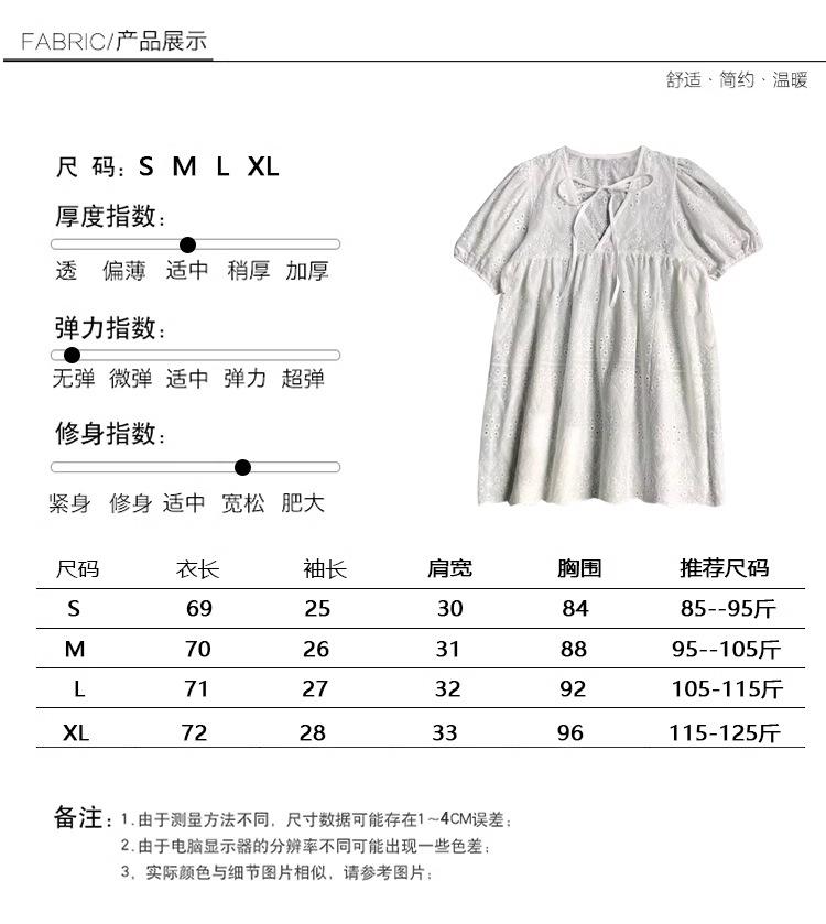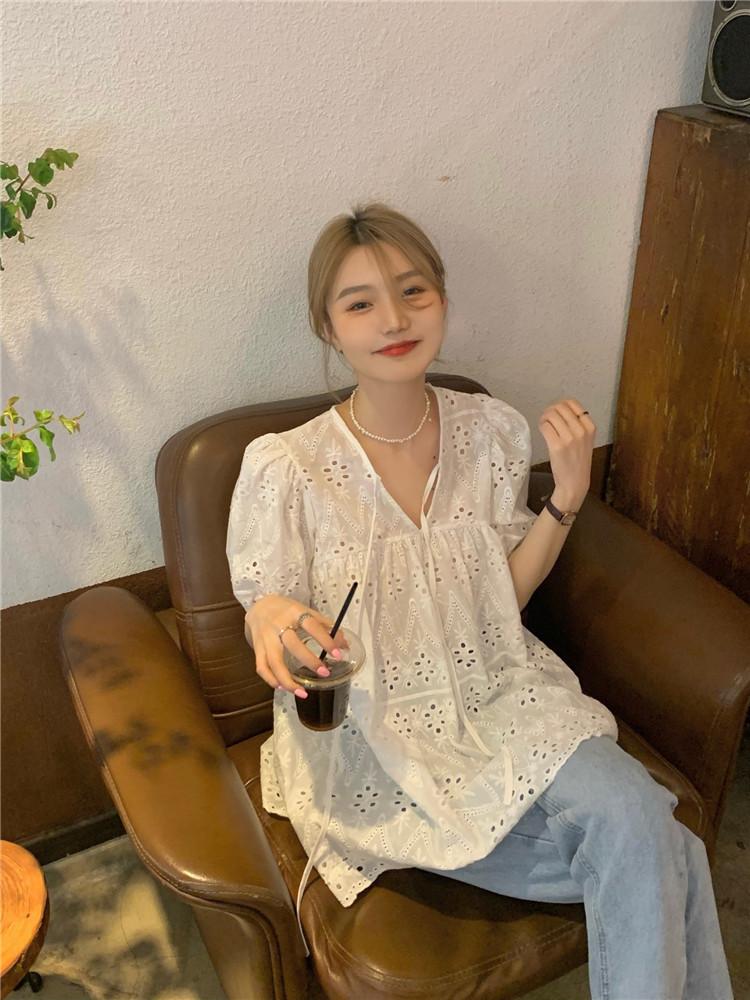 Camisa holgada de manga corta con diseño francés blanco y encaje calado para mujer, de verano, con mangas abullonadas